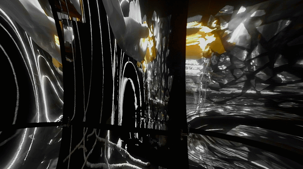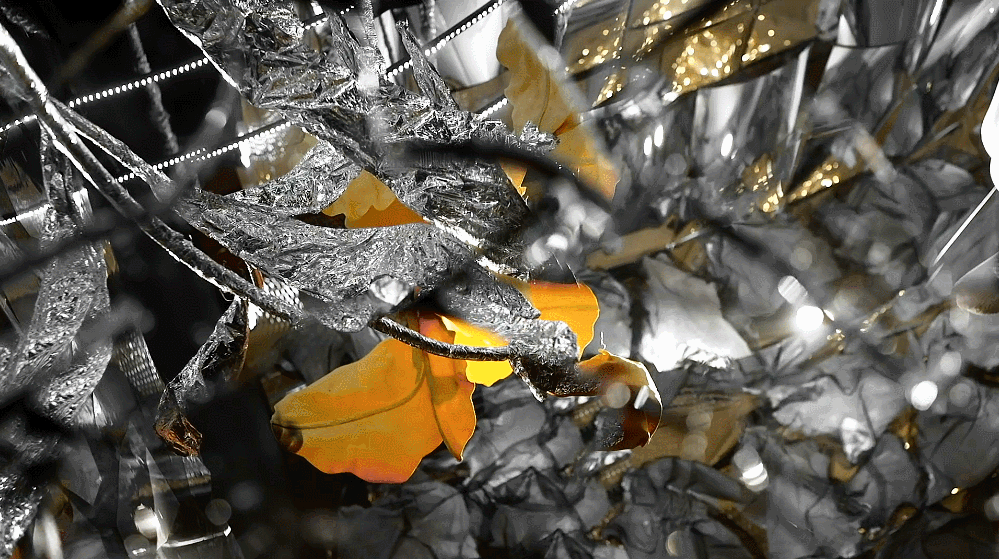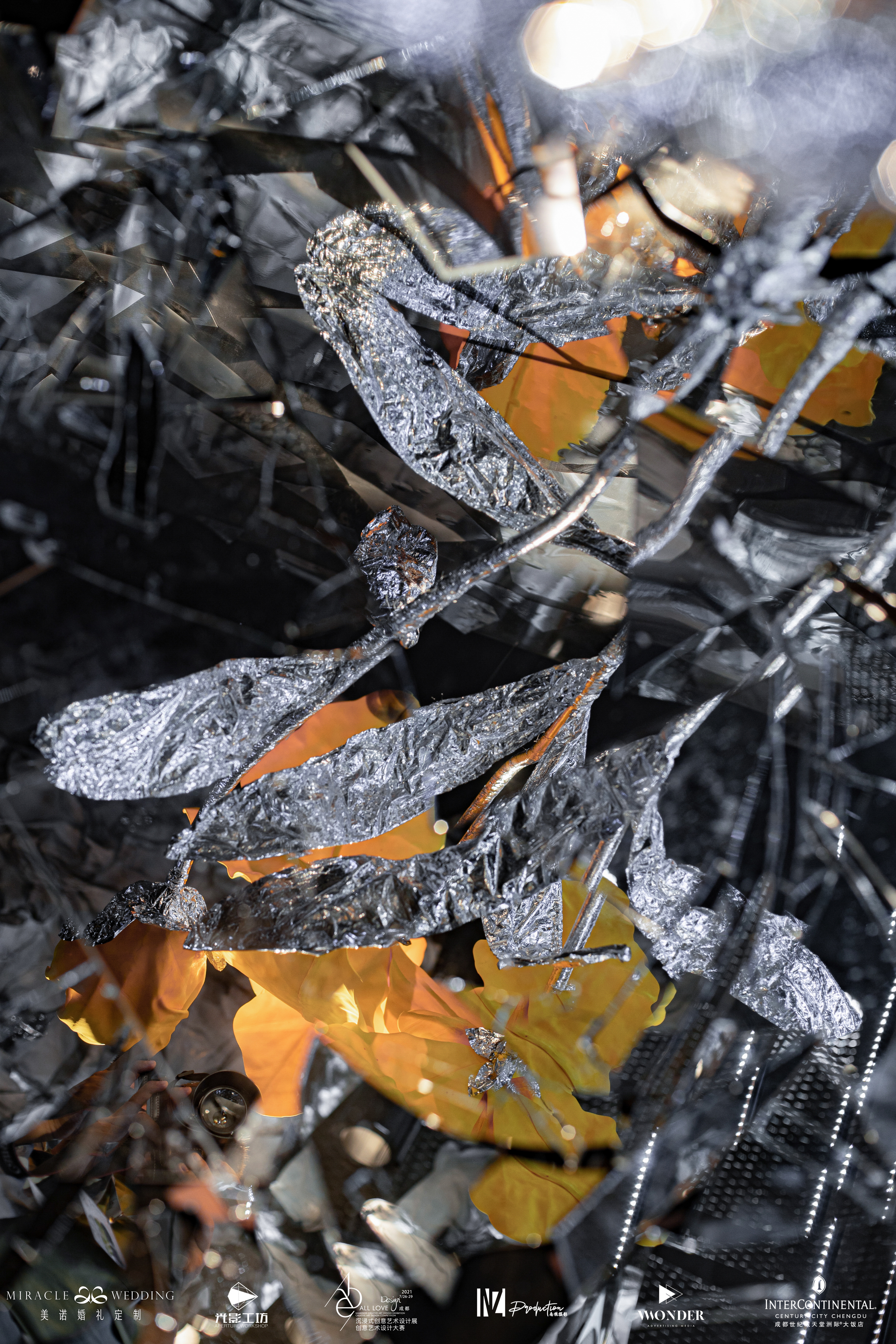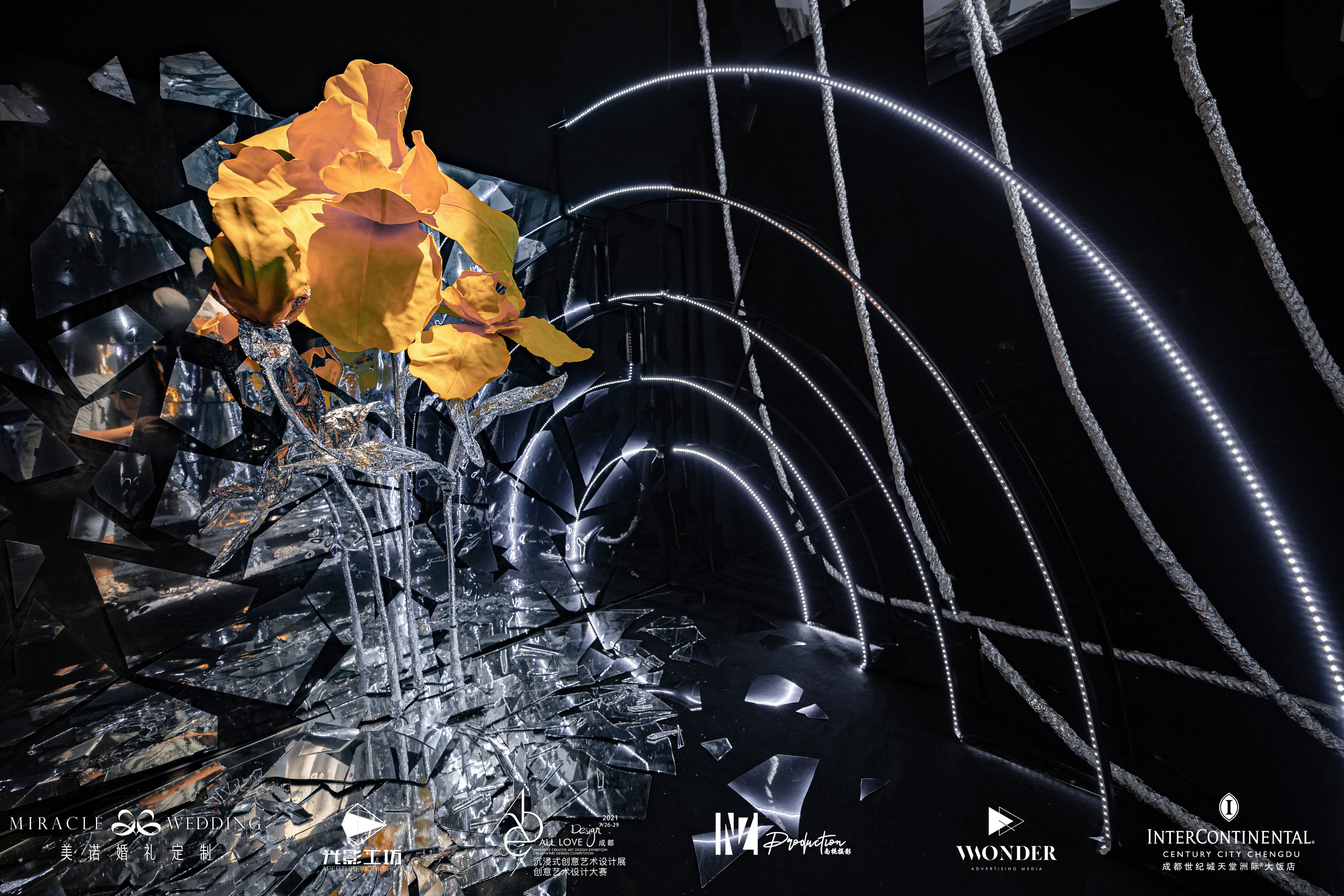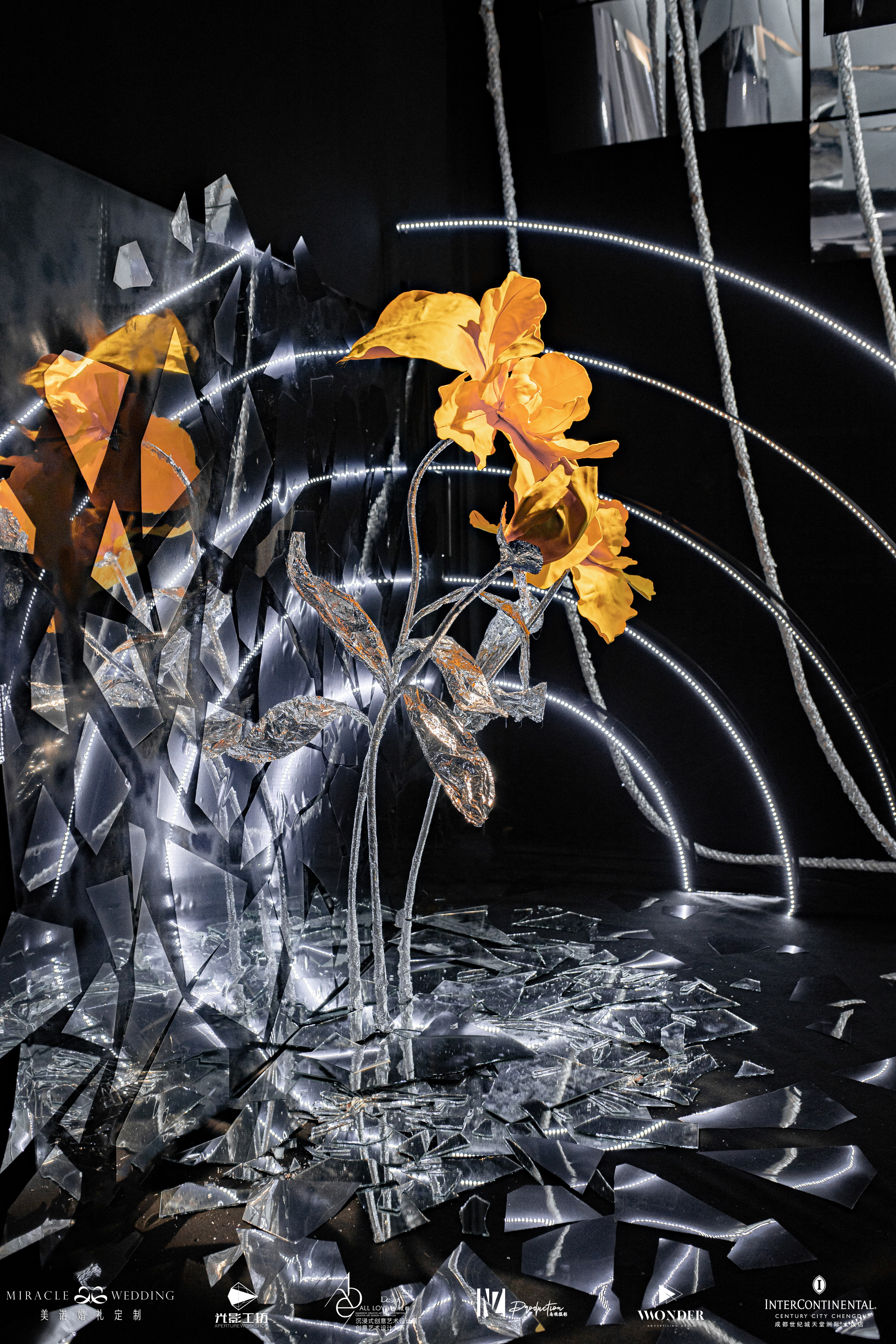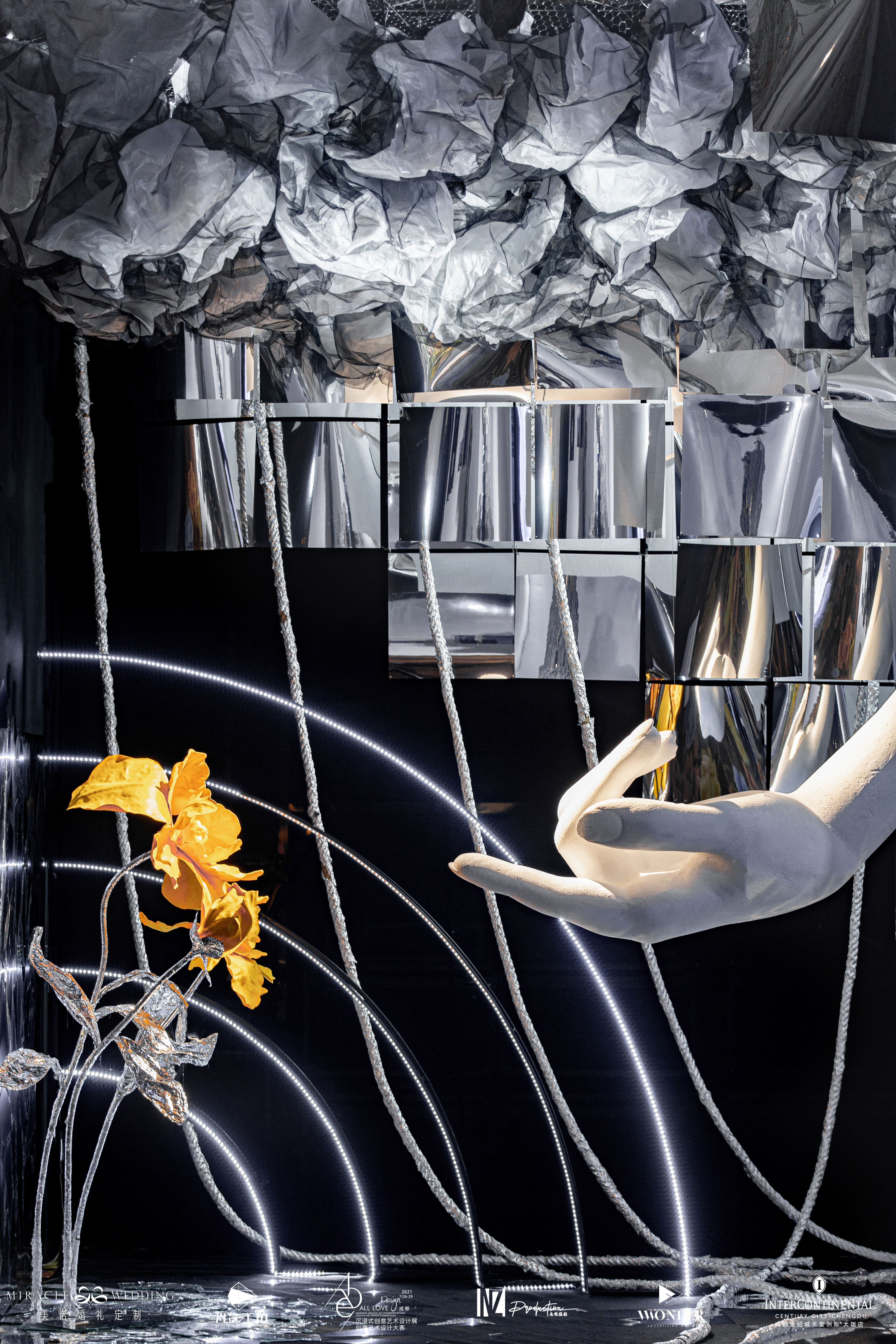在银白色的镜面世界中,破碎的镜子和反射光泽的材质交互搭配焕发神秘细腻的质感,让空间产生虚实丰富的效果,