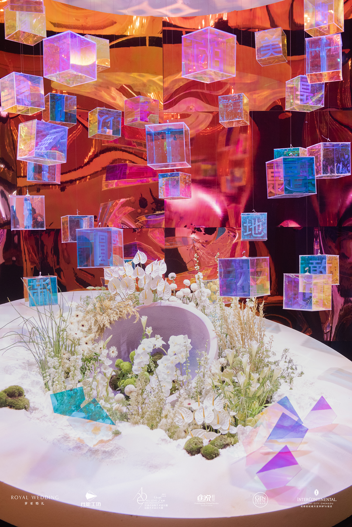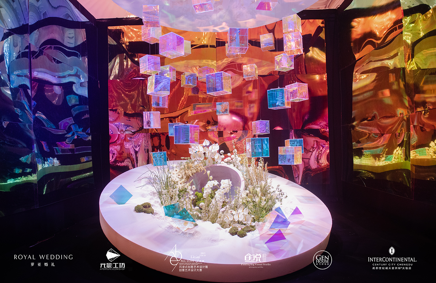 在2021ALL LOVE 致吾爱盛典沉浸式创意设计展中,萝亚婚礼为观众带来了一场炫彩的、迷幻感十足的设计作品——《圆》。
