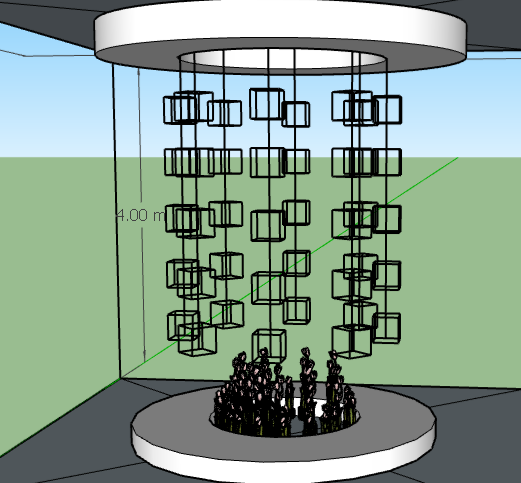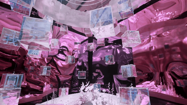 在30㎡的展示空间内,作品以悬于高处的圆顶表征天,以斜倾的下方圆盘来表征地。而在天地之间的多彩物件即表征我们的世界——世界的主体由色彩奇幻的亚克力方盒垂悬连接而成——方盒中包含着结构各异的汉字。