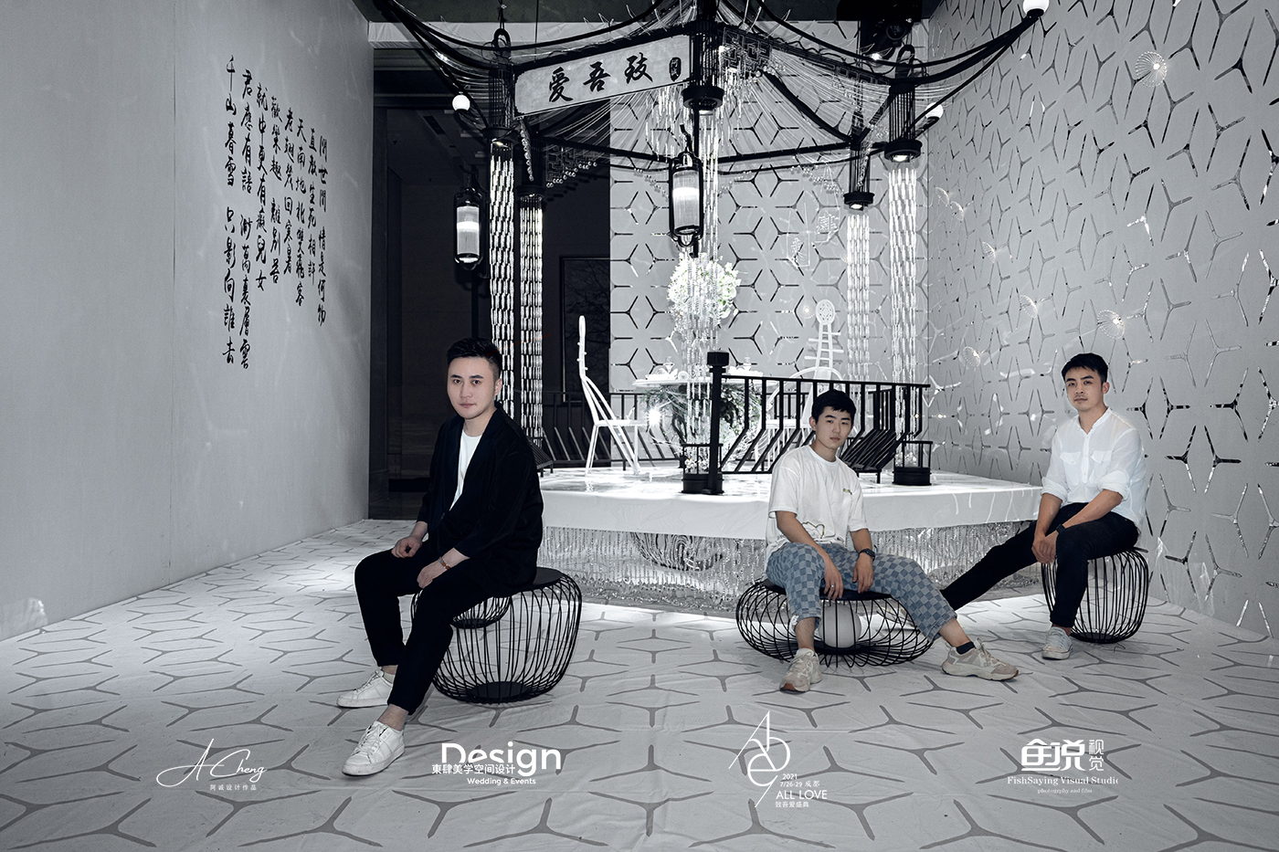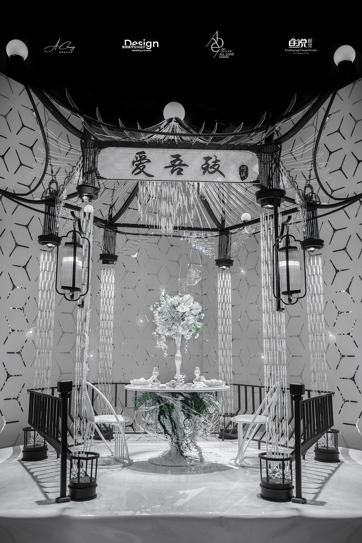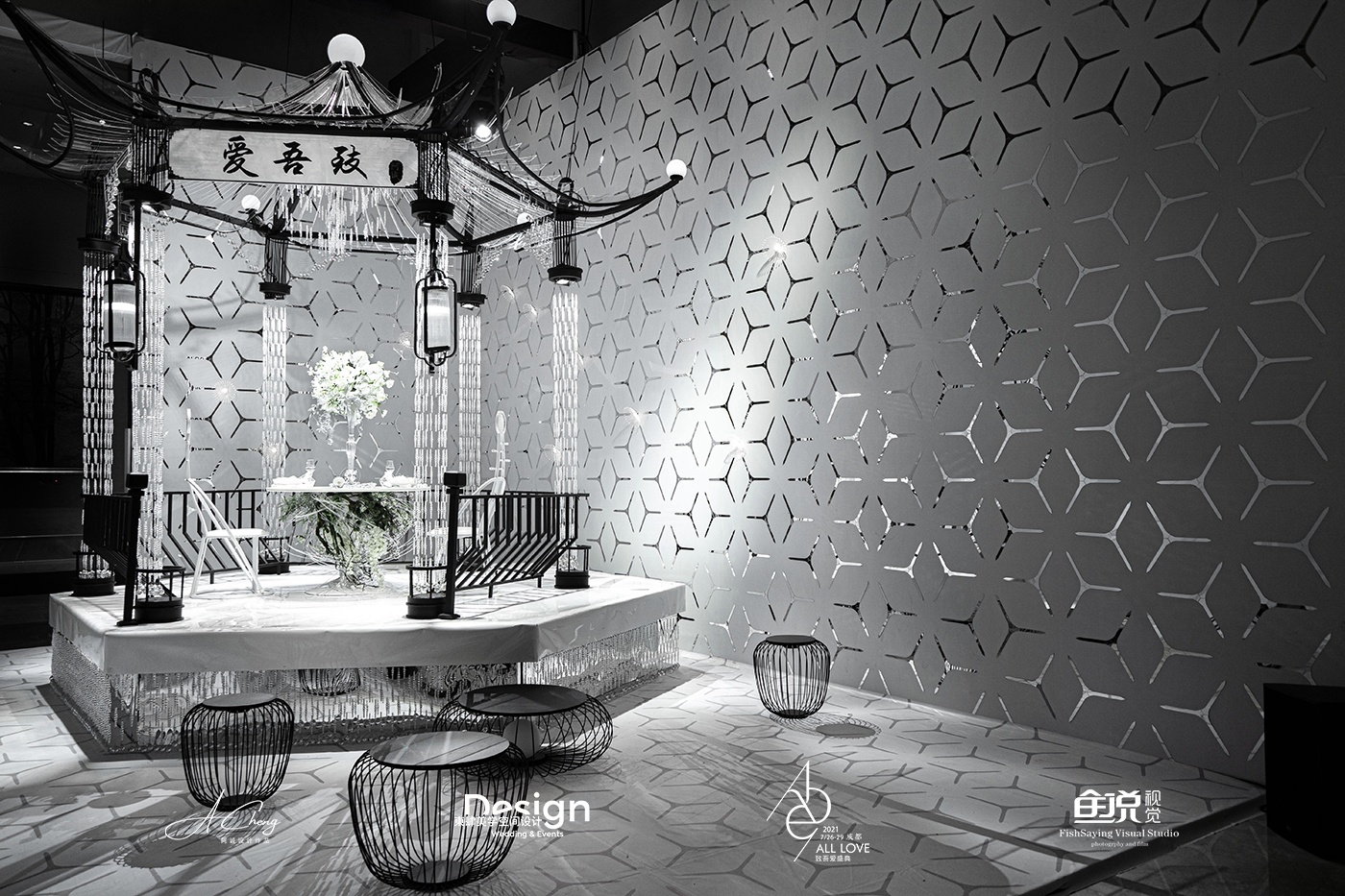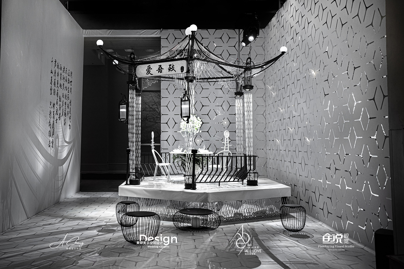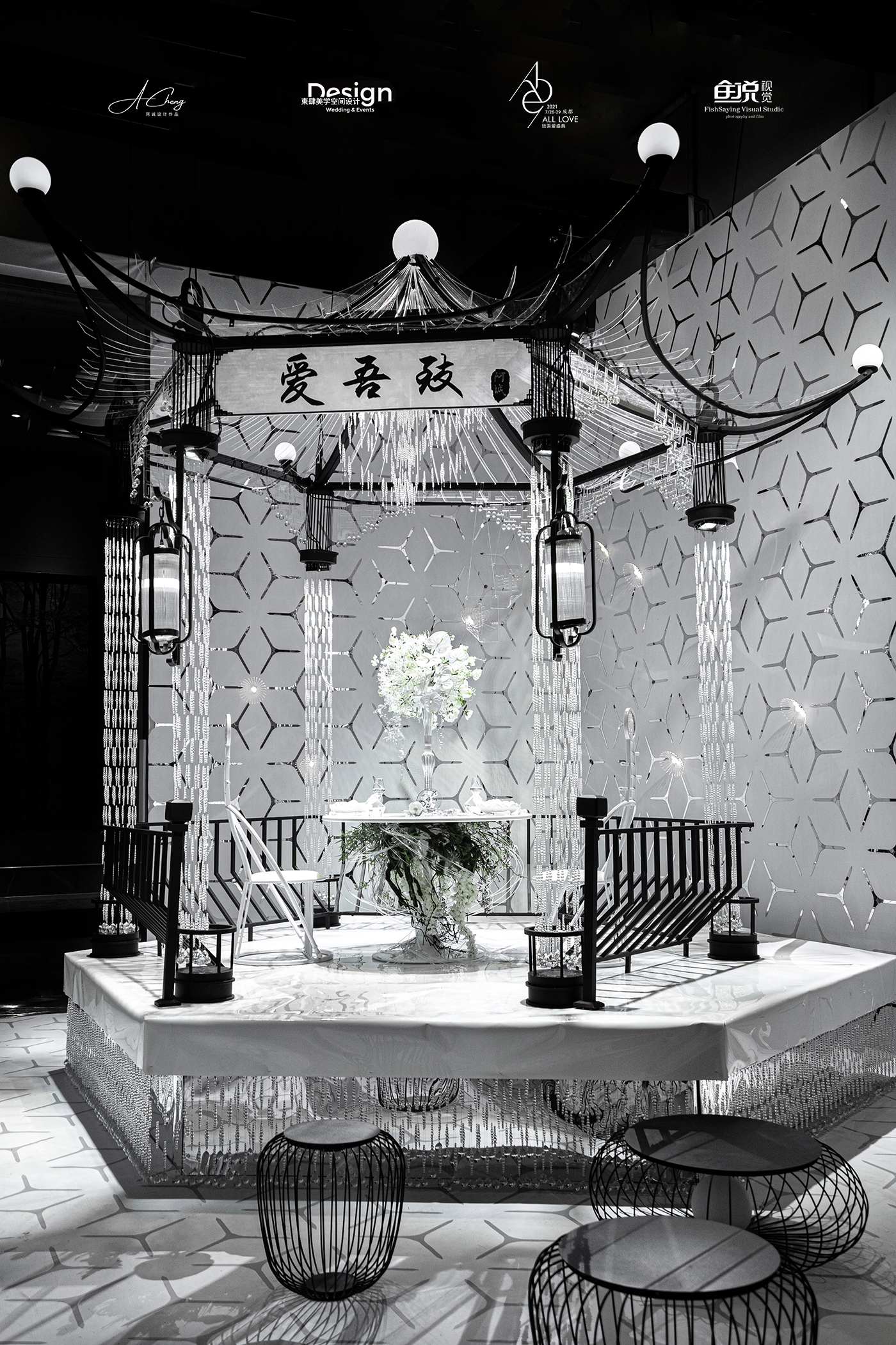 阿诚老师希望通过大胆的元素解构与材质重组,引发关于传统中式、新中式与现代中式风格在婚礼空间设计表达上的区别的思考。