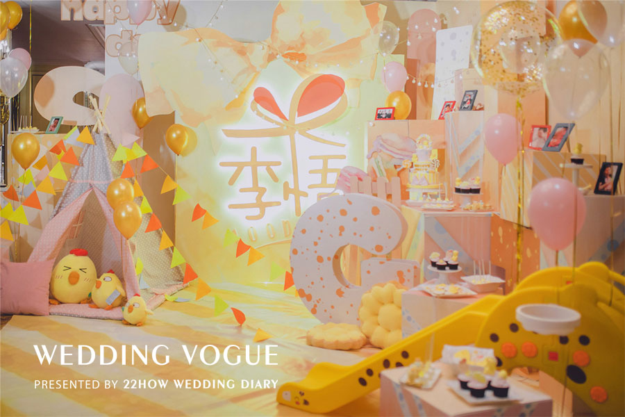 色调选取了与李悟小公主生肖相配的小鸡黄色,黄色的轻快明朗,也正符合宝宝的开朗性格,于是这个炒鸡暖心美好的宝宝宴蓄势待发。迎宾区的设计在于重现一个打开的礼物盒,里面放置了各种各样小朋友都爱到不行的玩乐设施,比如小帐篷、滑滑梯等等。更赞的是,还有各类精美的小甜点。听22HOW的小伙伴反馈,这个地方不仅是大人的合影重灾区,还是小朋友的玩乐天堂。