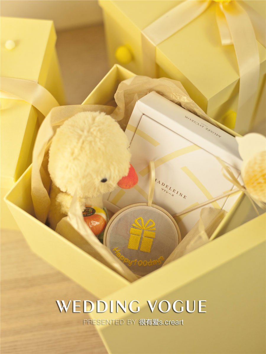 与《礼物》主题一脉相承,很有爱s.creart不仅设计了一气呵成的主题logo,还制作了属于他们的专属“礼物”,一目了然的小鸡黄色作为童话故事里常出现的礼物盒,细节点缀毛绒绒的小毛球。打开惊喜盒子,有深受小朋友喜欢的可爱小黄鸡,有可以给家长留纪念的精致主题绣盘,更有暖意满满的小点心。当然,还有“棒棒糖”的即视感的童趣答谢卡......一整套的《礼物》真是让人幸福感爆棚。