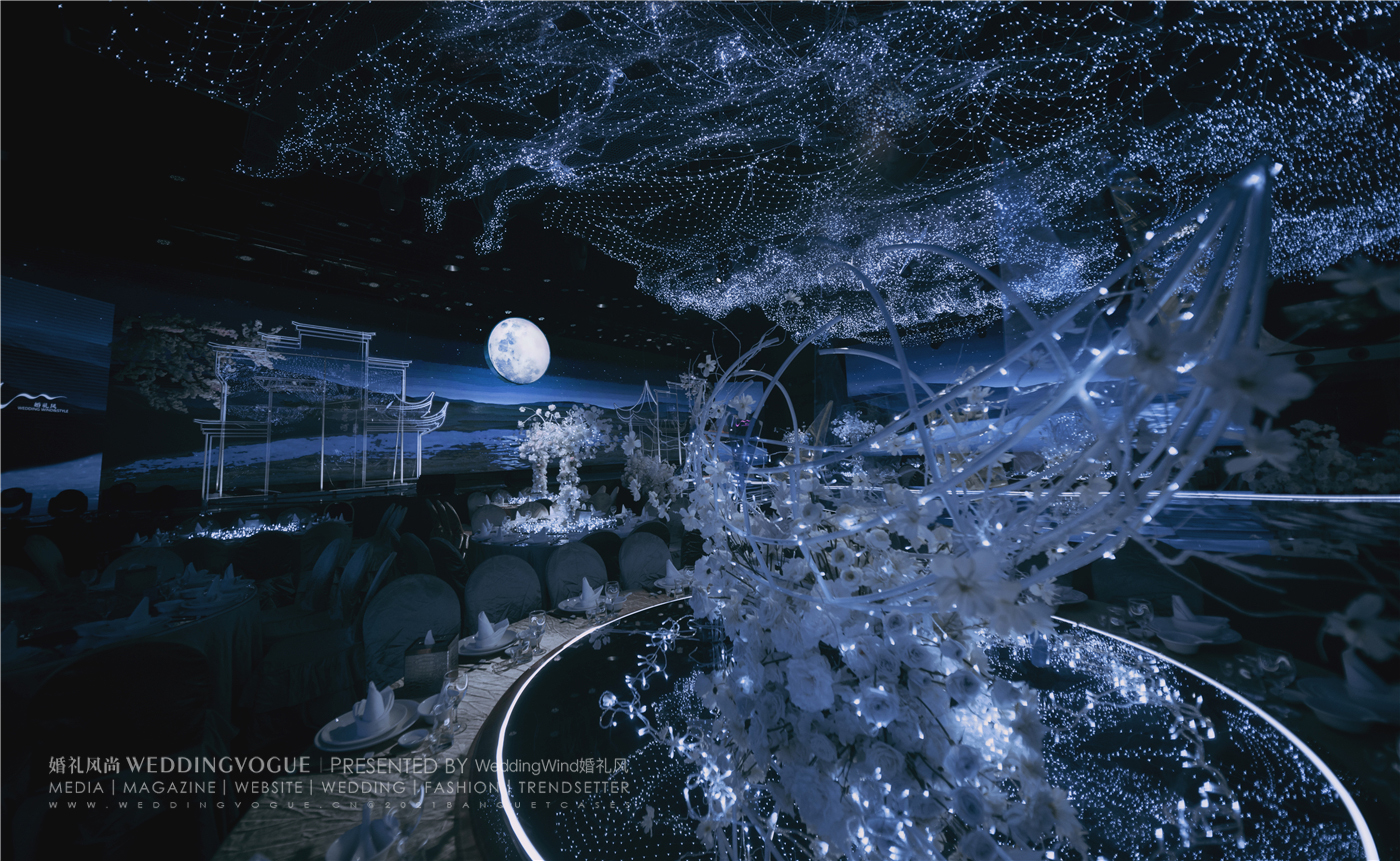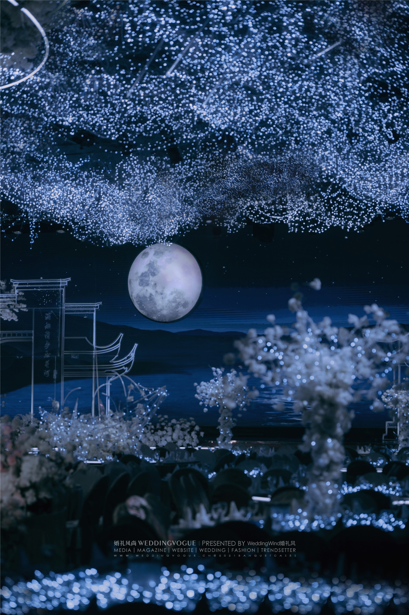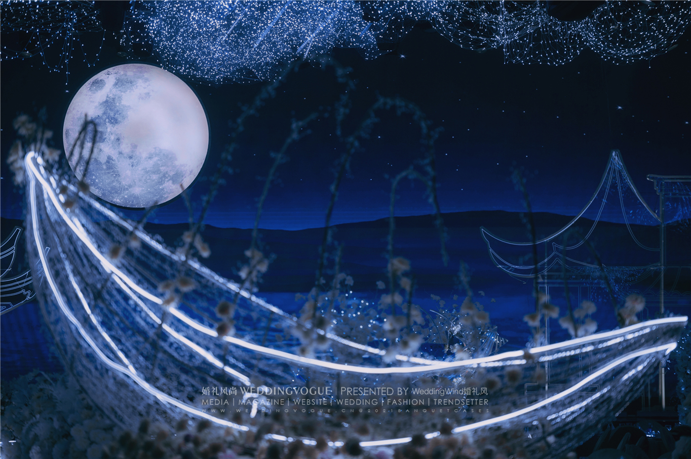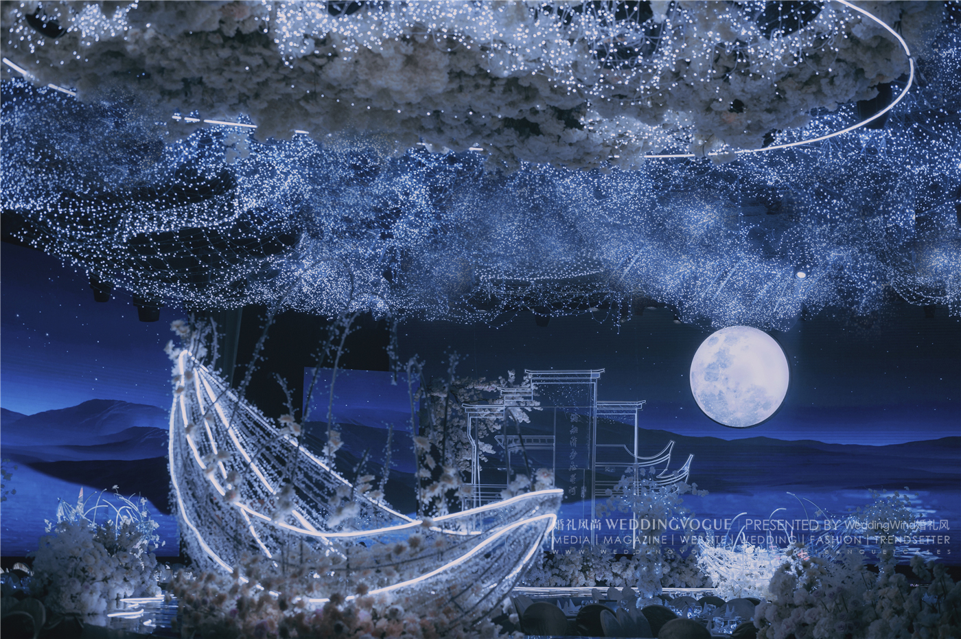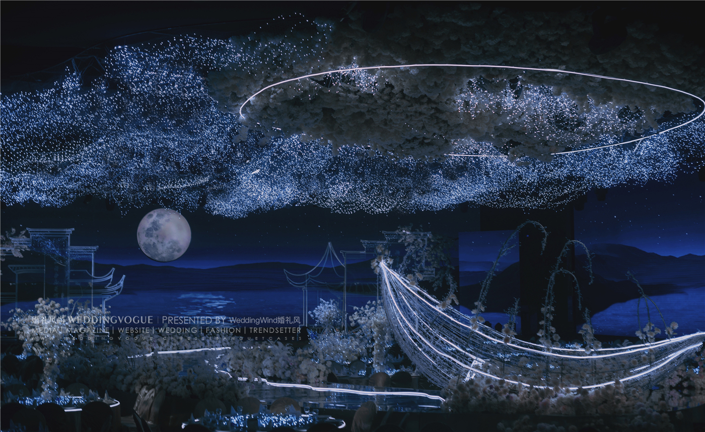 而最让设计师张球Wynne.Z为之心动的,是有着“孤偏盖全唐”美誉、唐代诗人张若虚笔下的《春江花月夜》,其夐绝的宇宙意识和绝美的诗意画境最为符合设计师对“有圆月、有清江、有扁舟”的婚礼的想象。