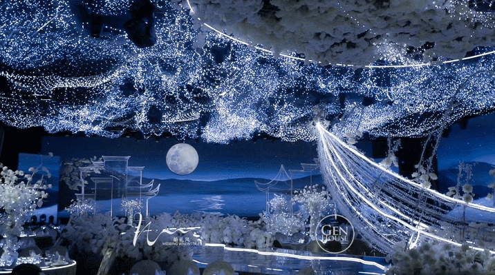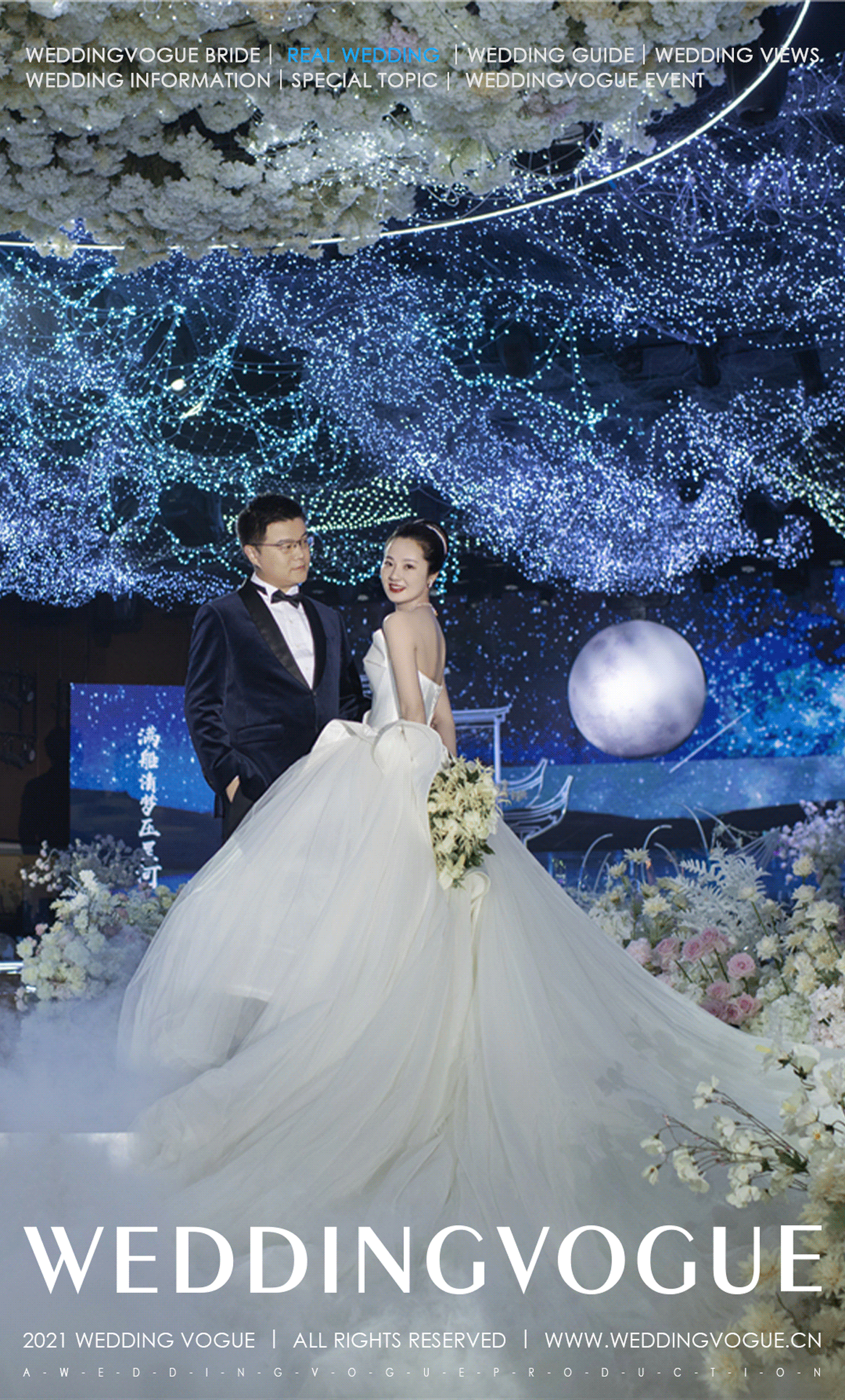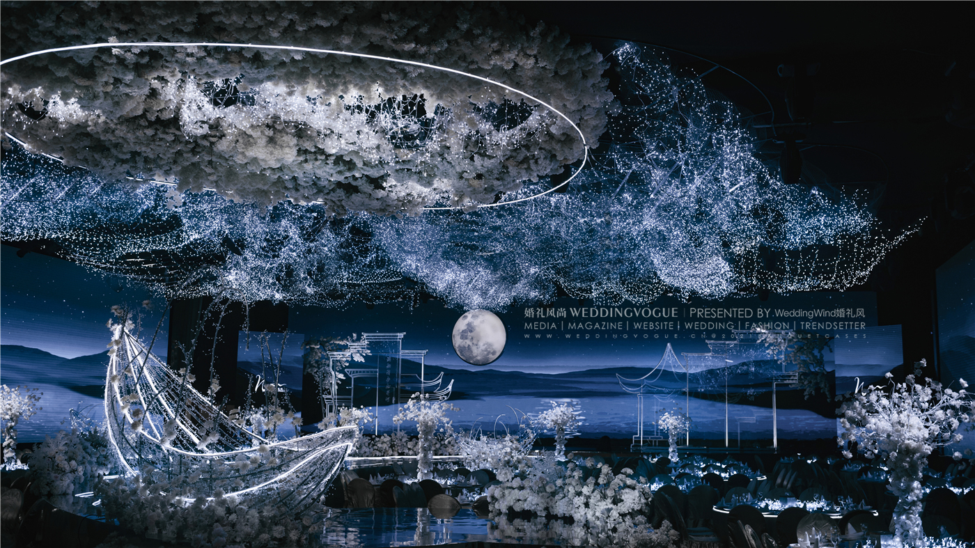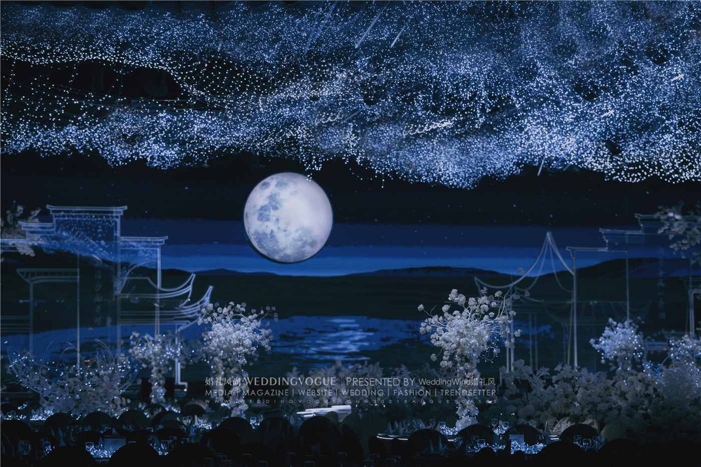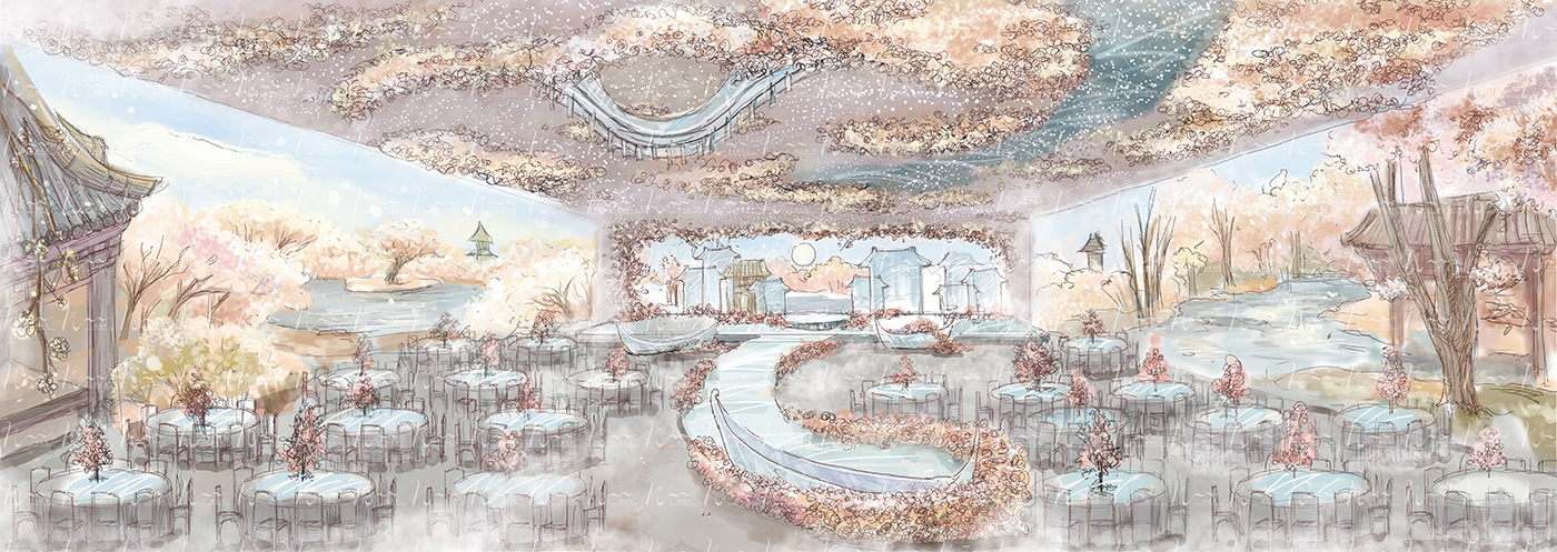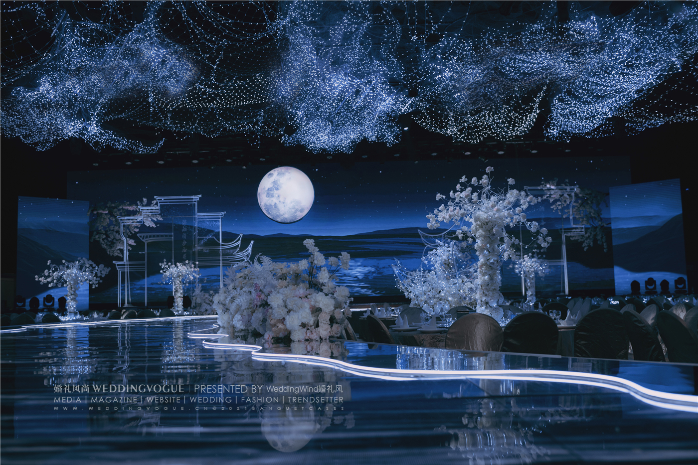 而最让设计师张球Wynne.Z为之心动的,是有着“孤偏盖全唐”美誉、唐代诗人张若虚笔下的《春江花月夜》,其夐绝的宇宙意识和绝美的诗意画境最为符合设计师对“有圆月、有清江、有扁舟”的婚礼的想象。