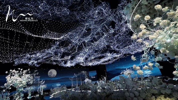 WeddingWind婚礼风团队把婚礼的主题定为“春江花月夜”,依托多媒体设备重磅呈现「春江花月夜」、「满船清梦压星河」、「桃李春风一杯酒」三大场景: