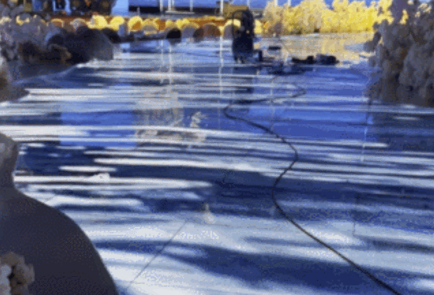 WeddingWind婚礼风精心制作4K高清水纹视频,当新郎新娘走在地屏铺设的走廊上,脚下是潺潺流动的江水。