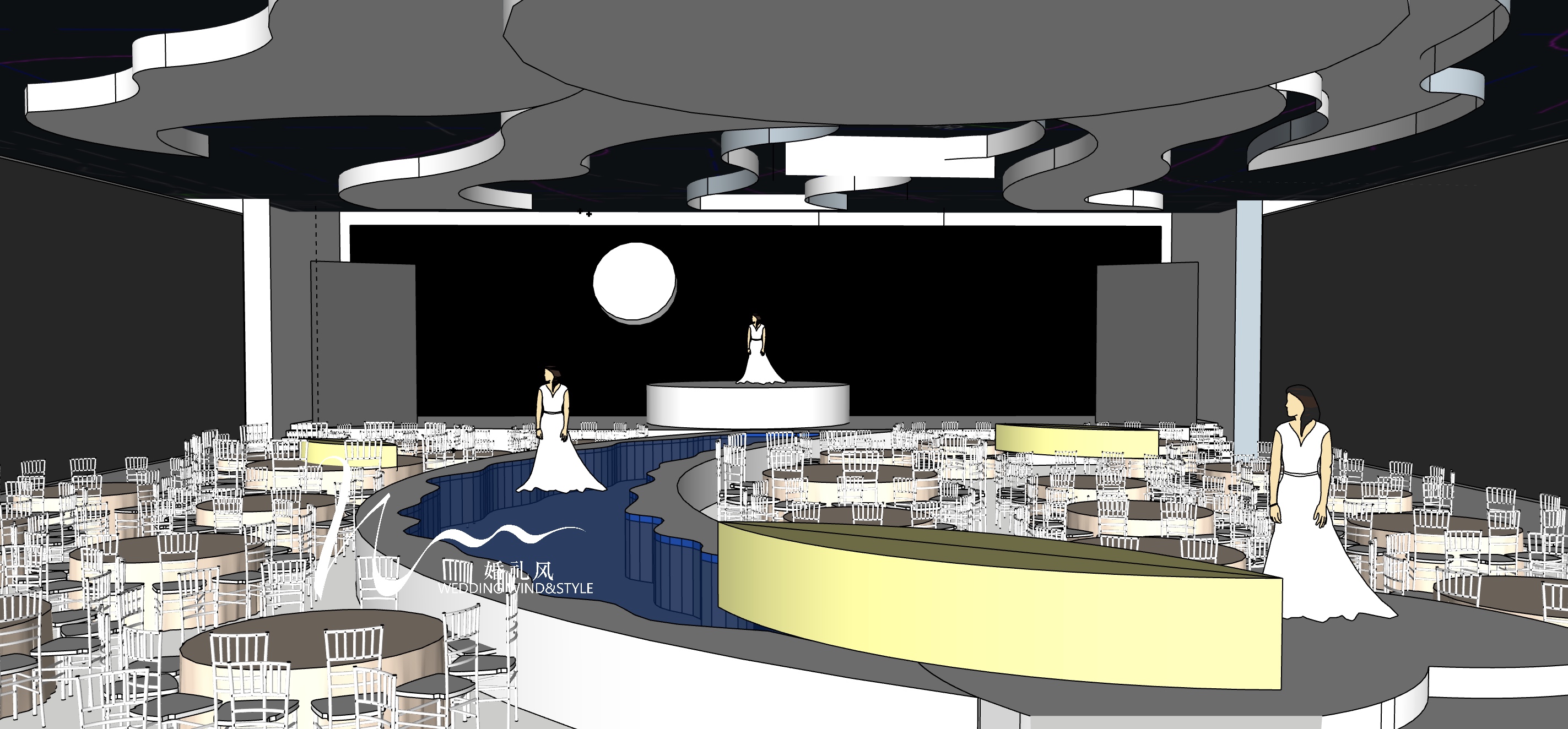而这一次,因为场地的原有硬件设施,WeddingWind婚礼风团队决定用话剧式的表现手法来把控“没有主持人”的现场,同时大胆使用多媒体视效,打造出一场具有东方意境的270°沉浸式诗幕剧婚礼。