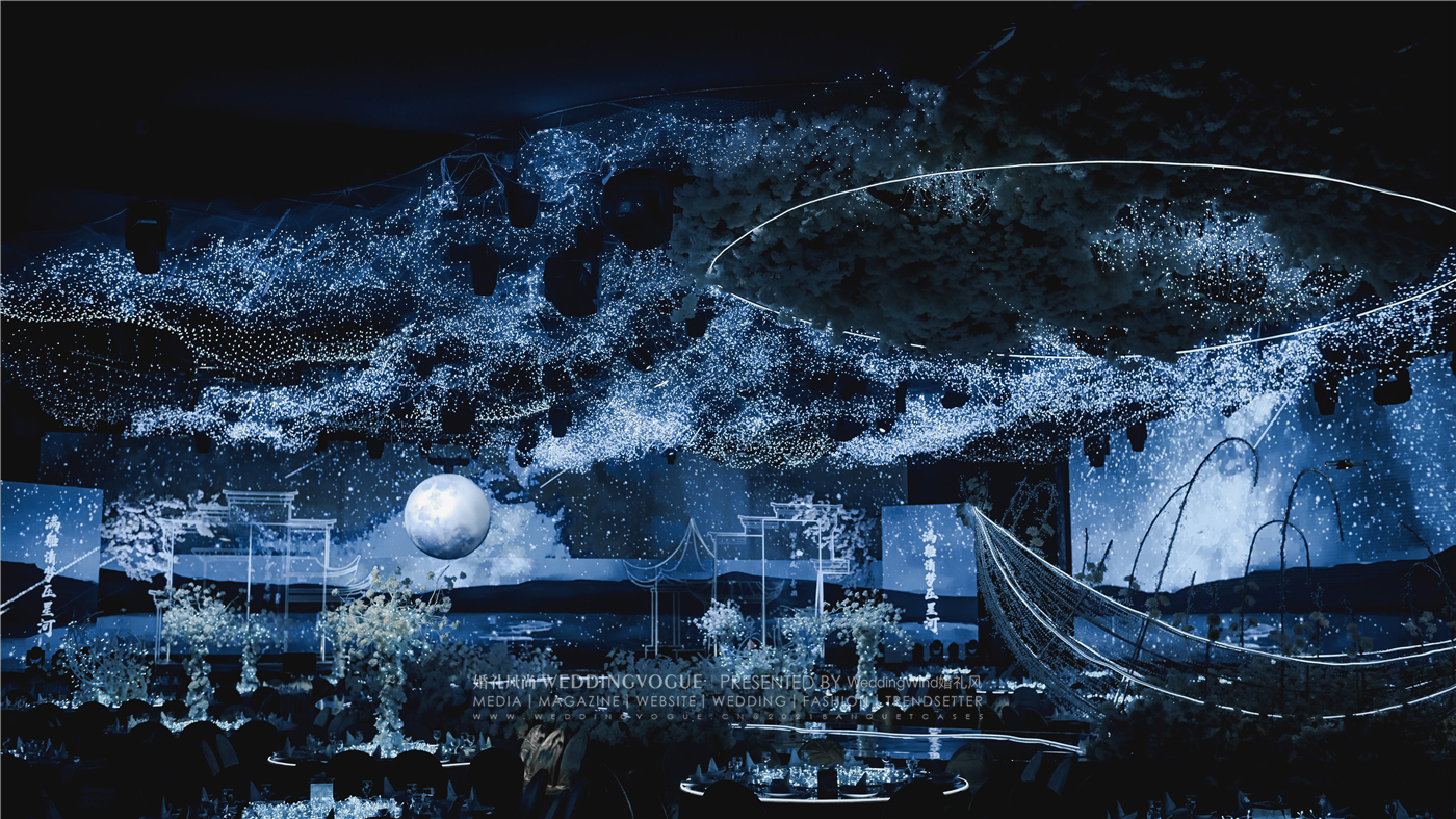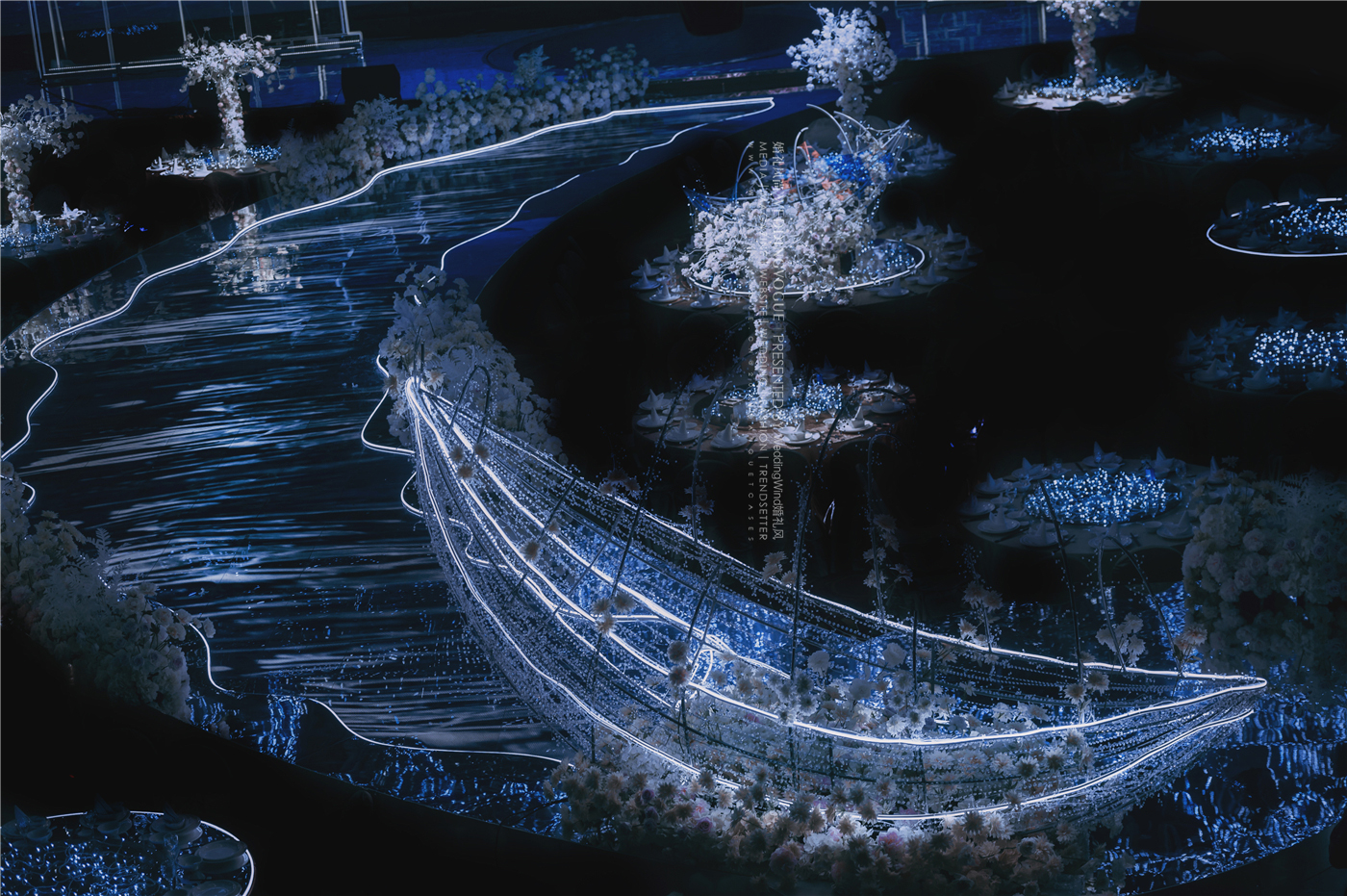 桌面采用了镜面的设计,铺满了星星灯装置,隐含江面对于星空的投映,如同倒置的星河。走入婚礼现场的每个人,都像是遁入了一片满船清梦压星河的情景之中。