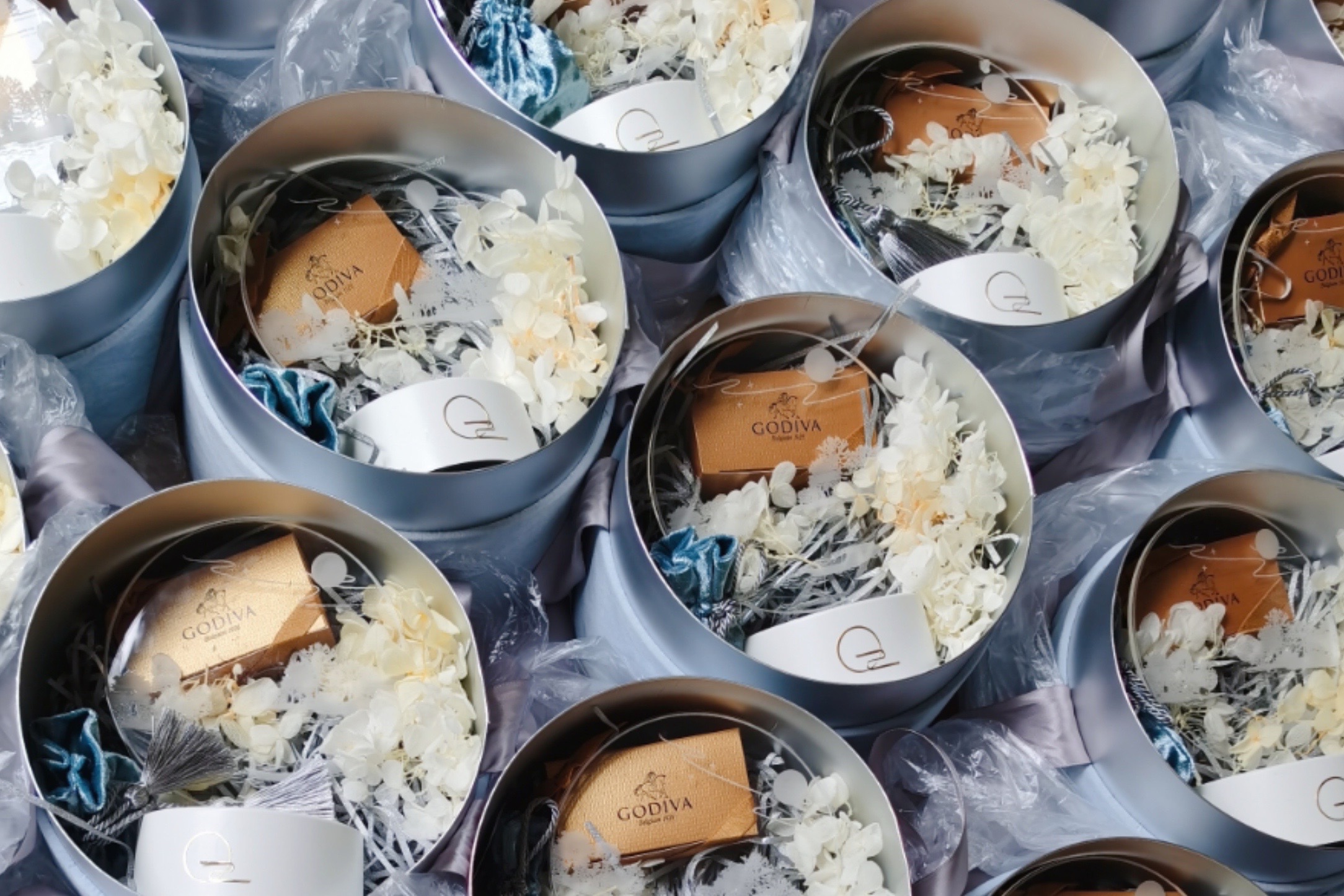 婚礼logo被应用在送给宾客的伴手礼和回礼“春江花月夜”小夜灯中,将「春江花月夜」的浪漫意境分享给所有有爱的宾客们。