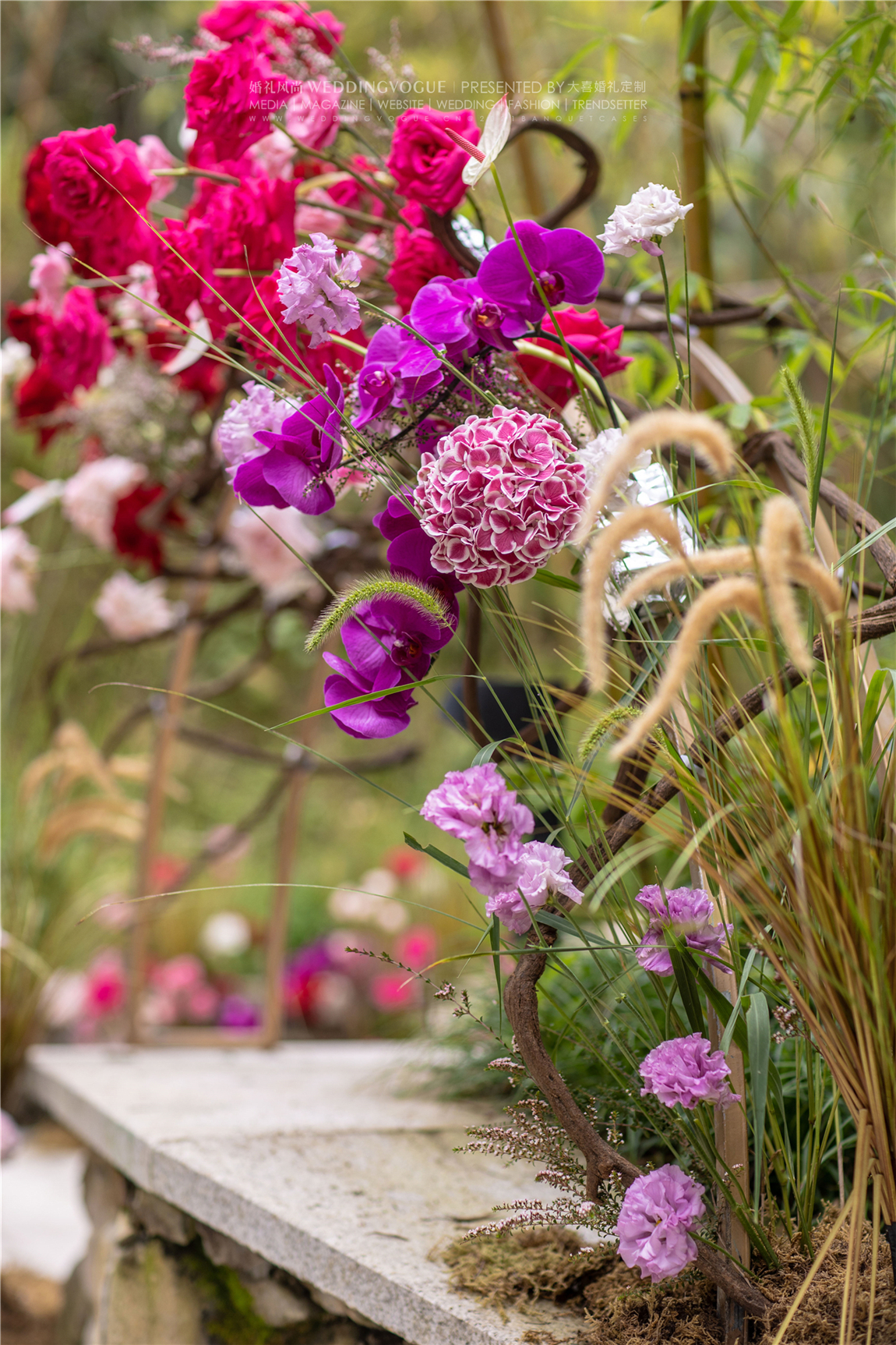 拥有一朵永不凋零的花,就像随时赴一场和春天的约会。回归自然,热烈缤纷的色彩与天然的户外场景相融合,大喜婚礼定制把婚礼打造成一场天然的艺术展。