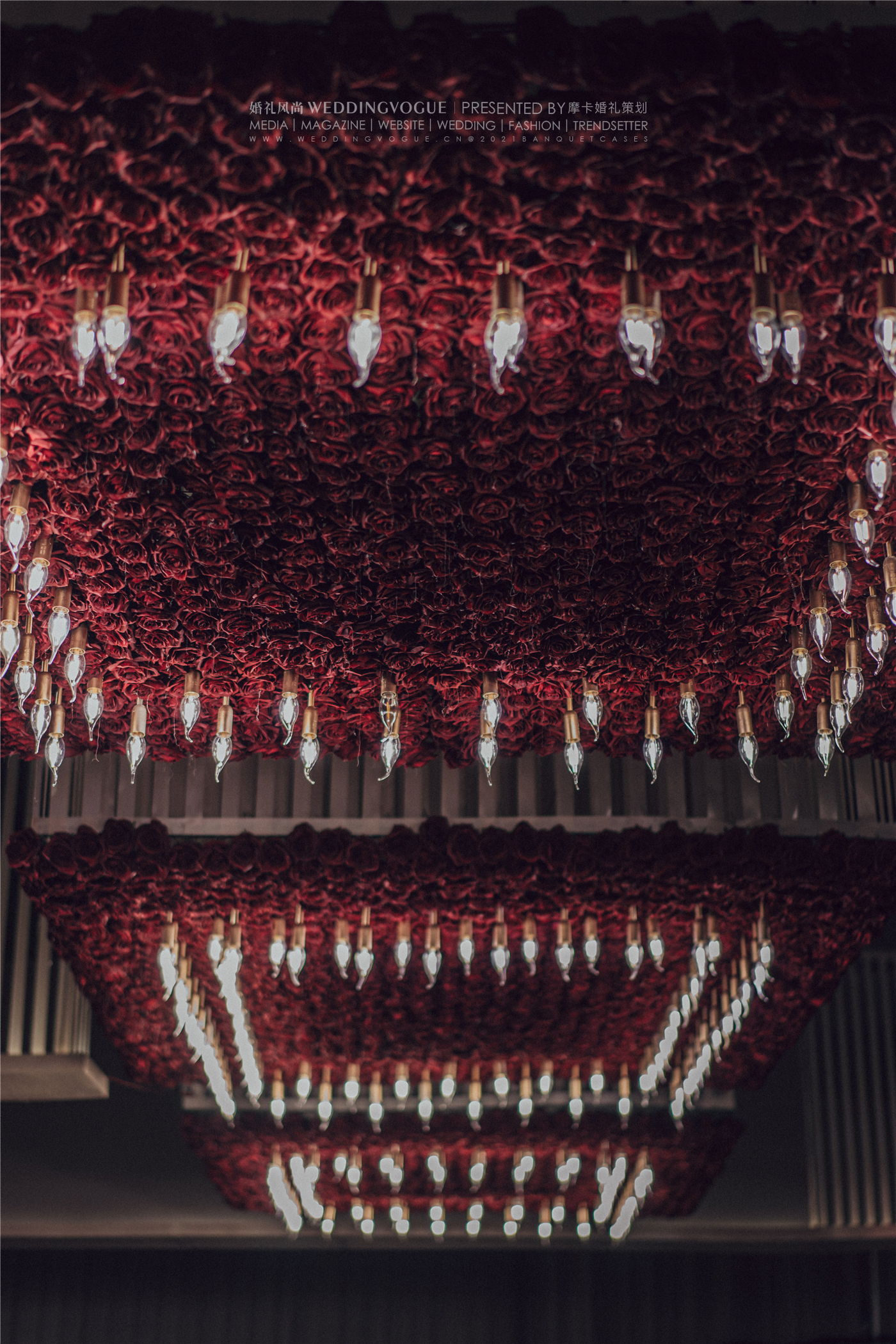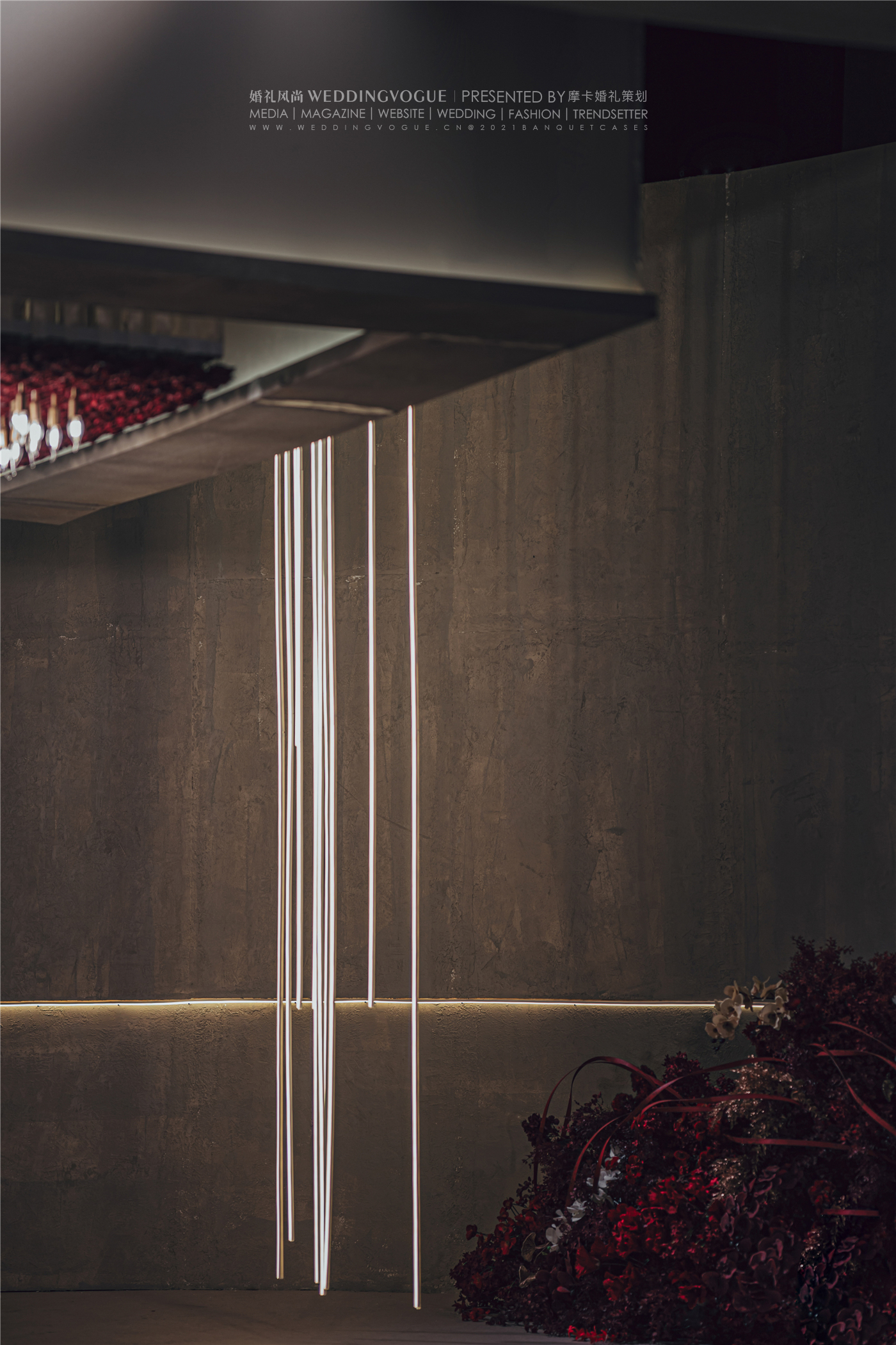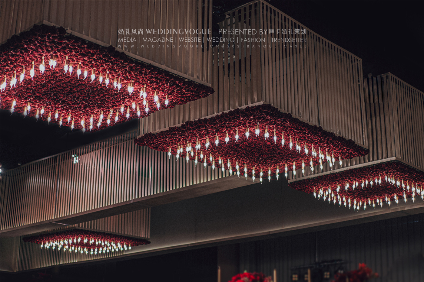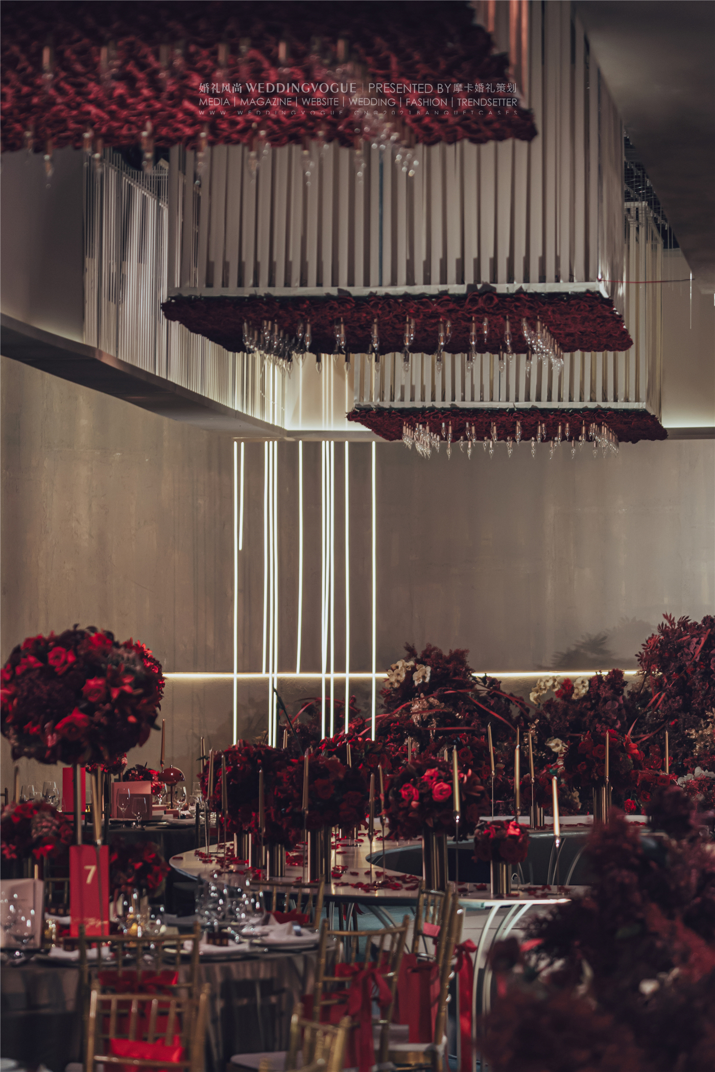 仪式区吊顶以有序且极具层次感的矩形装置为主,充满现代建筑的设计感。中间鲜艳盈满的红色花艺与蜡烛灯光,强调了对于“家”的定义,也让浪漫渗透了整场婚礼。