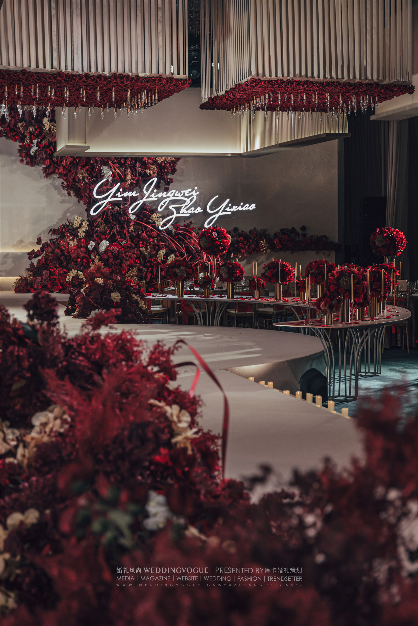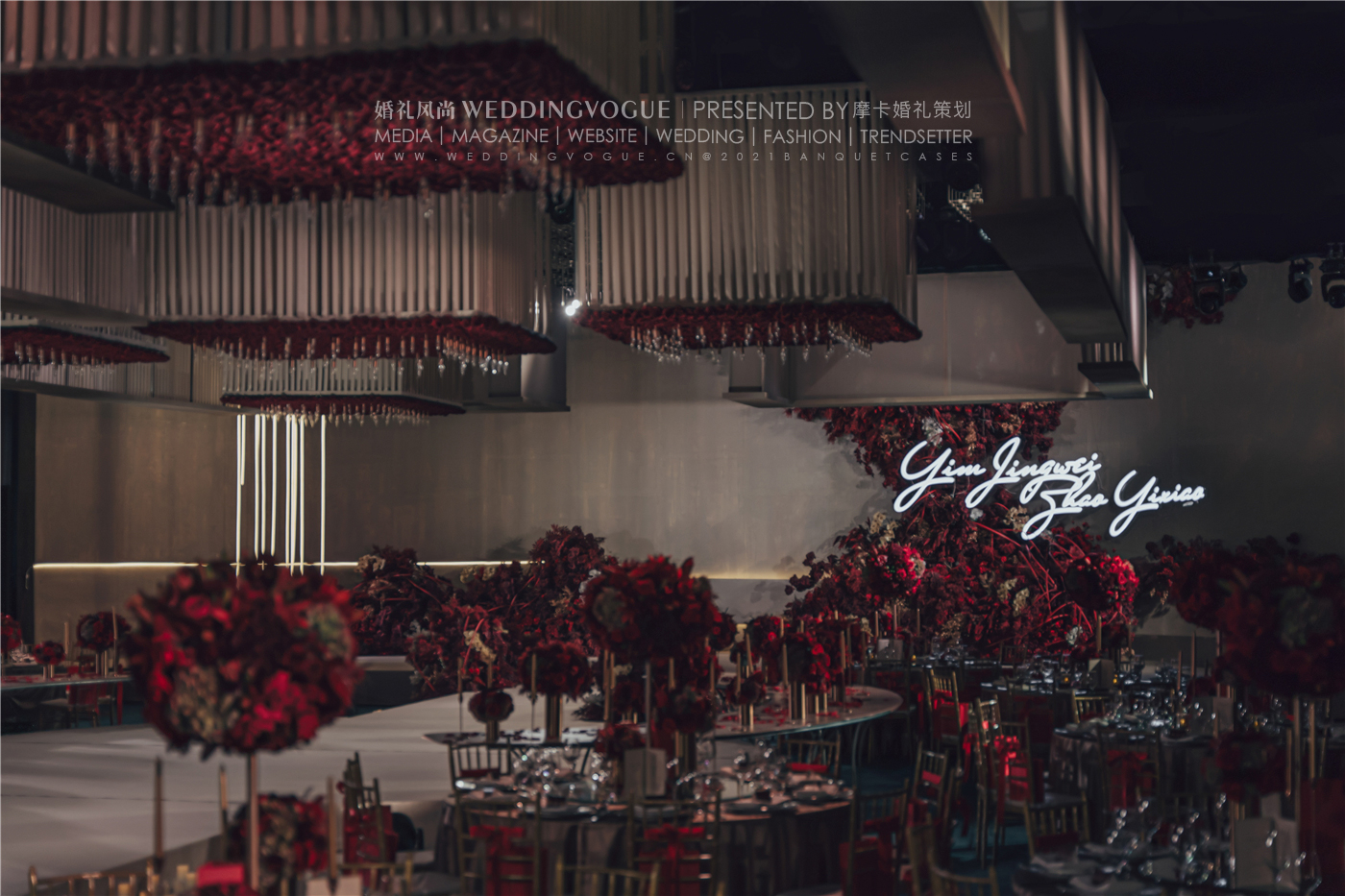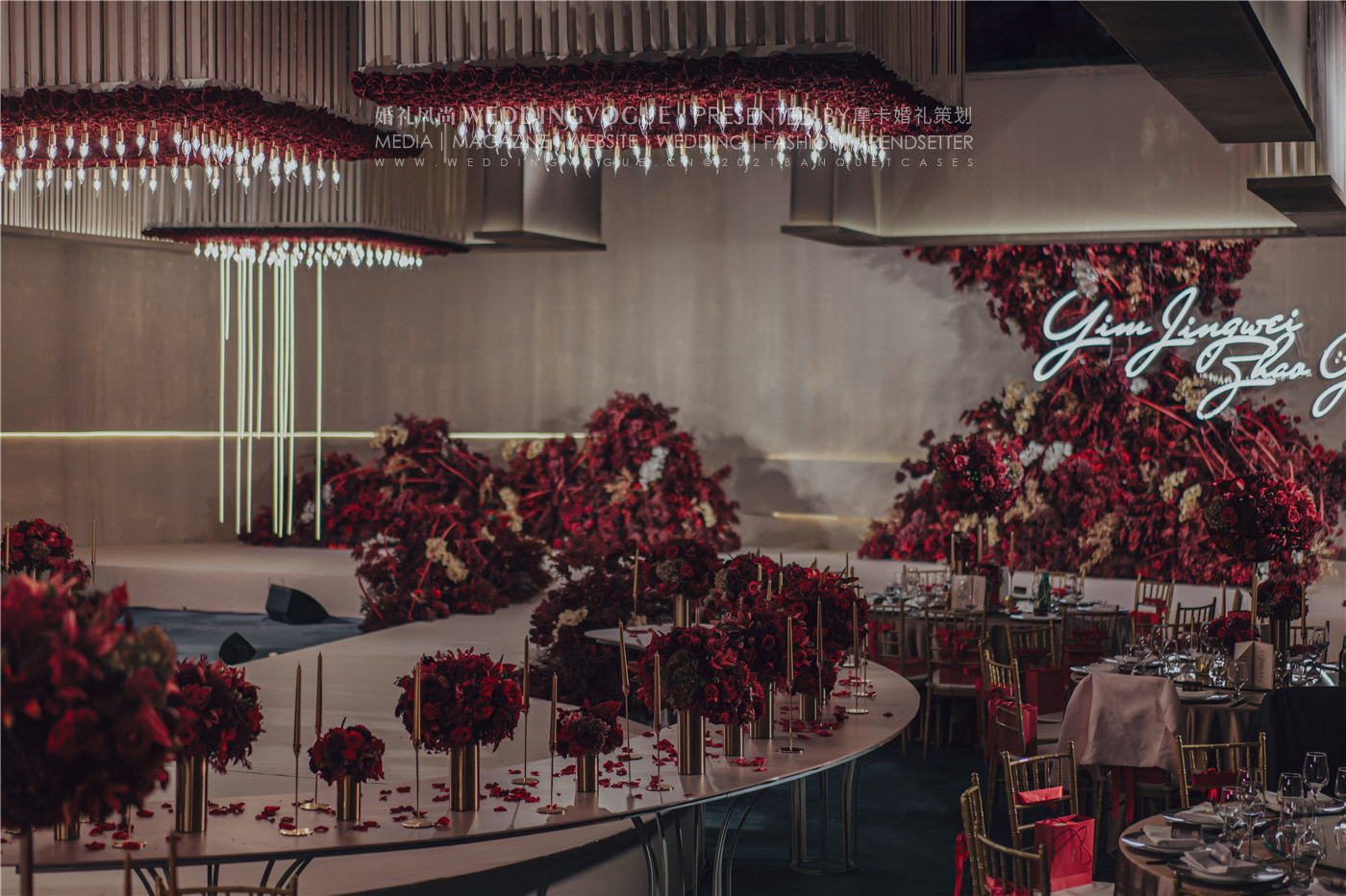 仪式区吊顶以有序且极具层次感的矩形装置为主,充满现代建筑的设计感。中间鲜艳盈满的红色花艺与蜡烛灯光,强调了对于“家”的定义,也让浪漫渗透了整场婚礼。