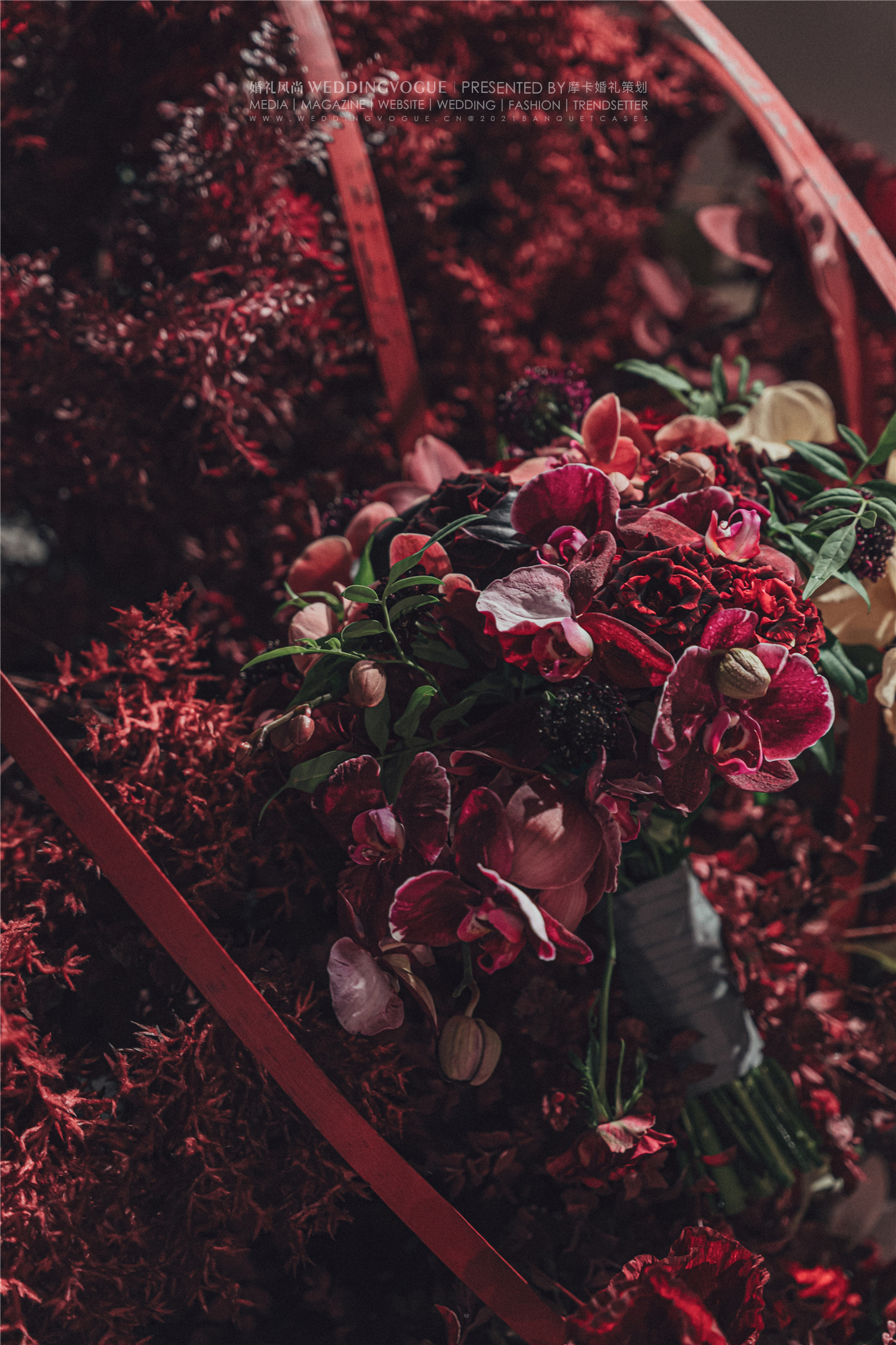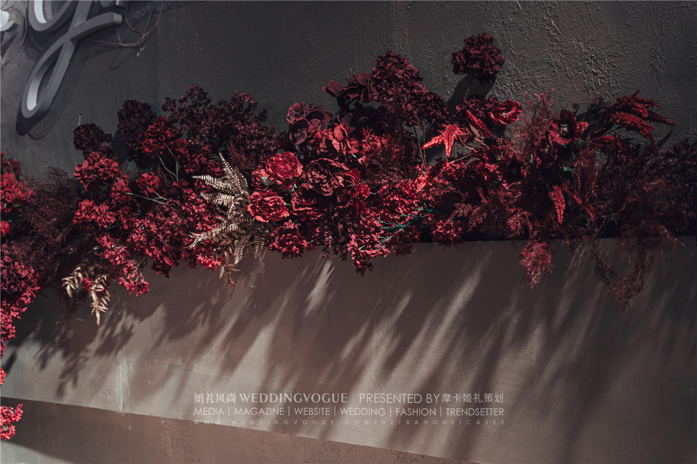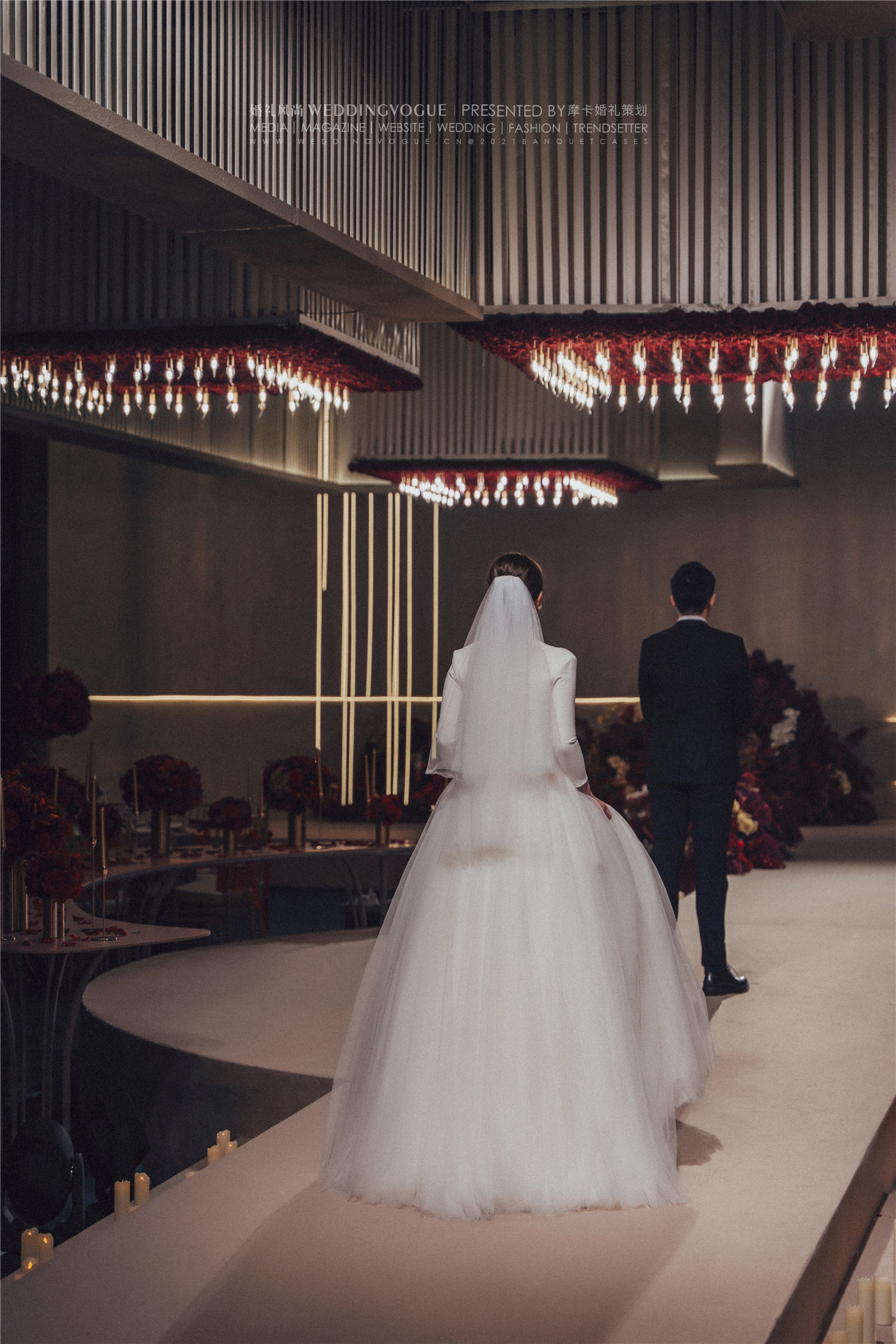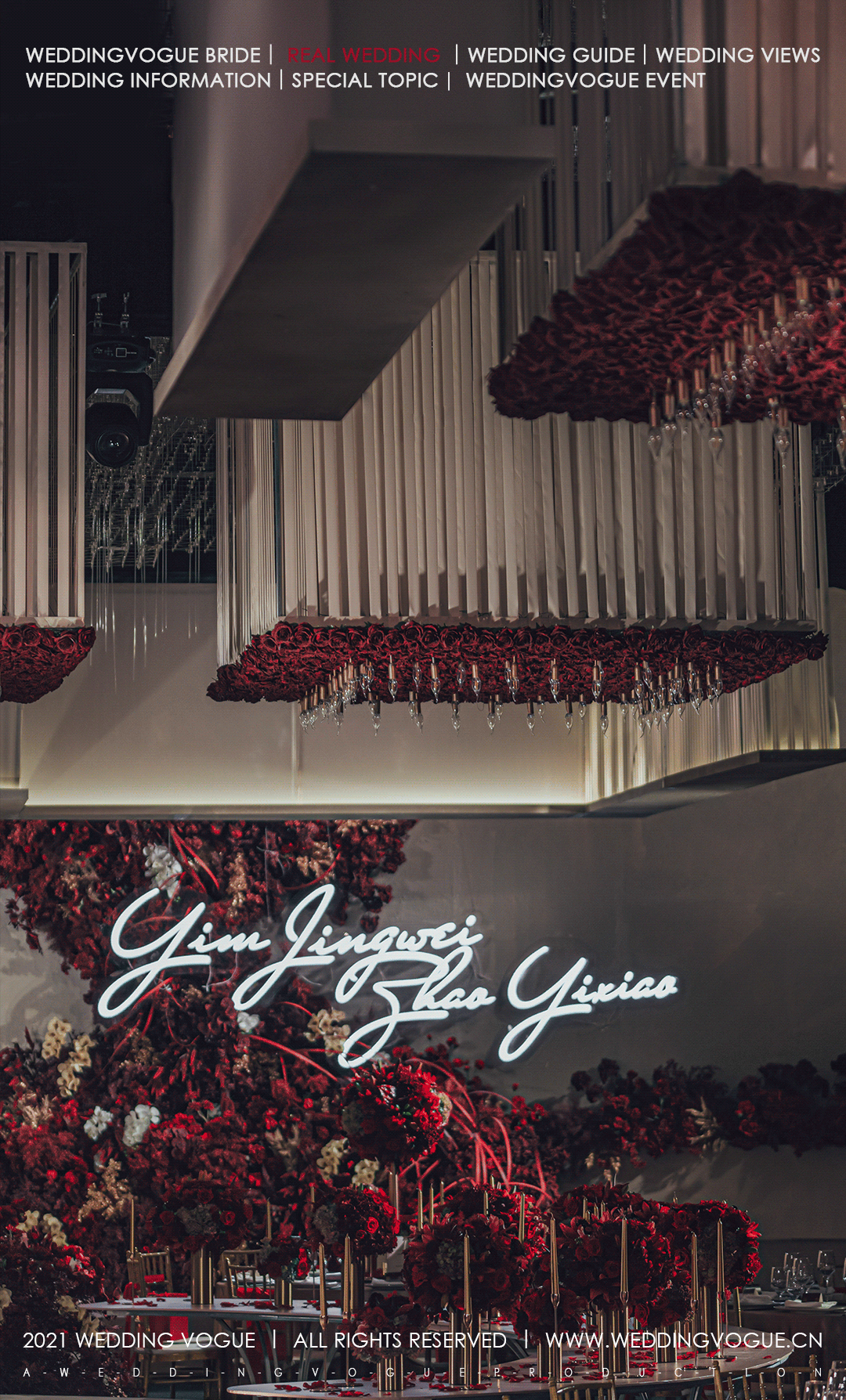 仪式区吊顶以有序且极具层次感的矩形装置为主,充满现代建筑的设计感。中间鲜艳盈满的红色花艺与蜡烛灯光,强调了对于“家”的定义,也让浪漫渗透了整场婚礼。