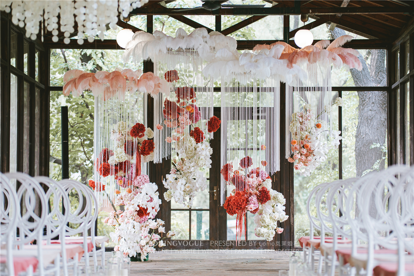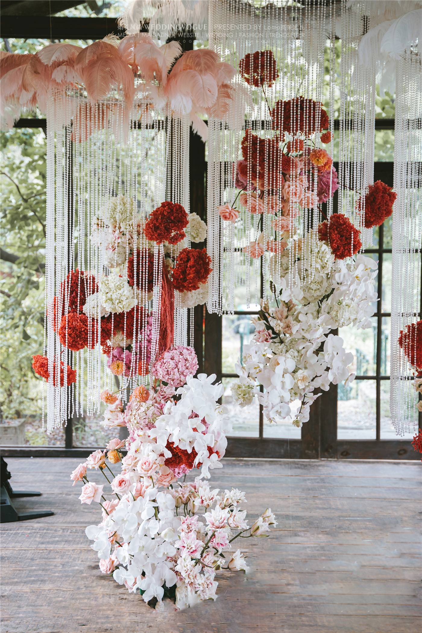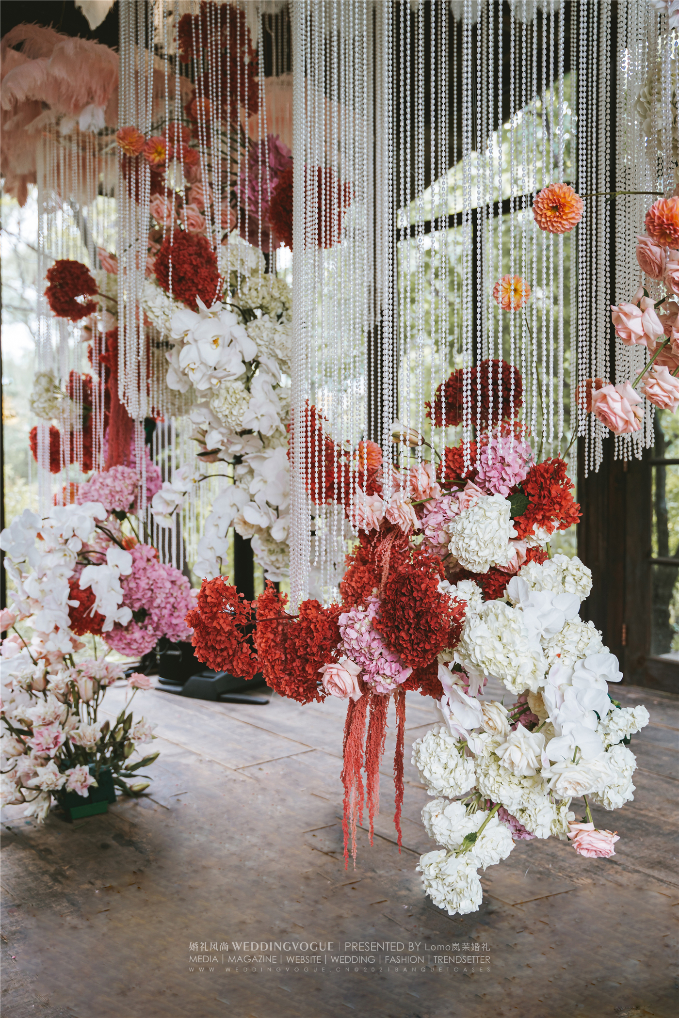 花朵成组成团地绽放,具有少女感的白色粉色系花艺中,有了红色花朵的点缀,使得婚礼现场在复古的同时又增添了许多时髦感~