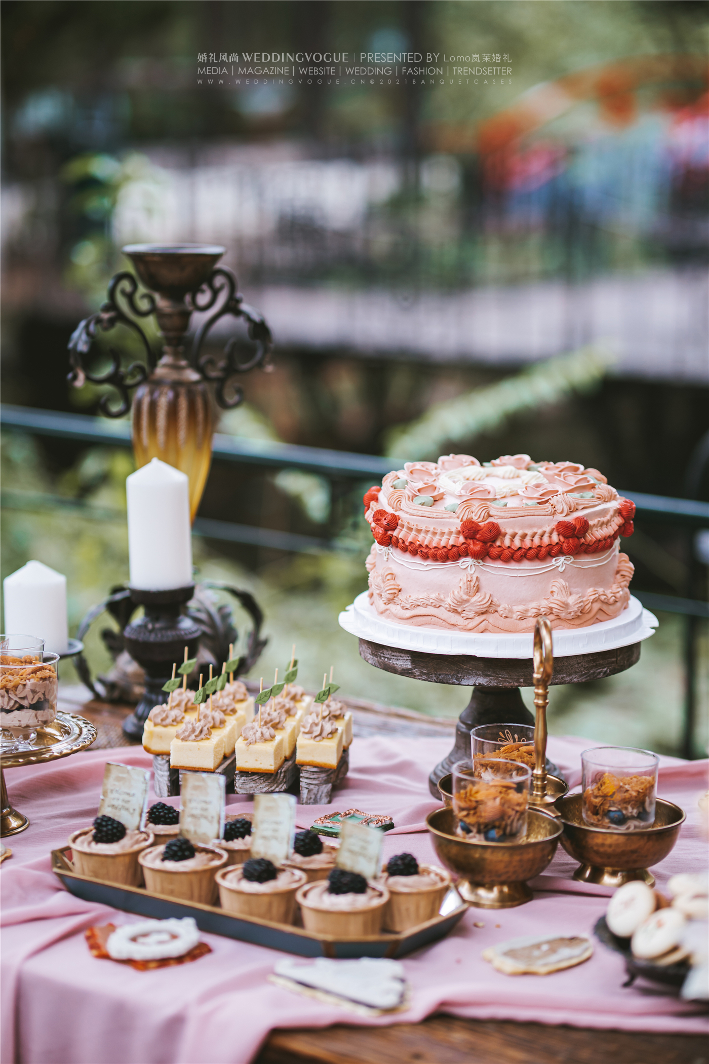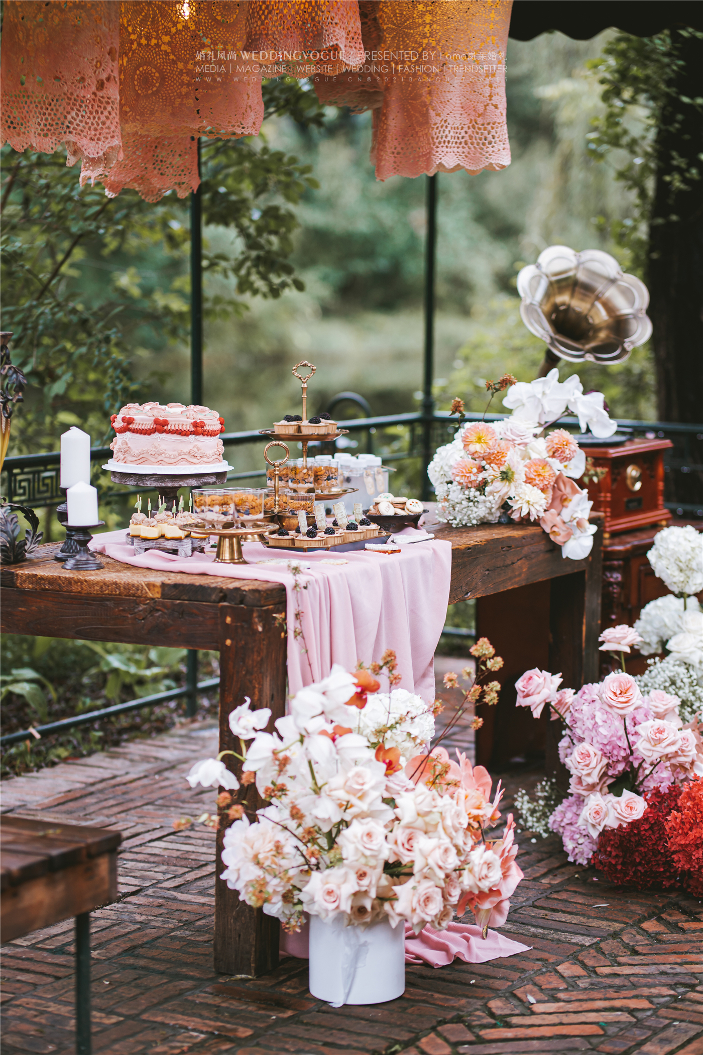 这场婚礼中,不仅仅是主场景被布置得格外完美,连迎宾区、甜品区、用餐区都是满满的精致感。