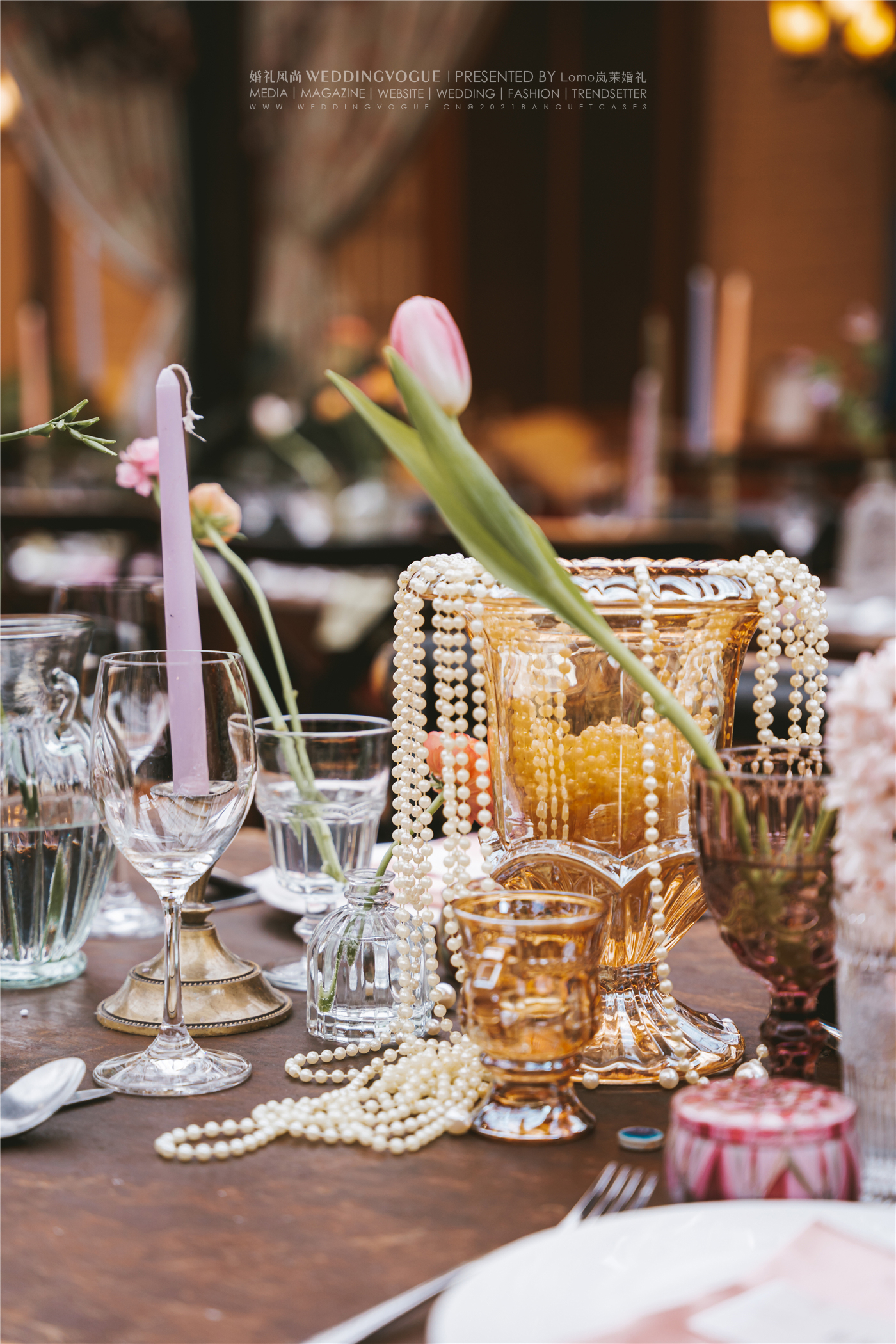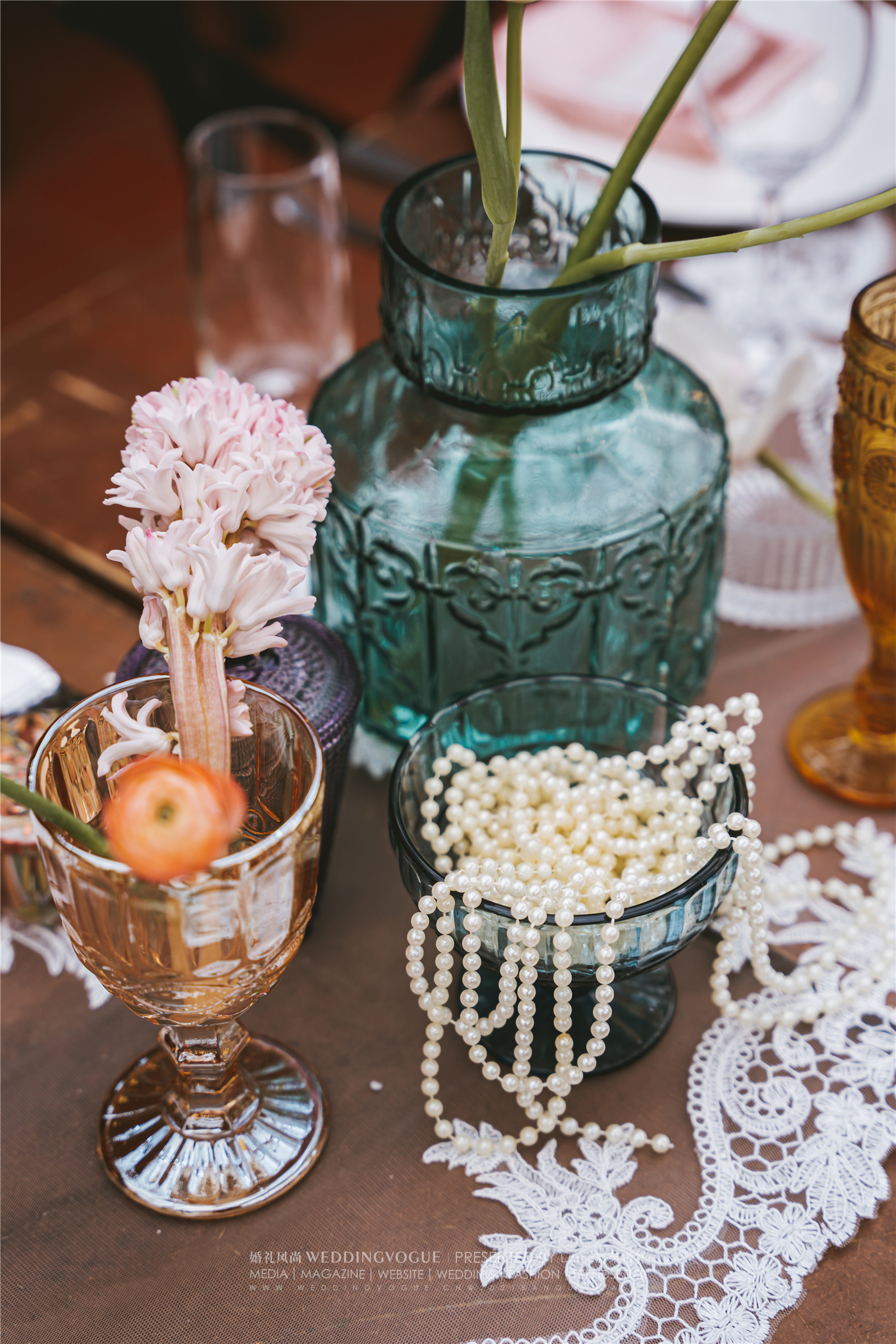 几十个不同形状大小的透明玻璃瓶器,组合成了超级特别的餐桌装饰,搭配珍珠、花艺、烛台,营造出强烈的婚礼氛围感。