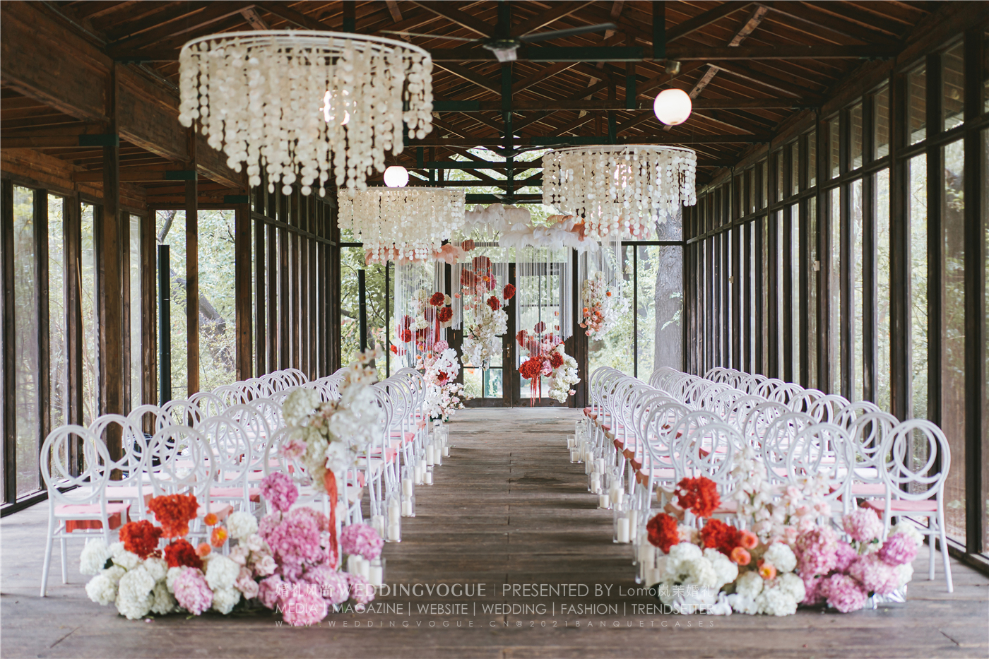 主背景垂挂的珍珠与观礼区上空垂挂的贝壳,简直像自带了精致与复古感,十分别致。