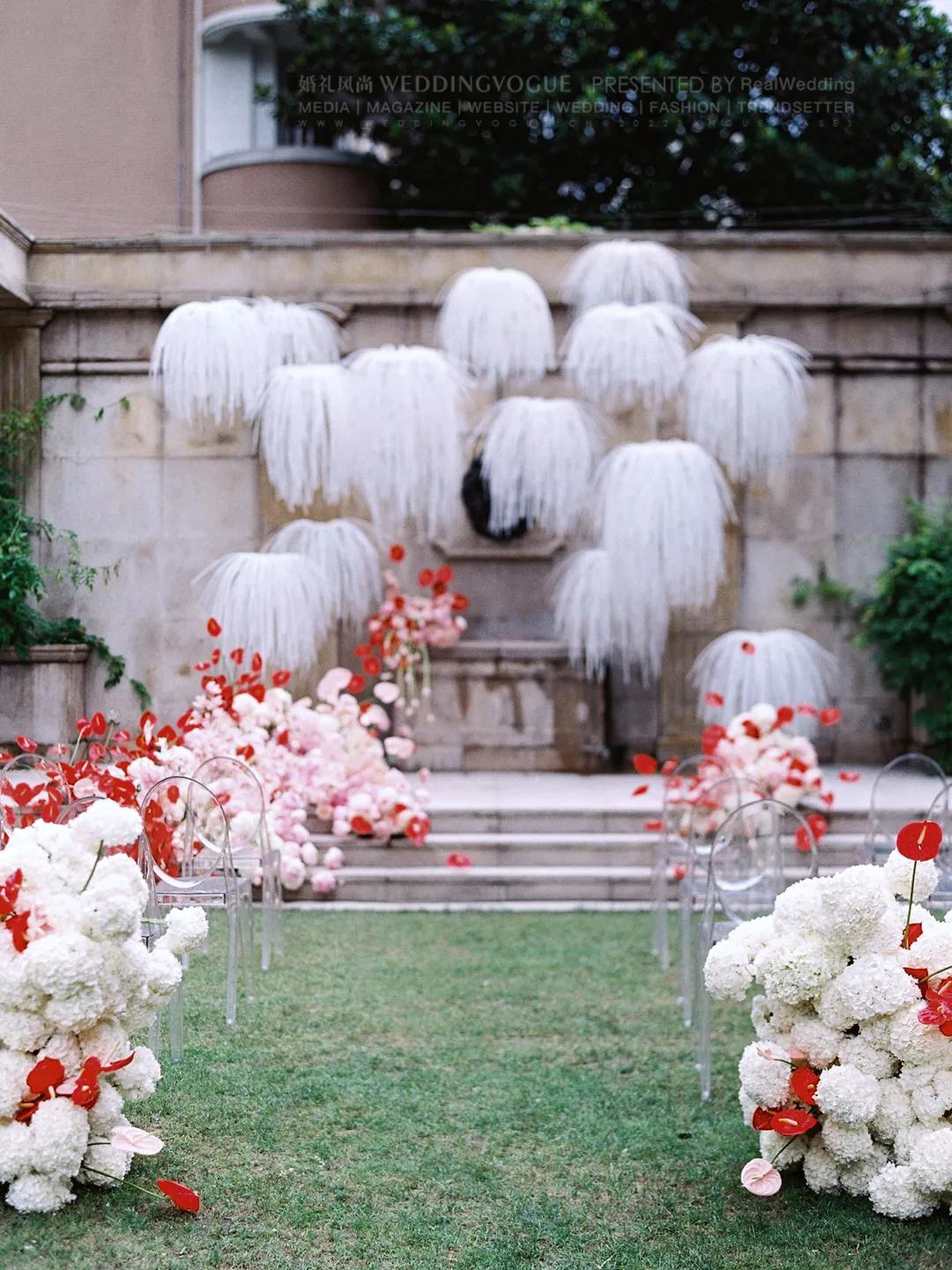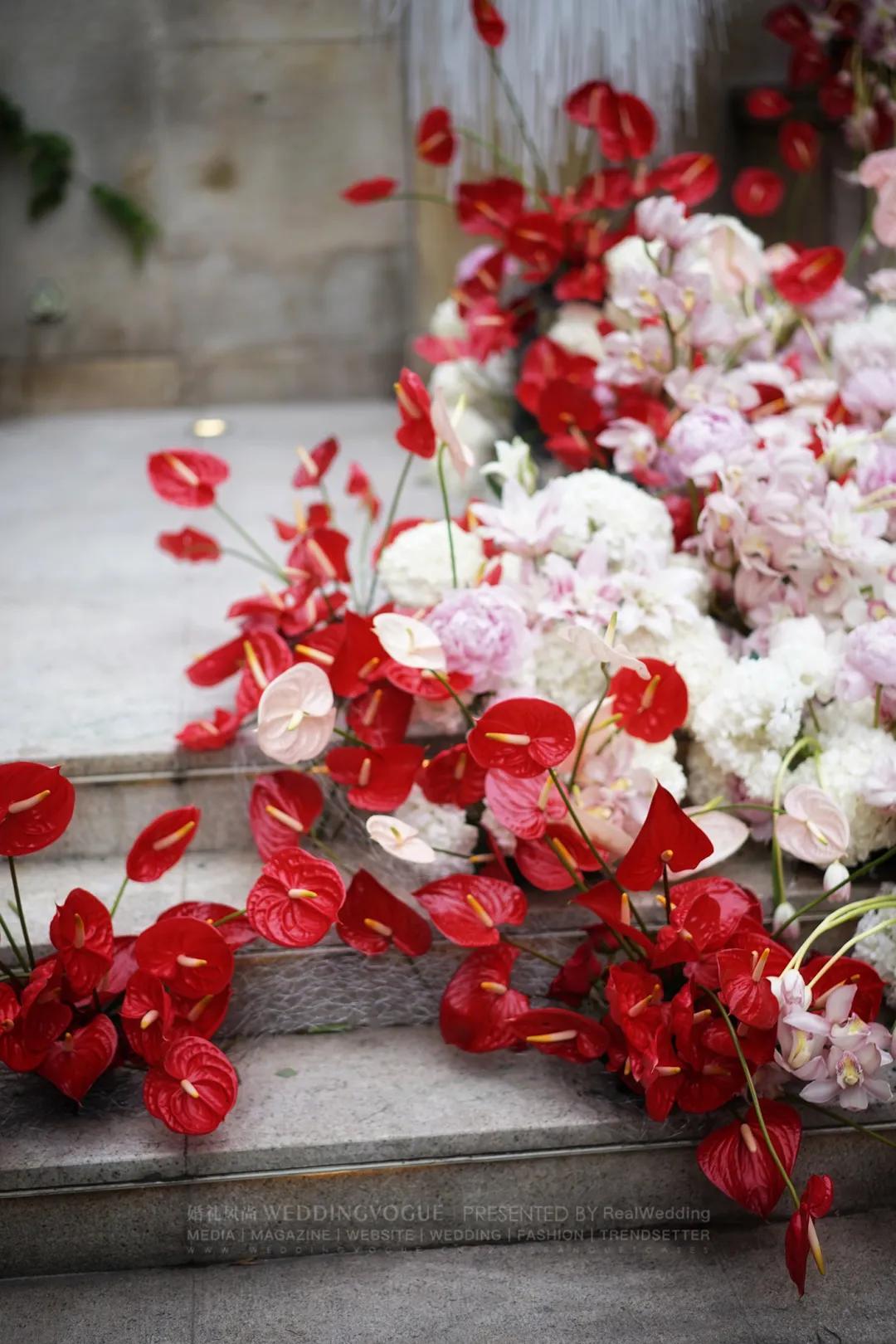 地上鲜活的红掌花、绣球花组成的花艺由白到粉到红有序排开,也如散落的烟花一般,绽放出无数个正处于璀璨时刻的光点。