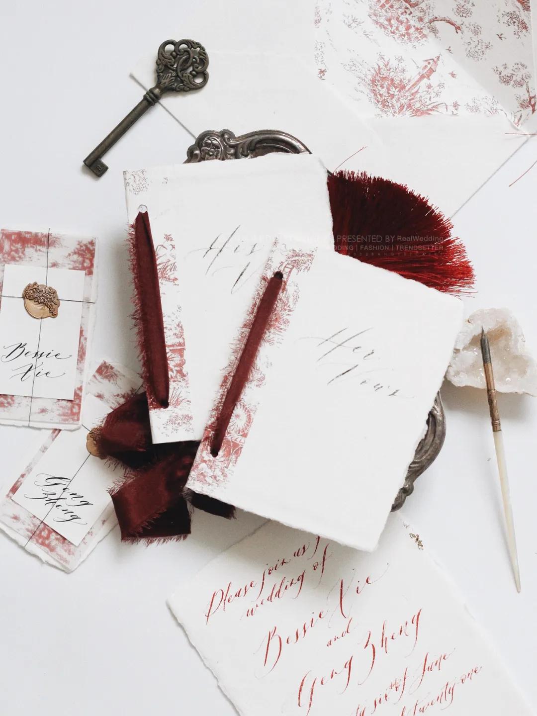 为了平衡繁杂的印花元素,誓言本的封面选择大面积留白并搭配极简英文书法,印花书脊装饰则配以酒红色真丝丝带。每一处细节都是恰到好处的细腻与温润。