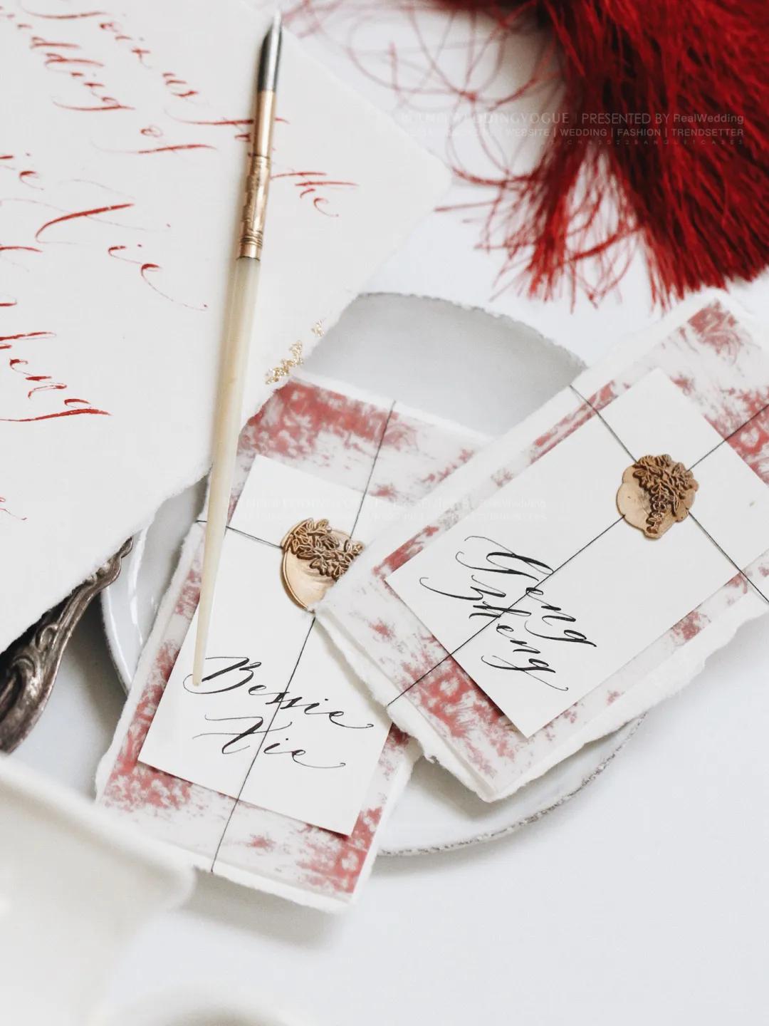 其他的宴会必备品也经过精心设计。宾客名卡用手工纸打底,再用印花硫酸纸丰富层次,最后用黑色的细绳捆扎、金色的火漆封缄,构成一种颇具内涵的复古美。