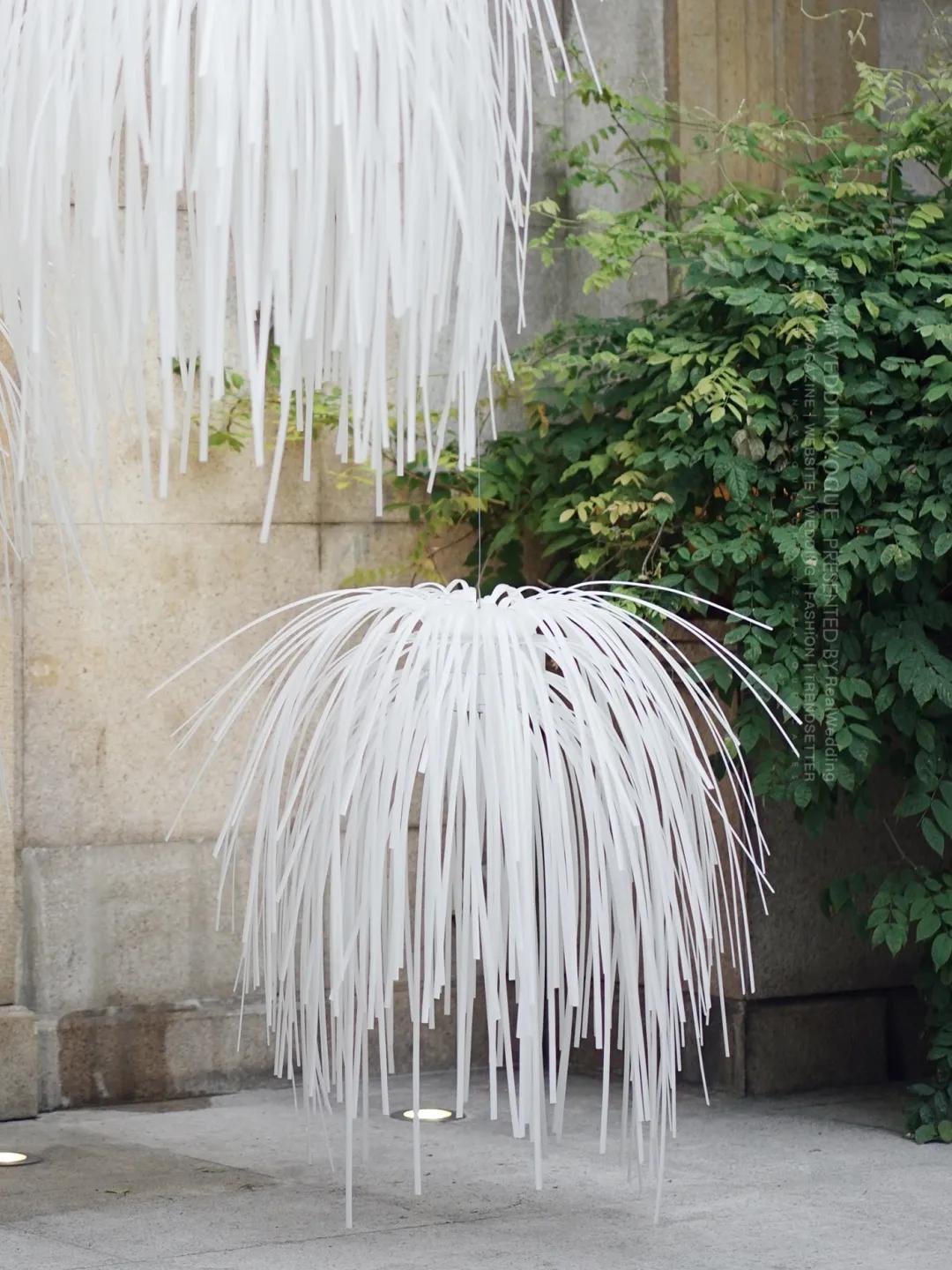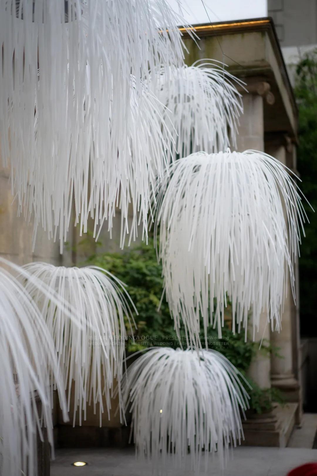 在户外的婚礼仪式区,设计师让烟花在最美的绽放状态下静止,一簇簇的烟花悬在空中——用许多根PVC条组合而成的烟花造型装置,以蓬松舒展的曲线呈现出烟花迸射达到最完美状态时的优美弧度。