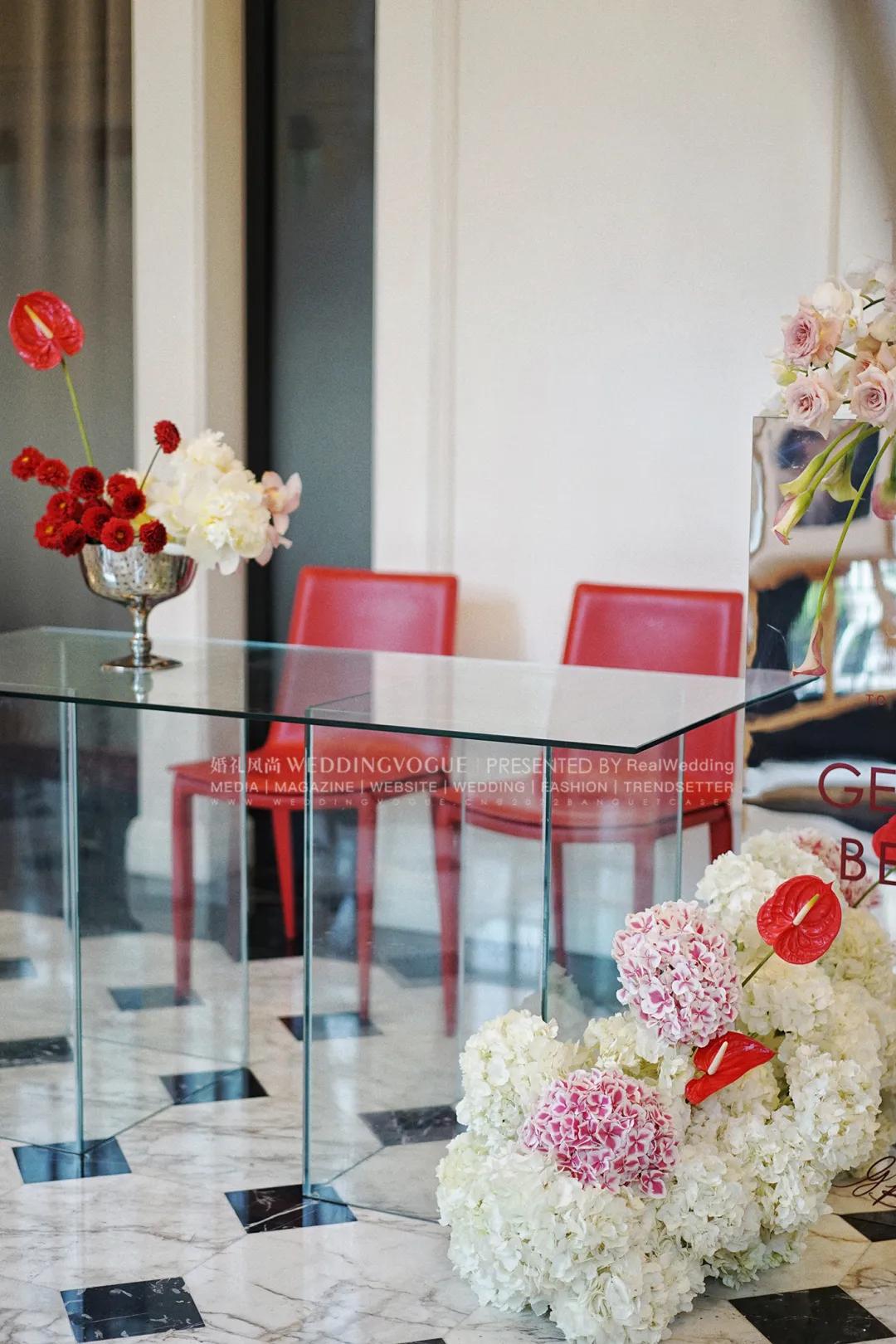 设计师说,在对设计方案的时候Bessie希望宾客看到婚礼现场的布置时能发出“Wow~”的惊叹。婚礼当天,当Bessie到达现场的时候自己不禁“Wow!”了起来。