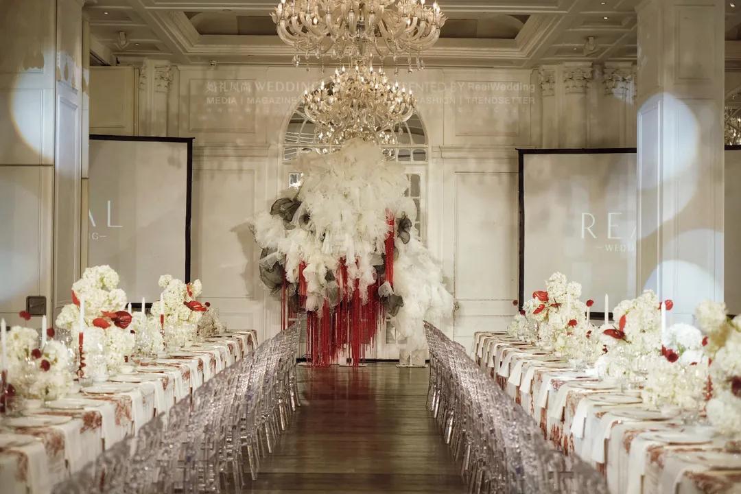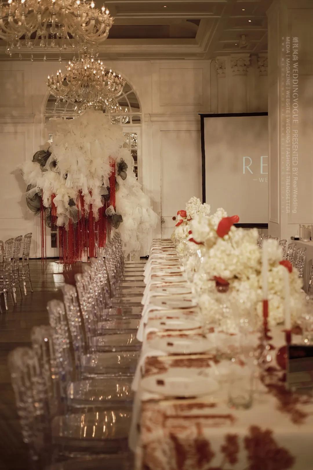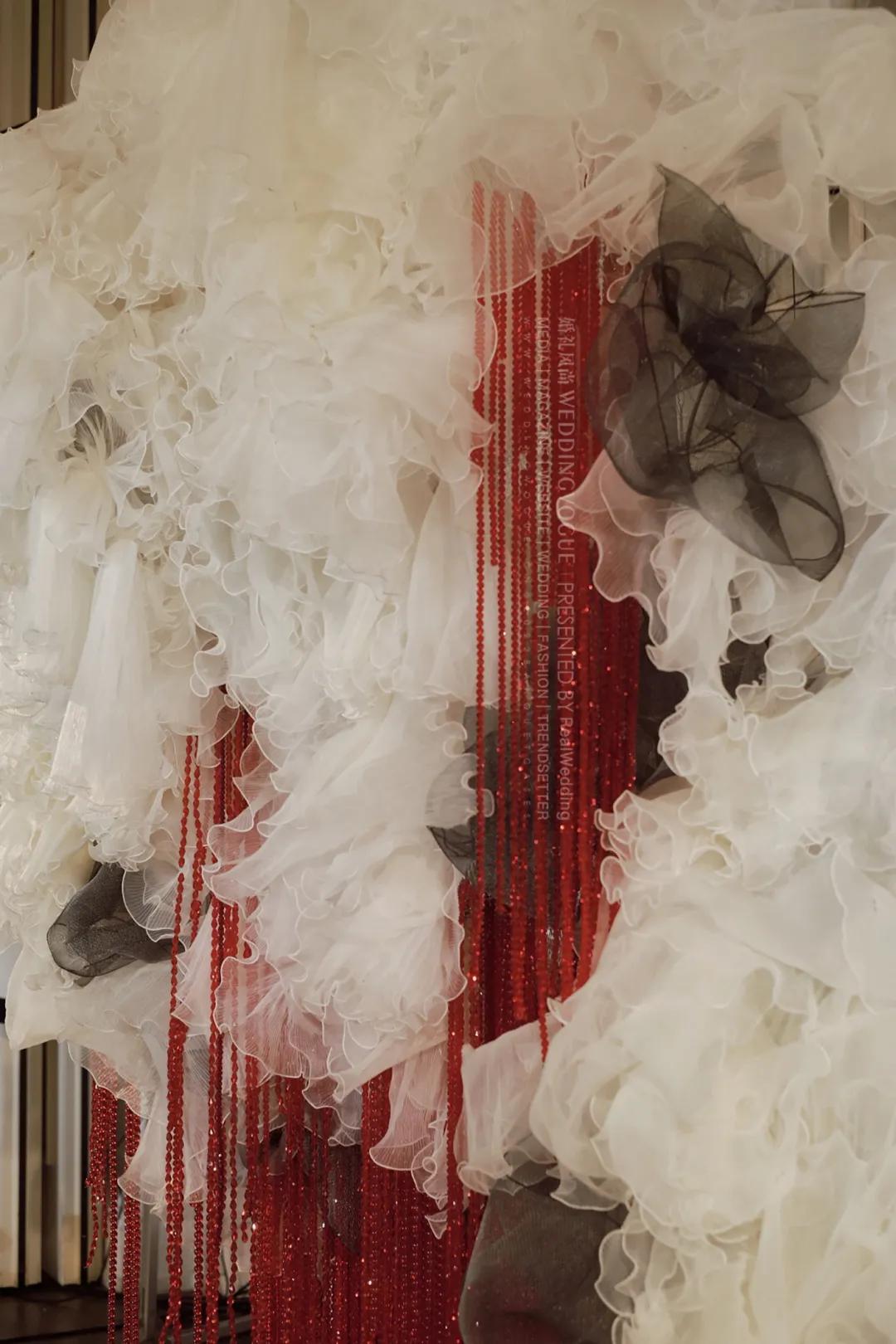 黑白两色的卷边纱交织堆叠,层层延展、垂悬,加上红色玻璃串珠的点缀,一个美得不可方物的布艺装置横空出世,让宴会空间更添浪漫与精致。