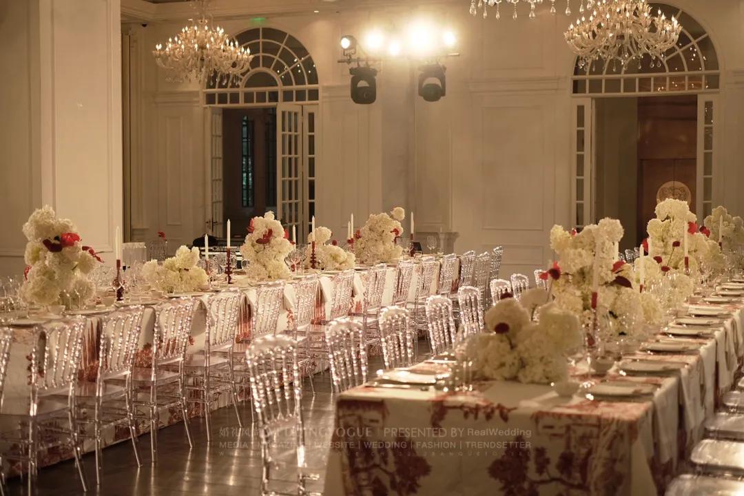 因为在餐桌上使用了许多定制的印花桌布,其中的花纹元素已足够丰富,所以设计师和新人一致认为宴会区的背景可以不用花艺。那么用什么呢?