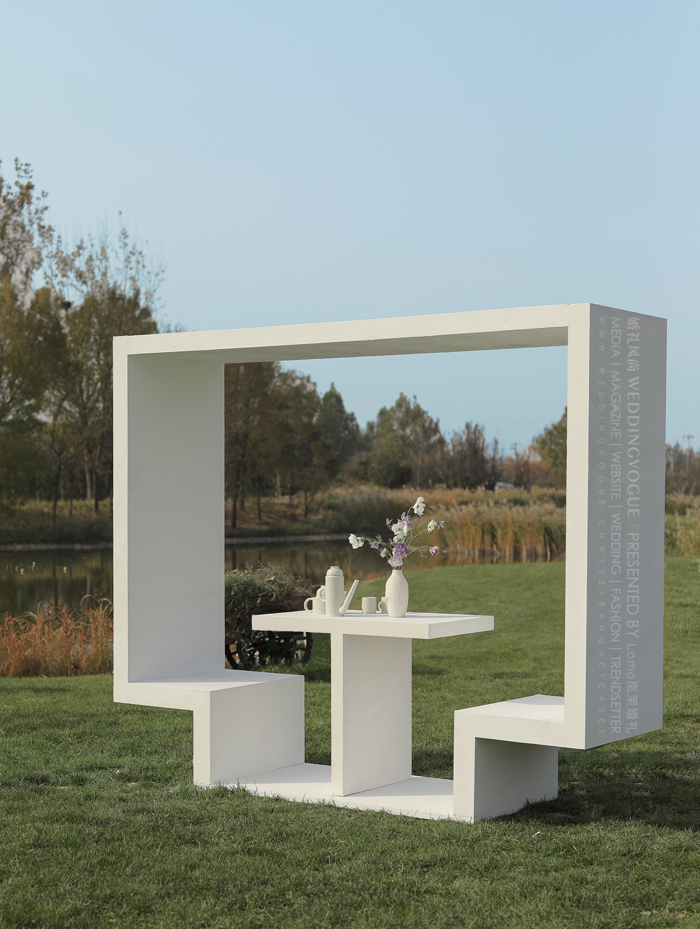 主背景的四四方方的立体结构在草坪婚礼中并不常见,不参杂其他颜色的纯白色,显得更具仪式感。