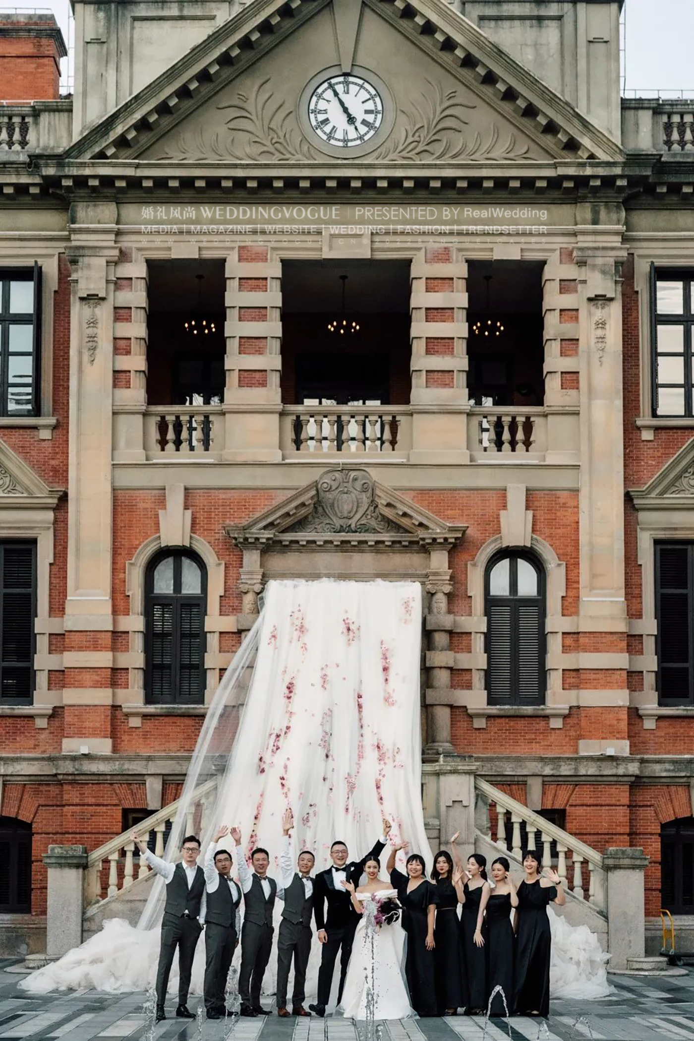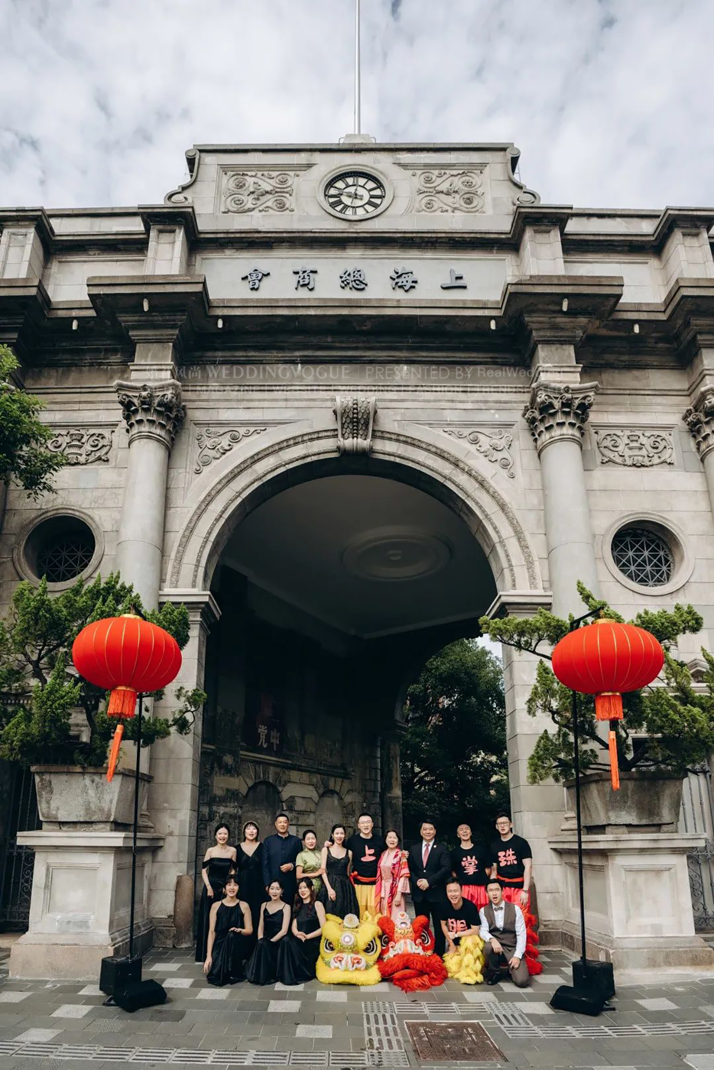 在历经百年的上海总商会门口,这种传统文化和现代时髦的强烈反差感,直接把婚礼的气氛在一早就拉满!