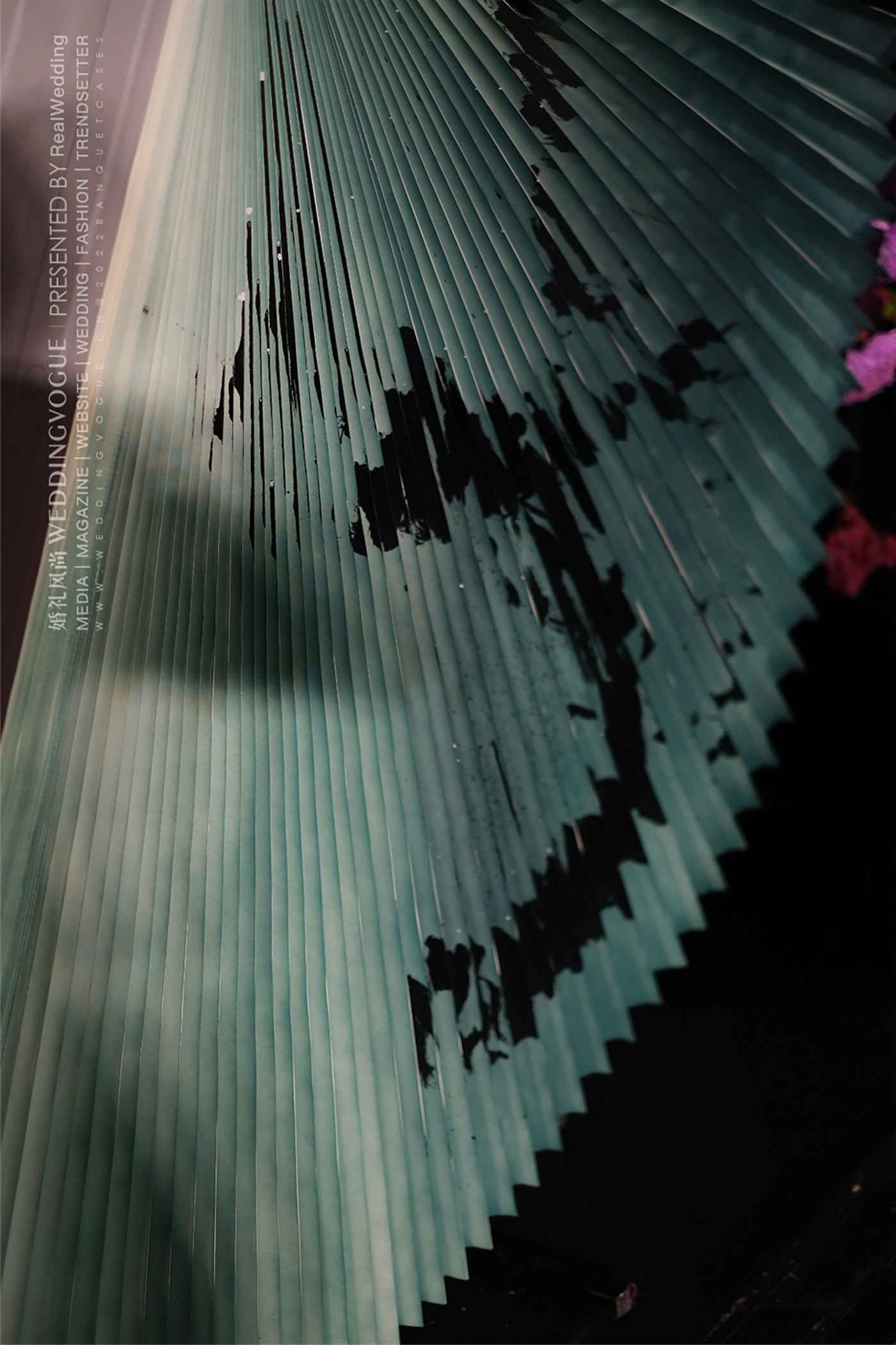婚礼当天的宝格丽,带着旧时香港的精致,空青色的扇子结合着羽毛和花艺,舞狮热闹生动,全场散发着迷人的张力。