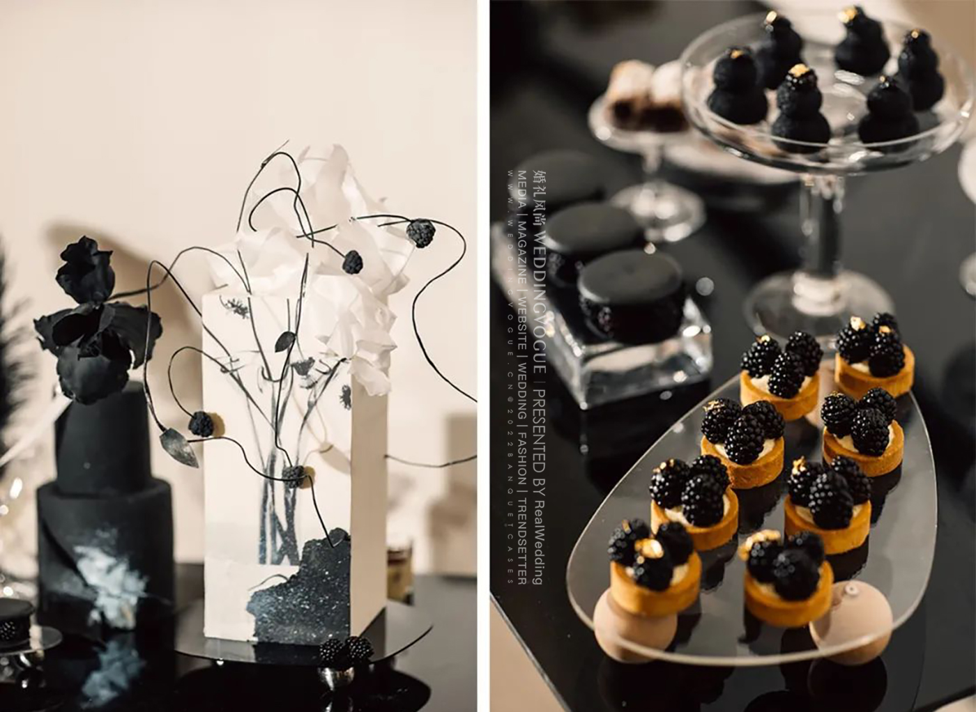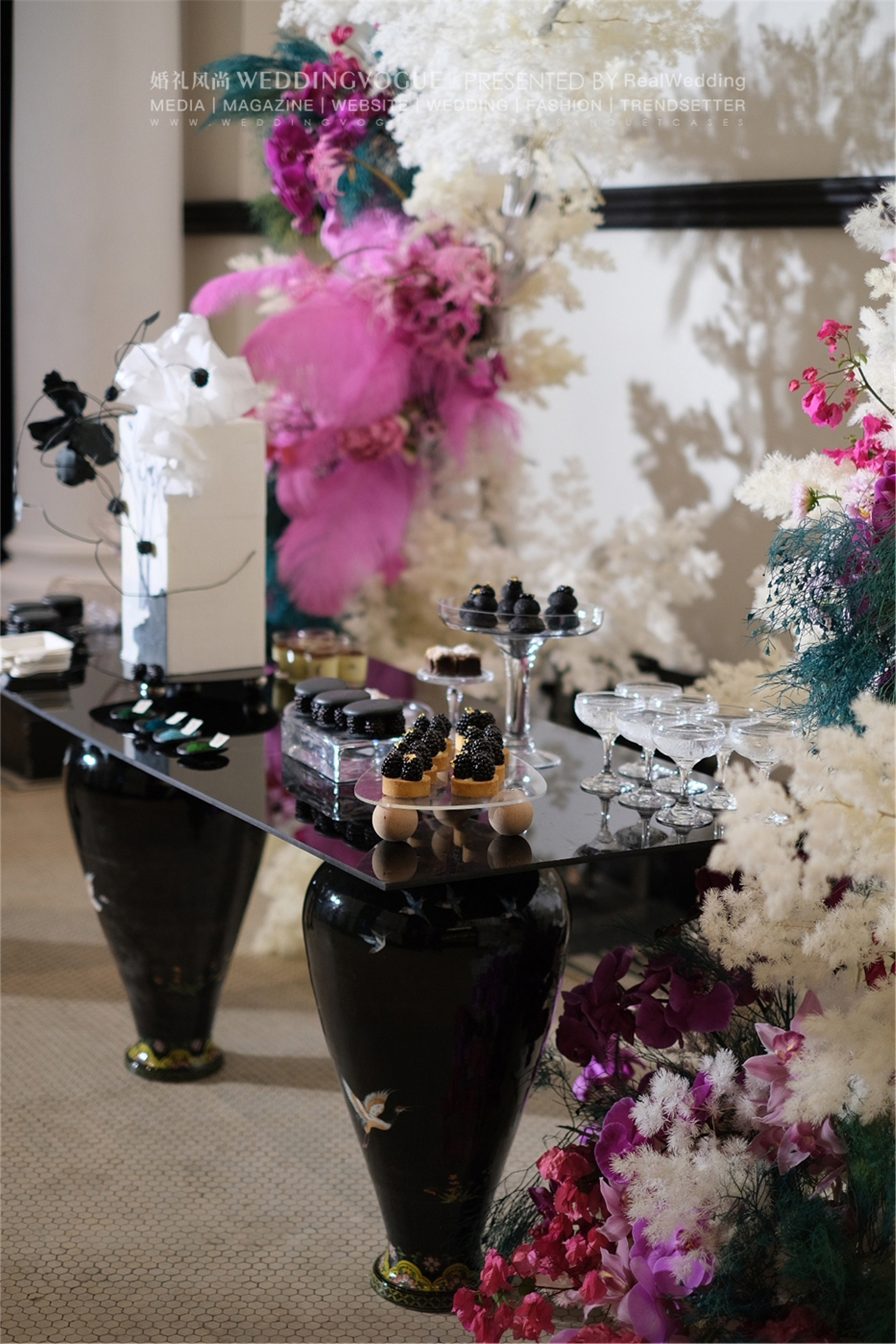 RealWedding从景德镇定制了两个可以放1300年的黑色瓷瓶来做甜品区的桌腿。