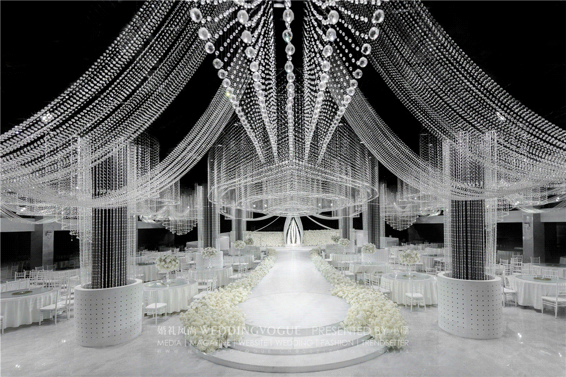 在灯光照射中绽放着光芒的水晶装置,则有如暗夜烛火般给刺激着宾客视觉神经的婚礼现场添上了不少的可供消受的纯白美感。