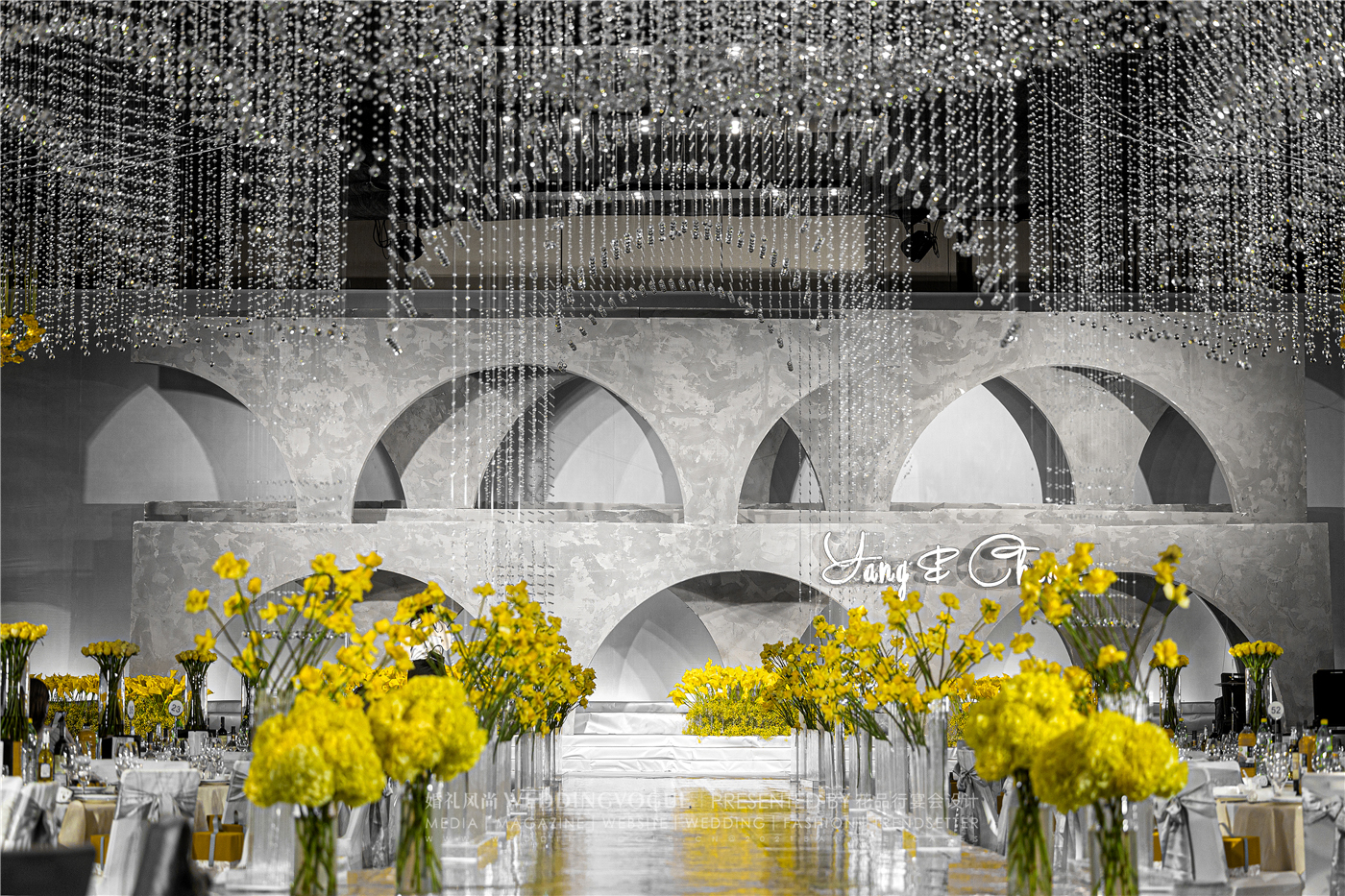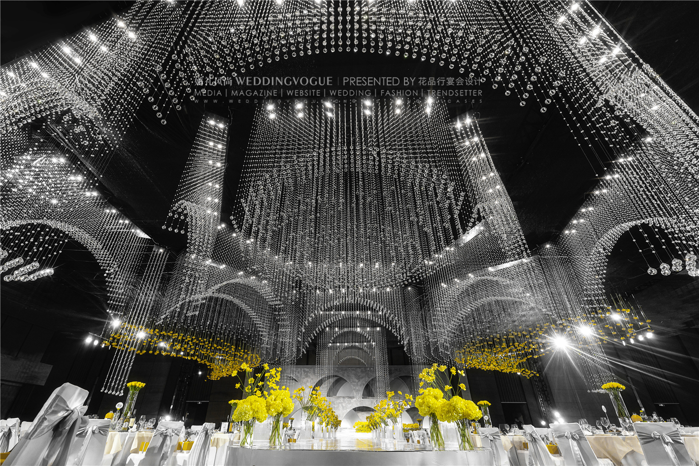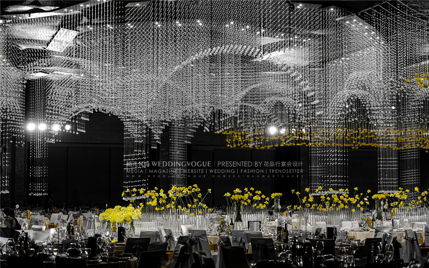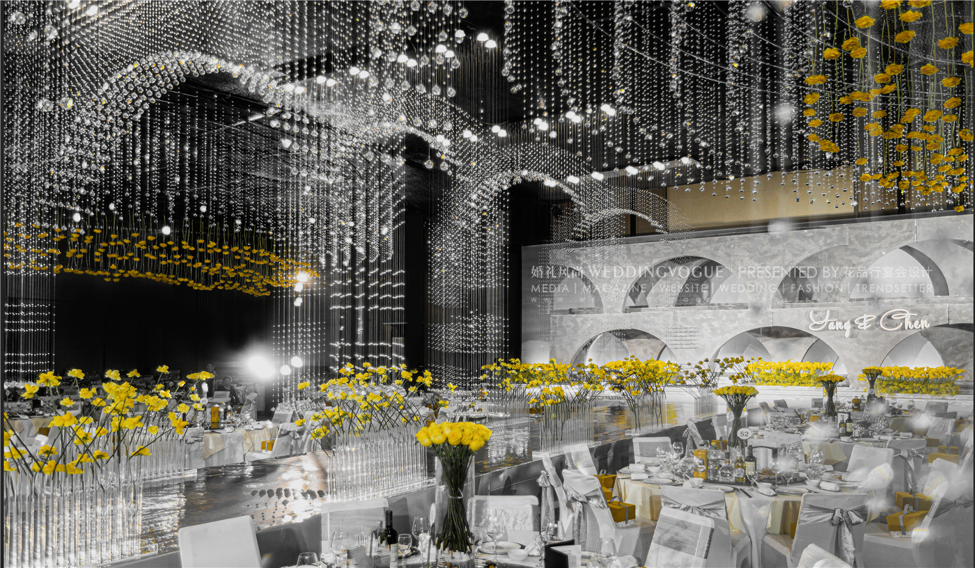 在「花品行宴会设计」设计师手中,纯洁无瑕的水晶遇上了黄玫瑰,背景的极致灰和花艺的明亮黄碰撞,在纯粹的美学秩序中,别具一格。