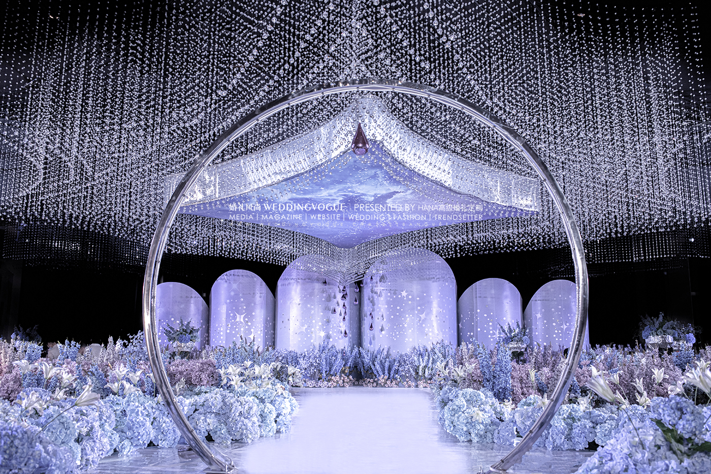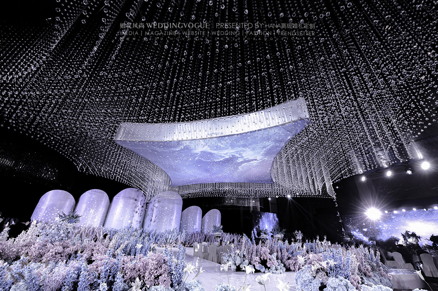 在「HANA高级婚礼定制」设计的这场婚礼中,水晶则显示出了高贵且神圣的紫。抬头仰望,如同近在咫尺的漫天星斗,在空际的明暗里影影绰绰中,高远幽深的神秘和探寻未知的希冀洒落进新人和宾客眼中,传递出大气、高级的格调。