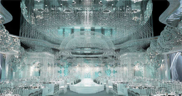 这场来自设计师「小棚」的水晶婚礼,干净极简,没有多余的装饰,在灯光的折射下,显示出璀璨的光辉,在蓝紫色的灯光照射下,则呈现出一种赛博朋克风的科幻感。