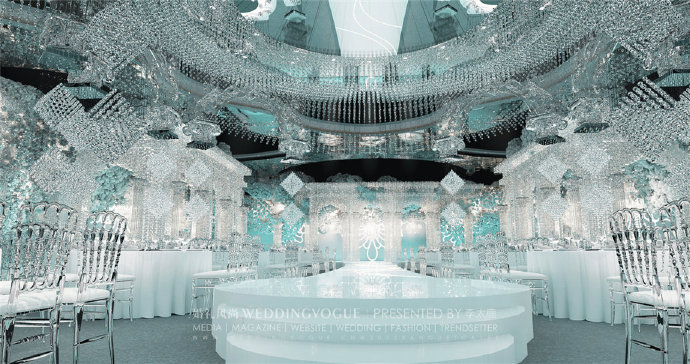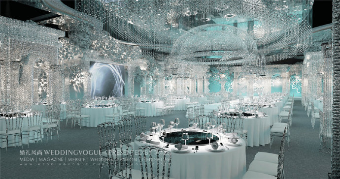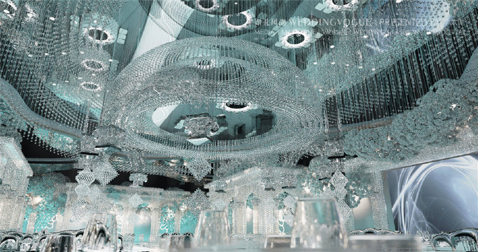 在建筑装饰和空间设计中,运用到水晶并以之为重要饰品的当属婚礼设计。纯粹、通透、澄明,恰好符合了新婚燕尔的人们对爱情、婚姻的美好感悟和希冀,也因其在灯光作用下闪亮如星星的特点广受新人喜爱。