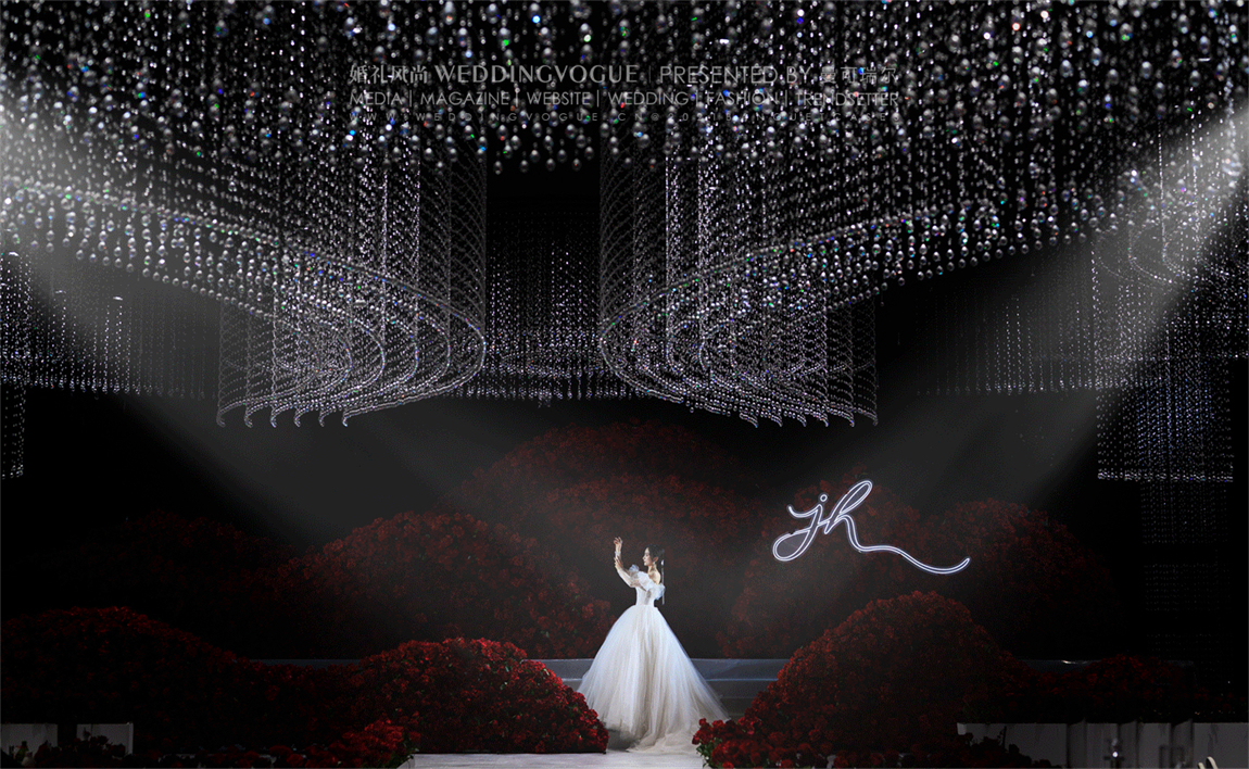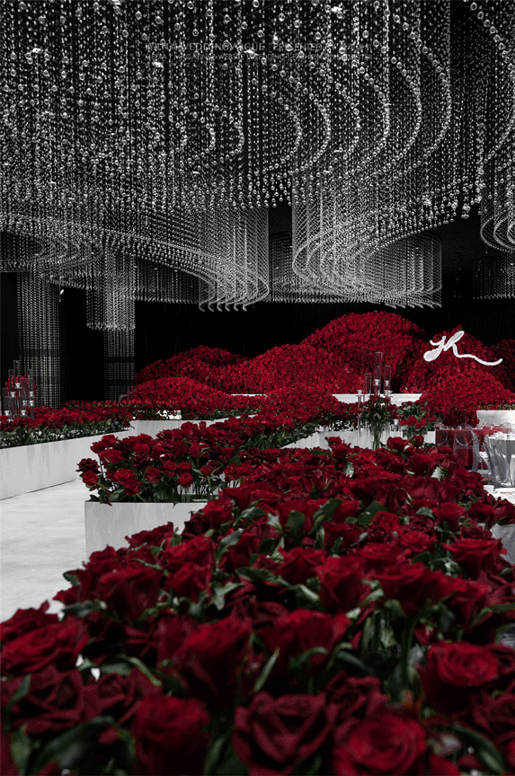 水晶点线阵列,气势恢宏,构建出一座若隐若现、神秘诡谲的透明城堡,满场的红色玫瑰与水晶搭配,将温馨浪漫的气息一路延伸。