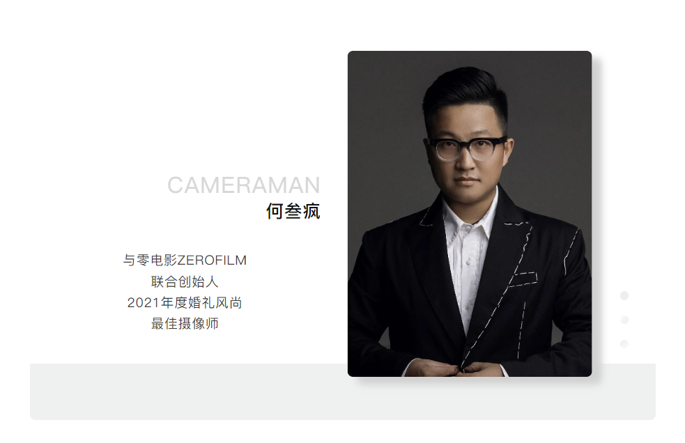 摄像师何叁疯在市场的变迁中坚守着自己对婚礼行业的选择,用一部部婚礼影像作品回馈着因爱结合、共赴幸福的婚礼新人,于无形中抚摩着人们柔软的内心。
