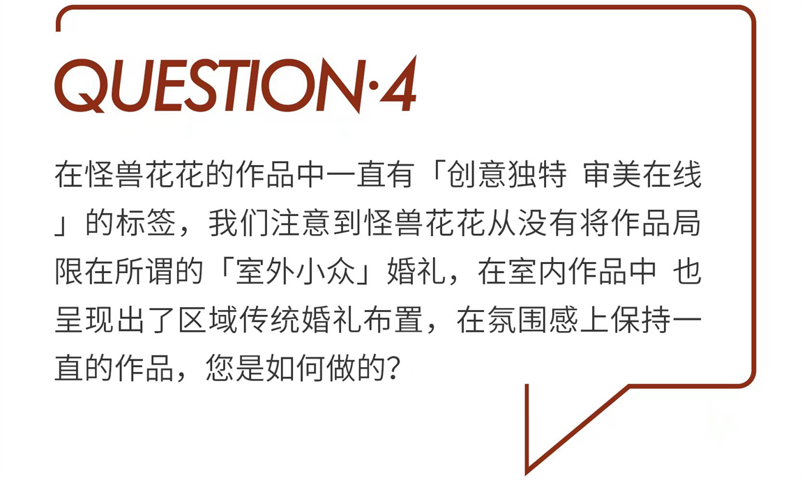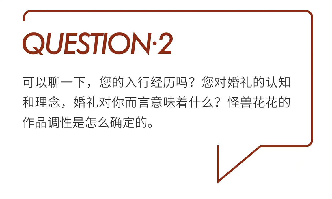 怪兽花花的存在属于从传统大型婚礼到户外精致婚礼的一个交替时代,我们从自我认知开始审视婚礼的整体设计,然后逐渐婚礼形式慢慢变成我们所想表达的样子。我更希望怪兽花花就是一种独特的风格吧。