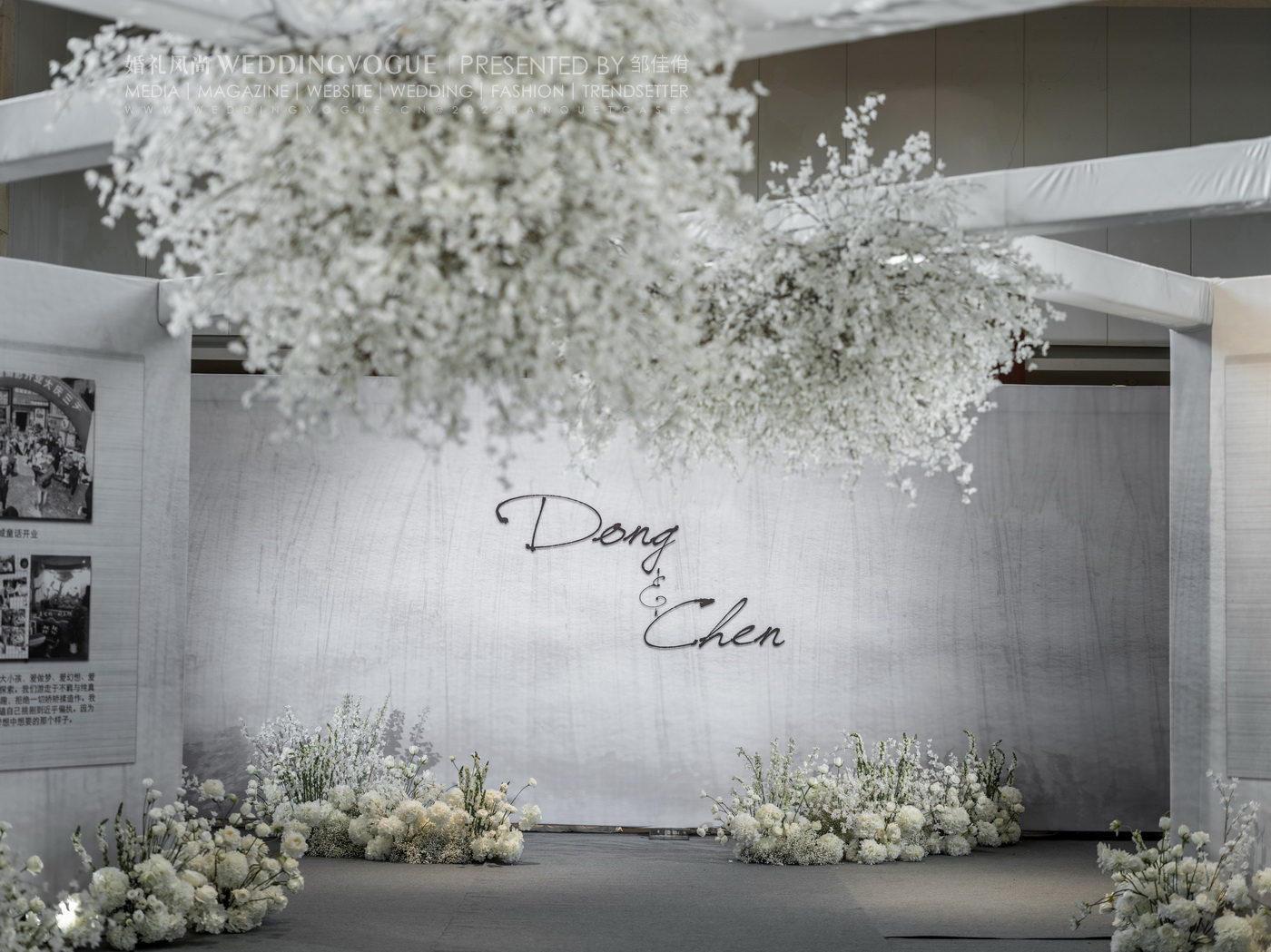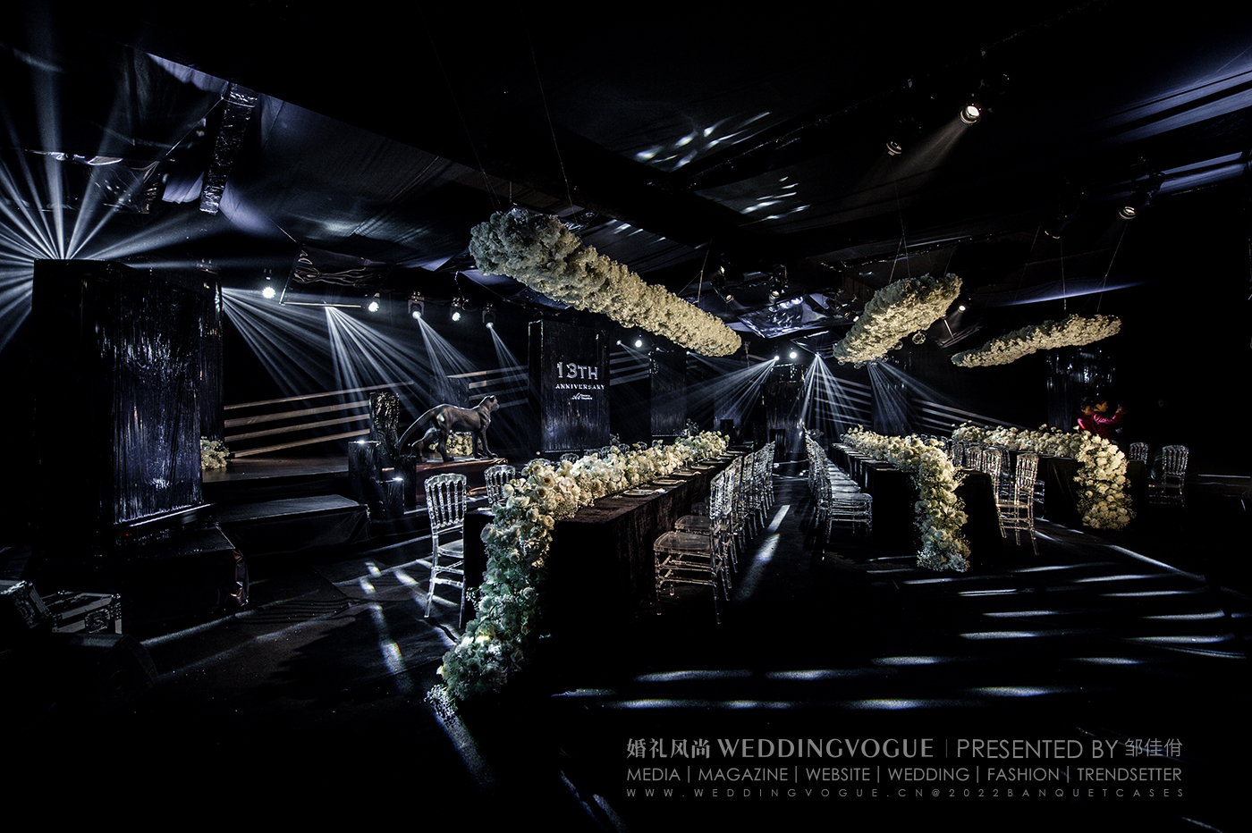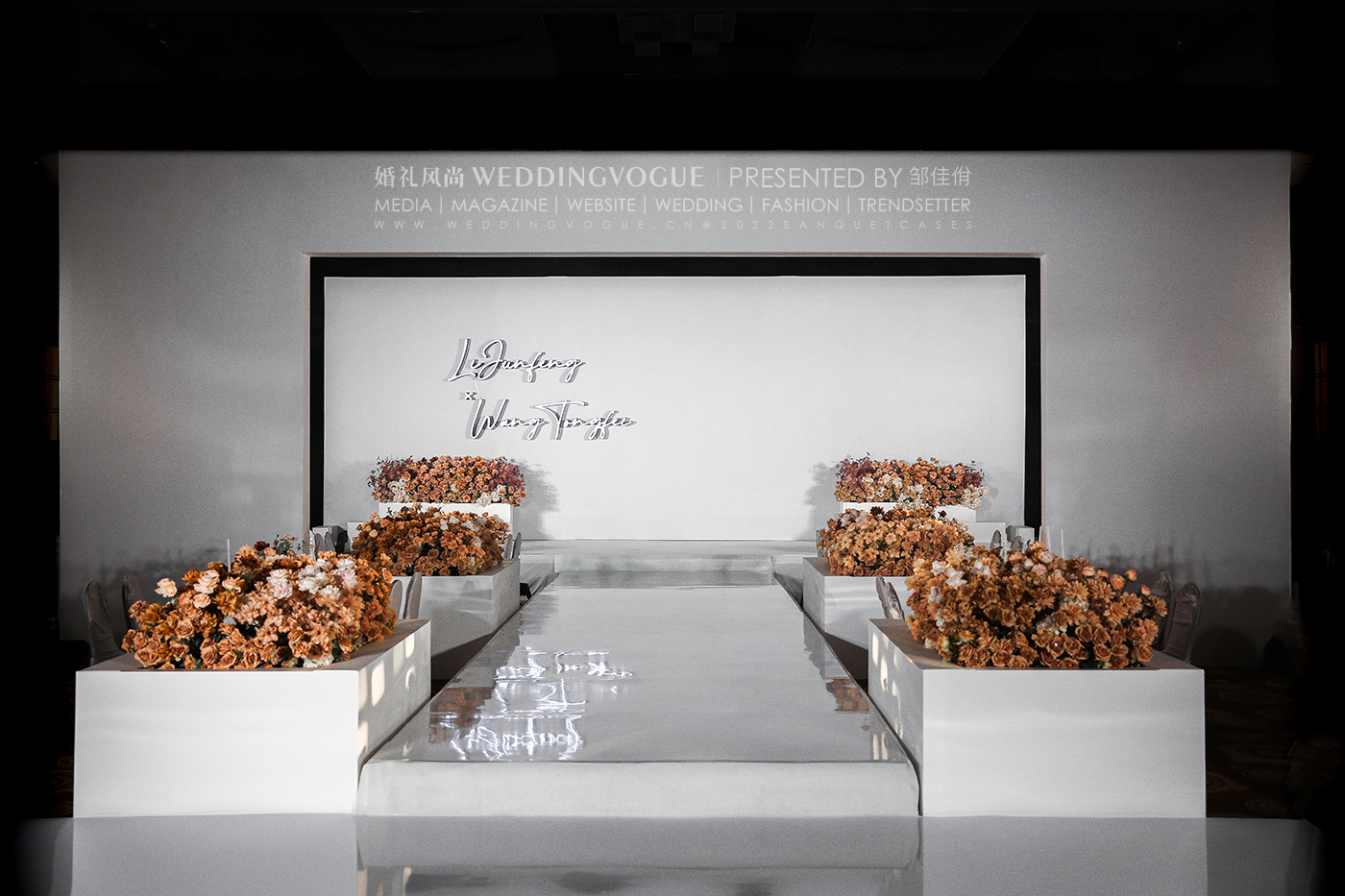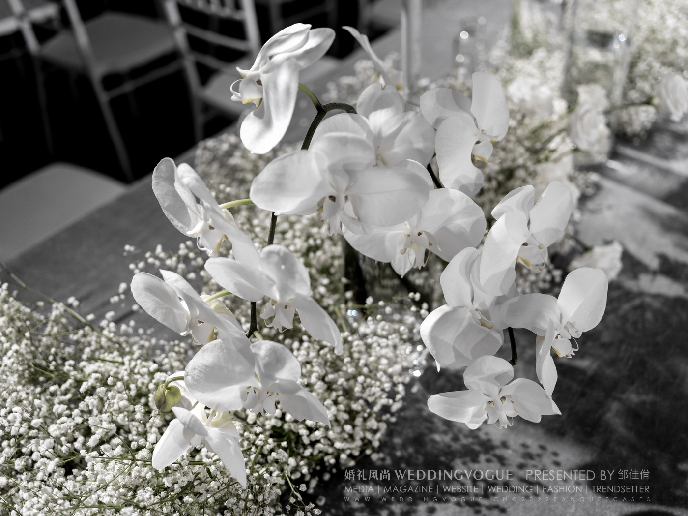 作为一位有着独特审美的设计师,黑、白、灰这些素雅的色彩也是他作品中的“常客”,显得有些单调沉闷的颜色经他之手,也会在婚礼场景的整体氛围下灵动起来,表达出属于婚礼的欢喜与感动。