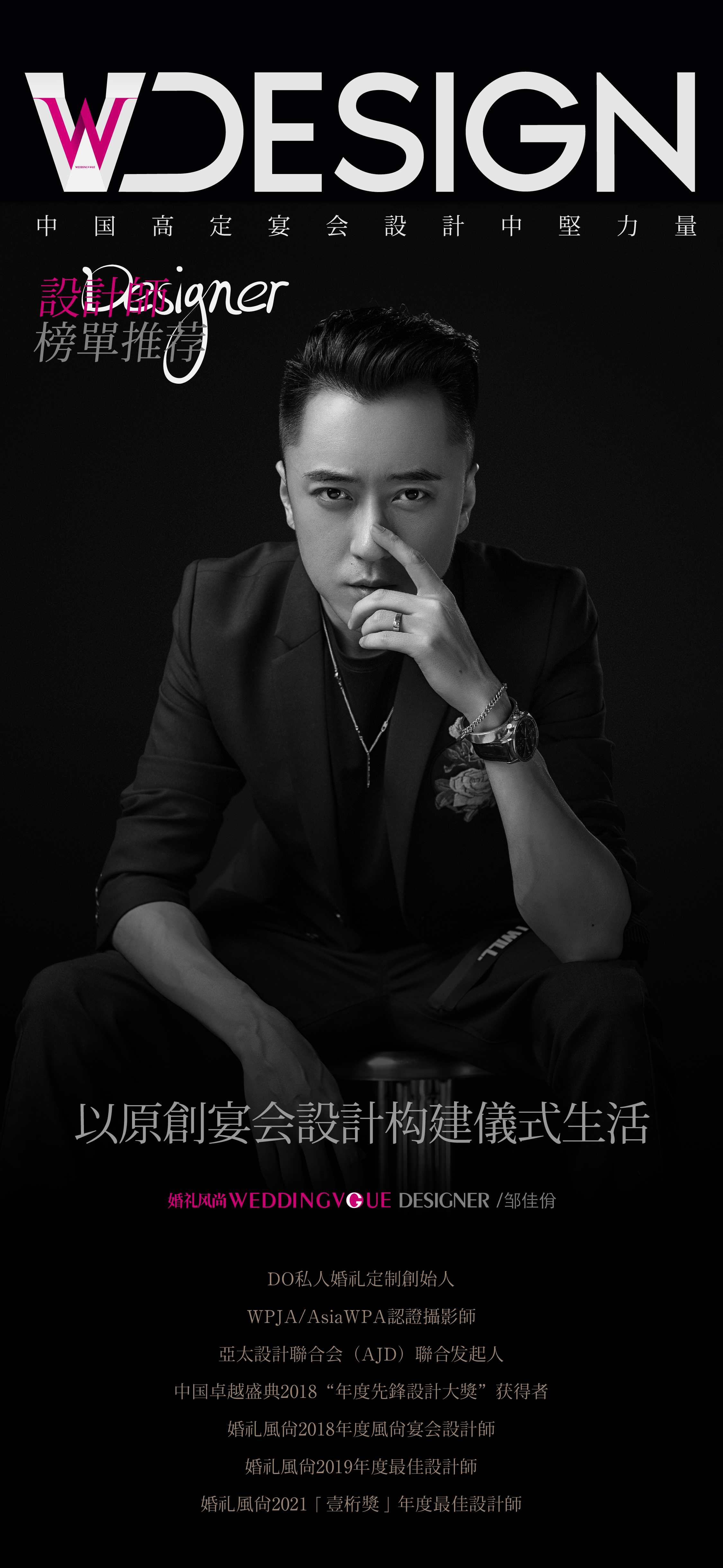 基于此前从种种工作中积累的审美和经验,让开始在婚礼设计领域小试牛刀的邹佳佾对于美、对于设计有了自己独特的理解和更高的要求,于是萌生了想要成为一名专业设计师的想法。在入行不久之后,他便创立了自己的婚礼设计品牌——「DO私人婚礼定制」。