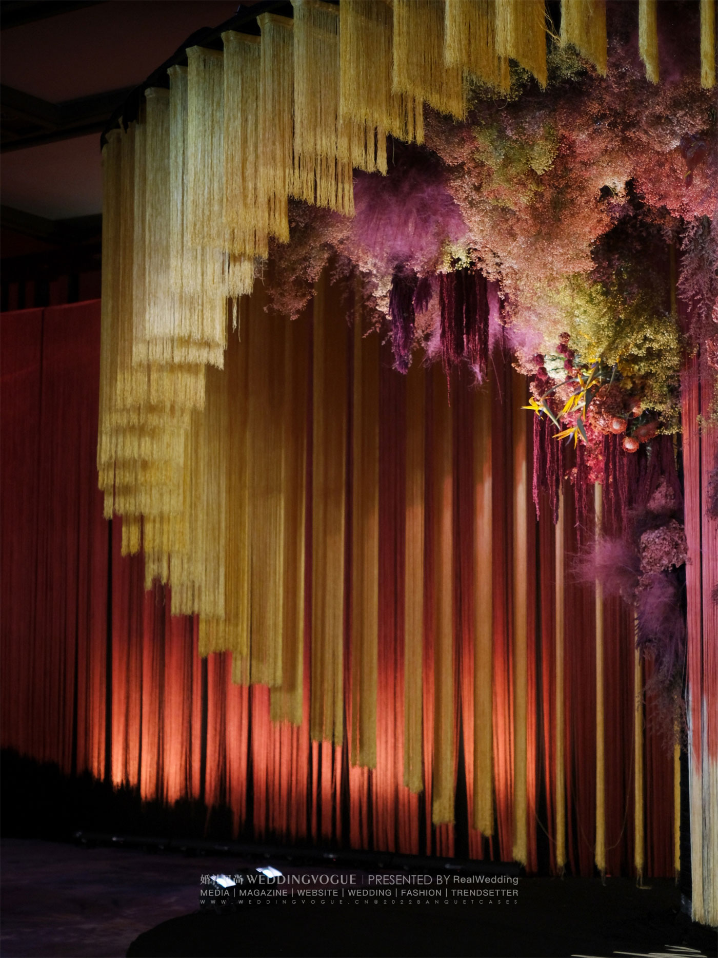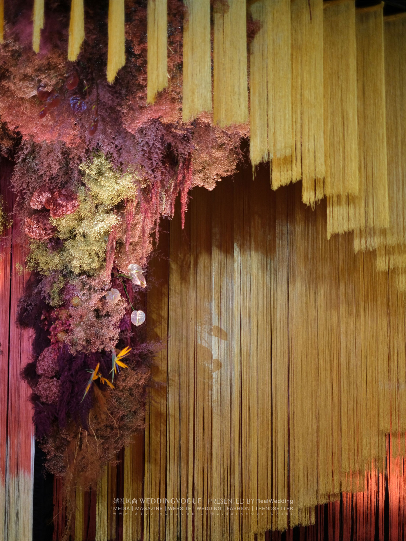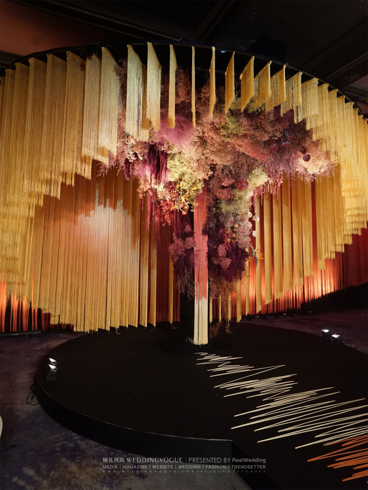 在圆环中心,红黄色的线交杂着红黄色且种类繁多的花艺,构成了孕育着生机的星体。仪式舞台之后,是成片的驼红色线条铺陈开来,形成巨大的光晕,热烈得十分耀眼夺目。