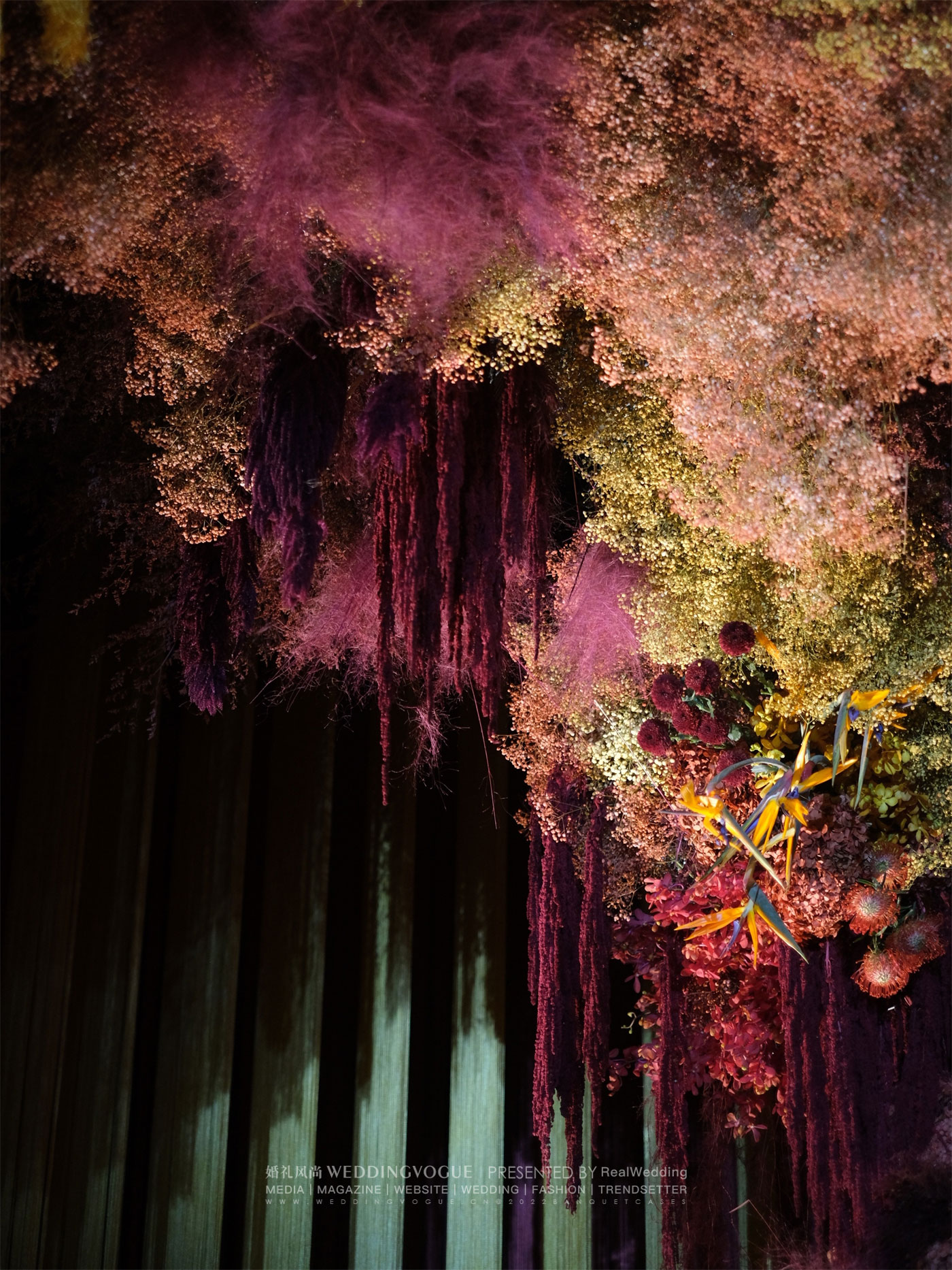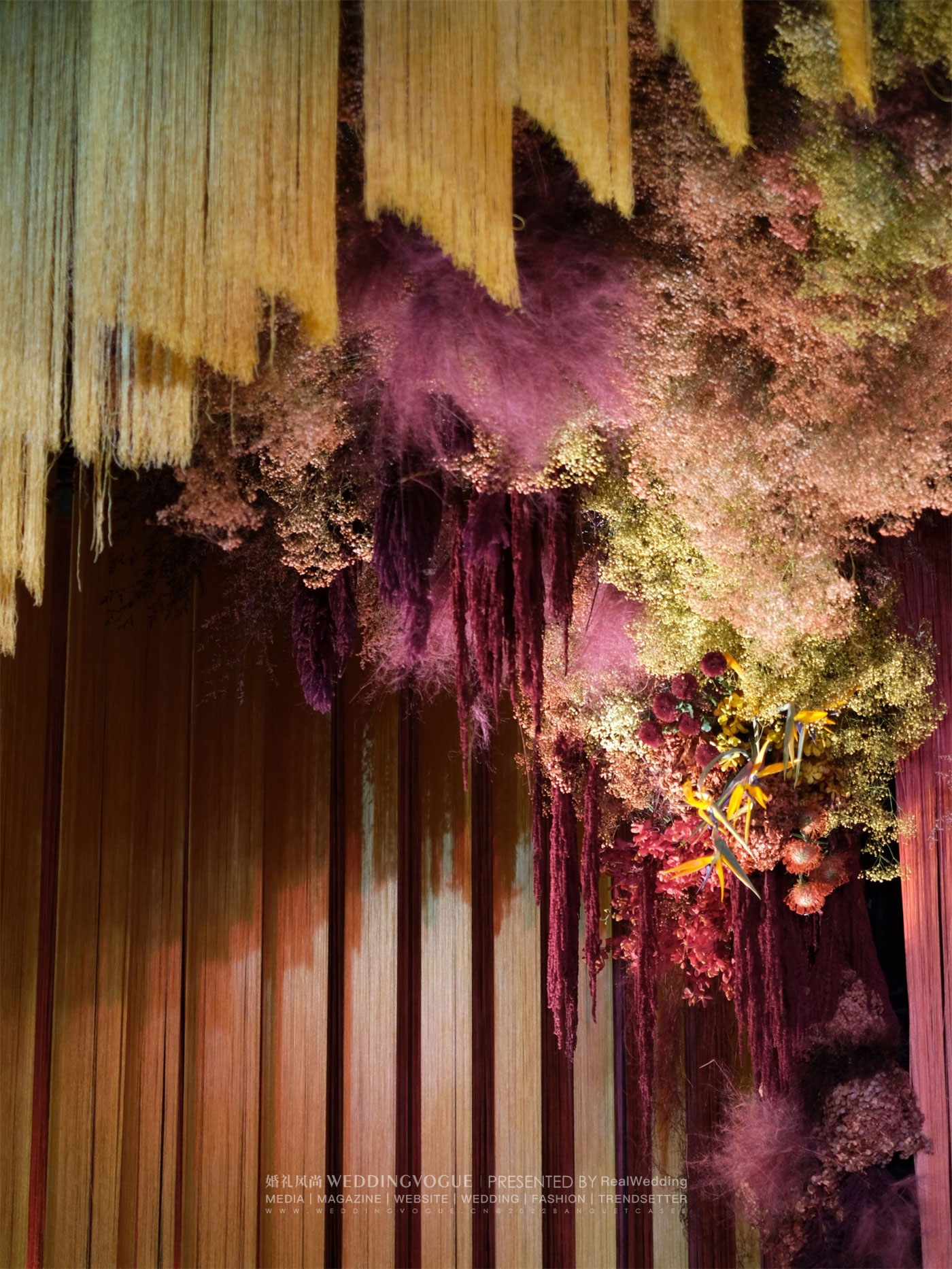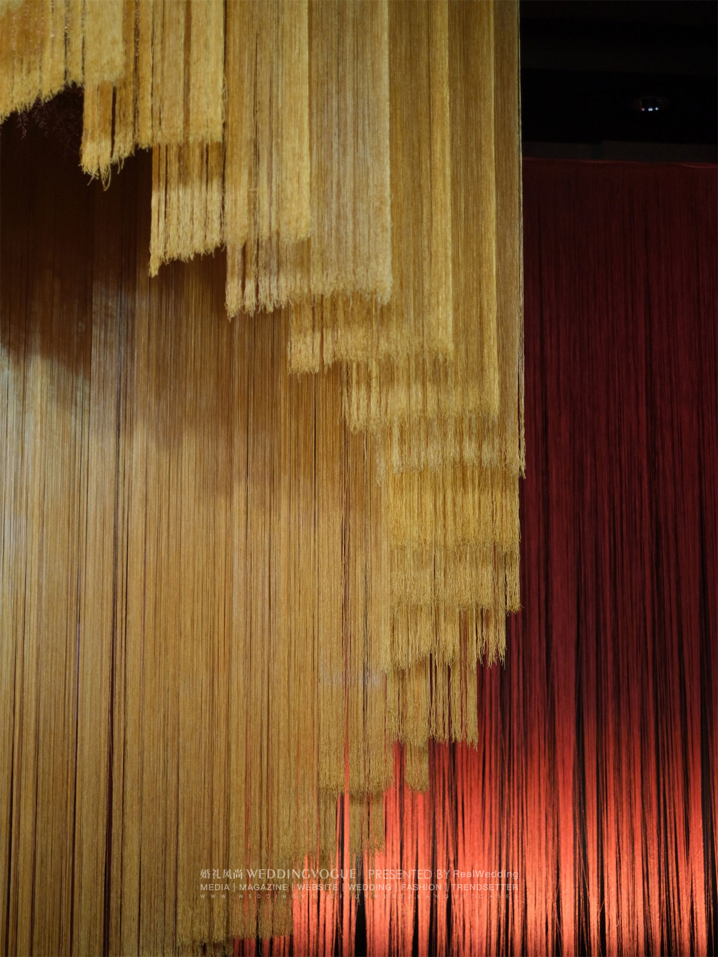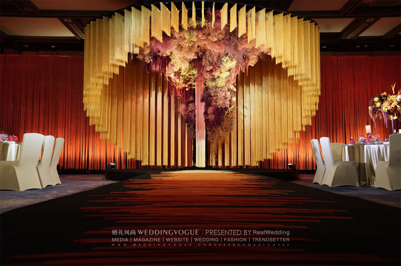 在圆环中心,红黄色的线交杂着红黄色且种类繁多的花艺,构成了孕育着生机的星体。仪式舞台之后,是成片的驼红色线条铺陈开来,形成巨大的光晕,热烈得十分耀眼夺目。