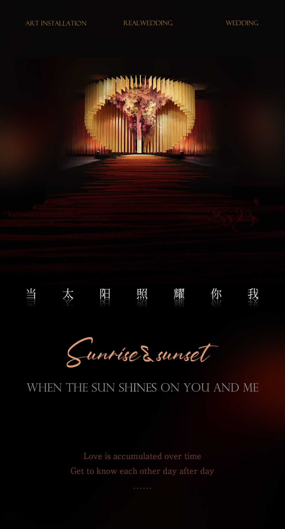 明黄色对应着正午阳光的热烈、驼红色对应着日出日落的透射,这两种色彩贯穿整个婚礼设计,围绕着「当太阳照耀你我」的主题,从光束到光晕,缓缓照亮婚礼现场,亦是婚礼新人情感历程的具象。