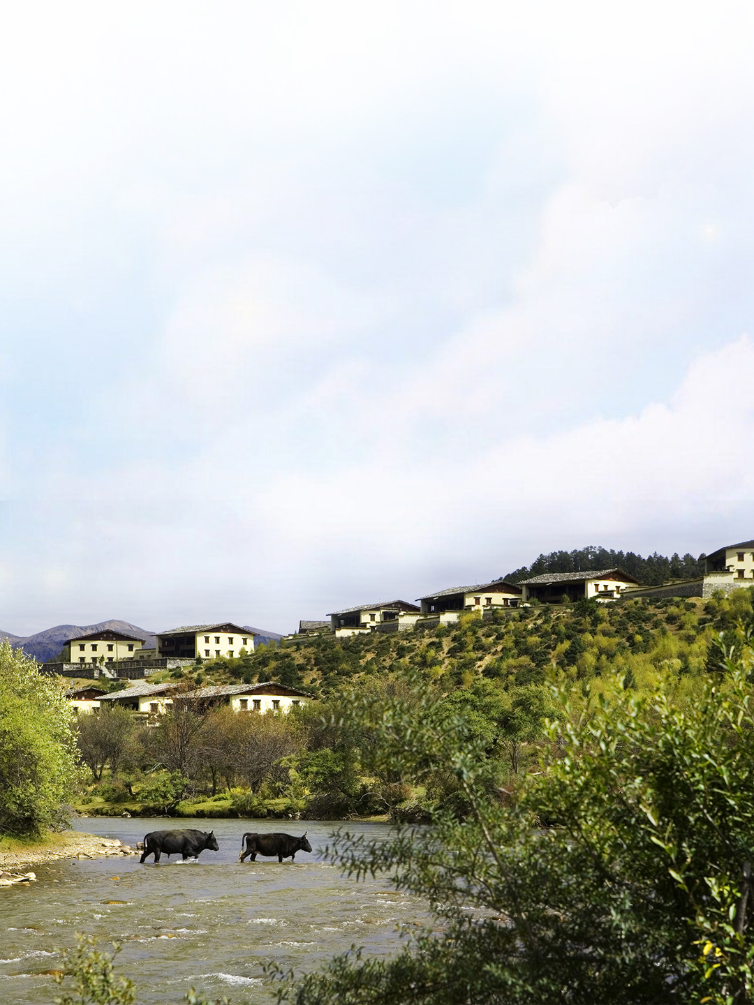 康巴藏区高原上的仁安山谷,属都岗河潺潺流过,牦牛闲散的走在起伏的牧场间,潜藏于山谷之中的藏式农舍依山而建,很难想象这里是悦榕集团在中国的第一家酒店。