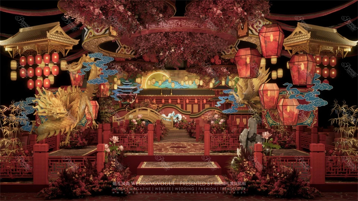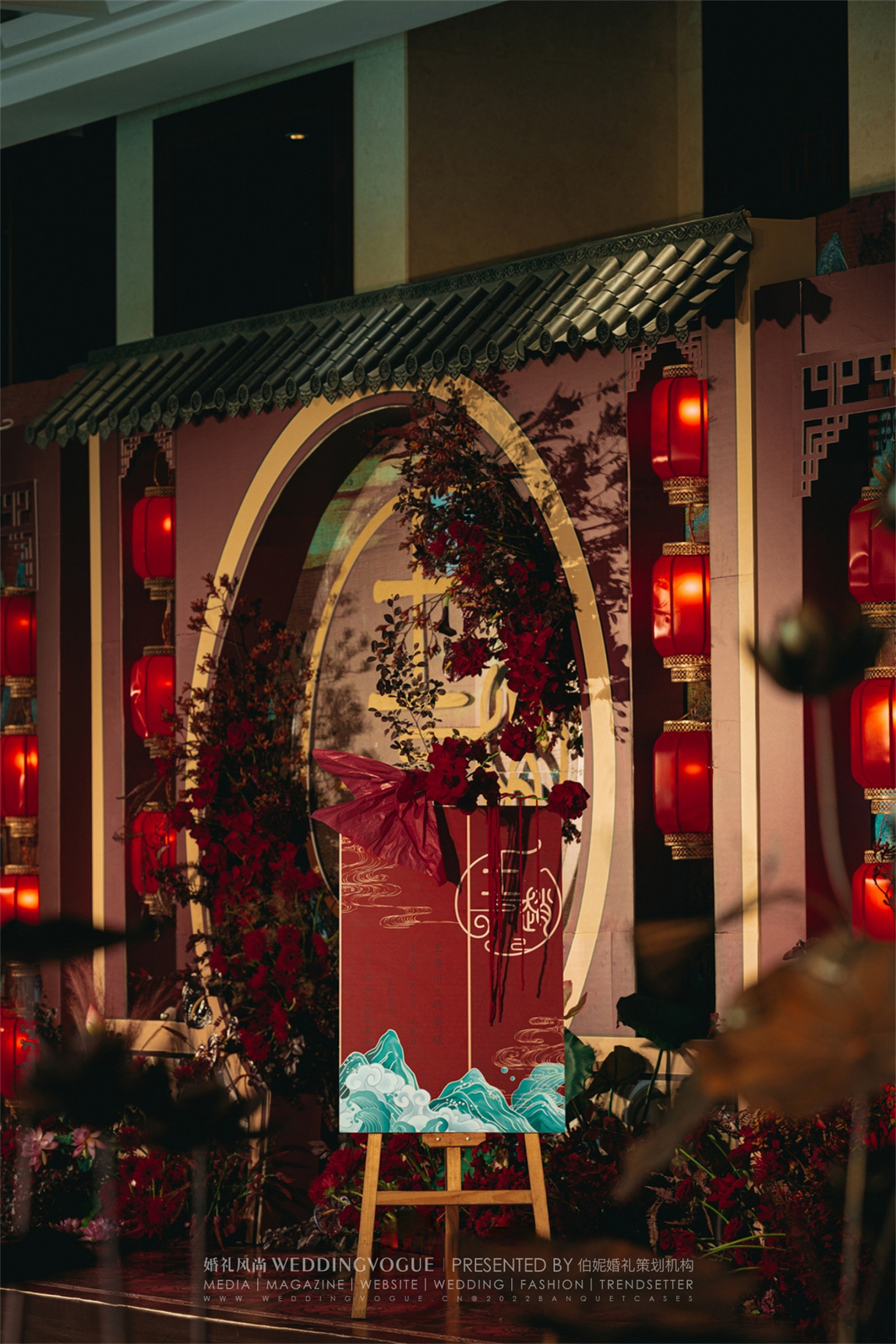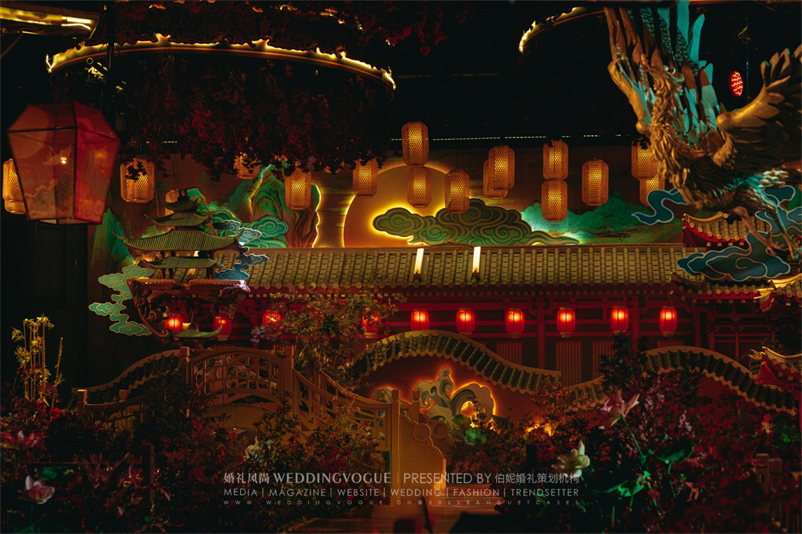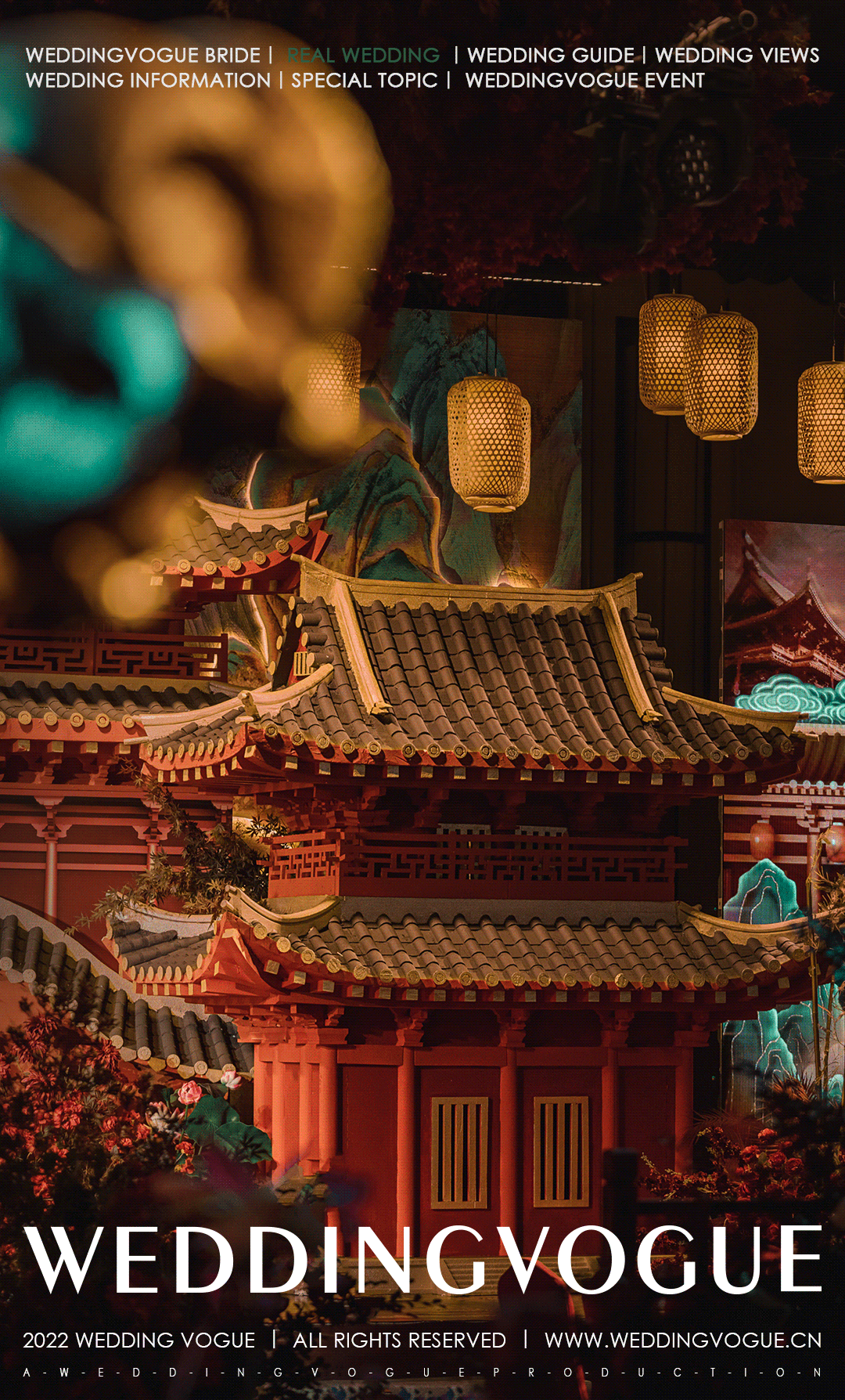 婚礼整体设计以宋式建筑形态为基础,辅以中国古典园林造景手法,缥缈清逸如画作,十二琼楼从画中延伸而出。