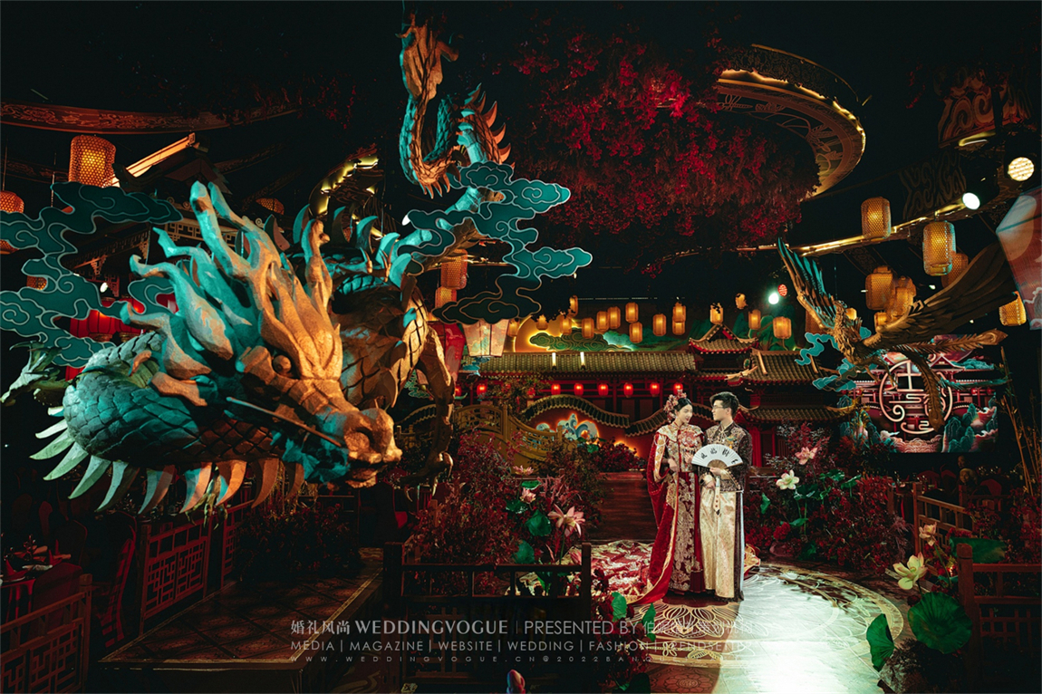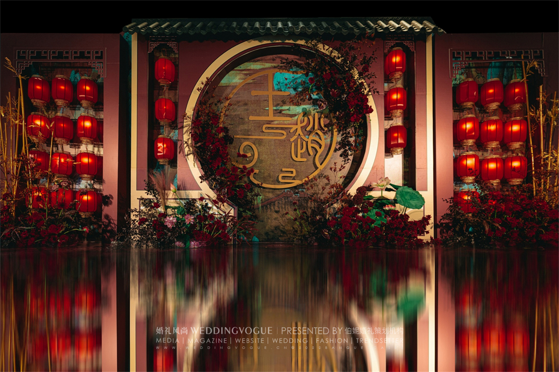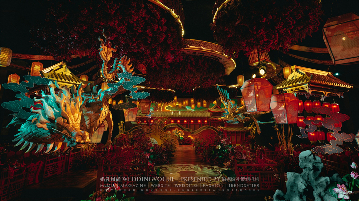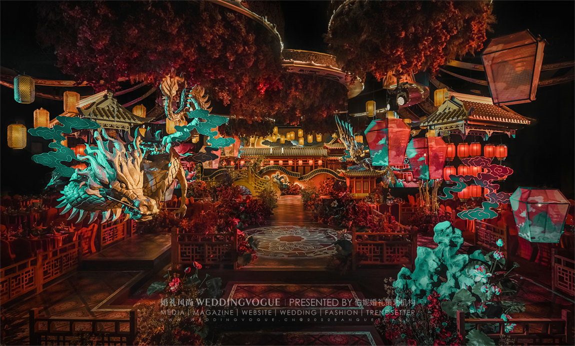 婚礼整体设计以宋式建筑形态为基础,辅以中国古典园林造景手法,缥缈清逸如画作,十二琼楼从画中延伸而出。