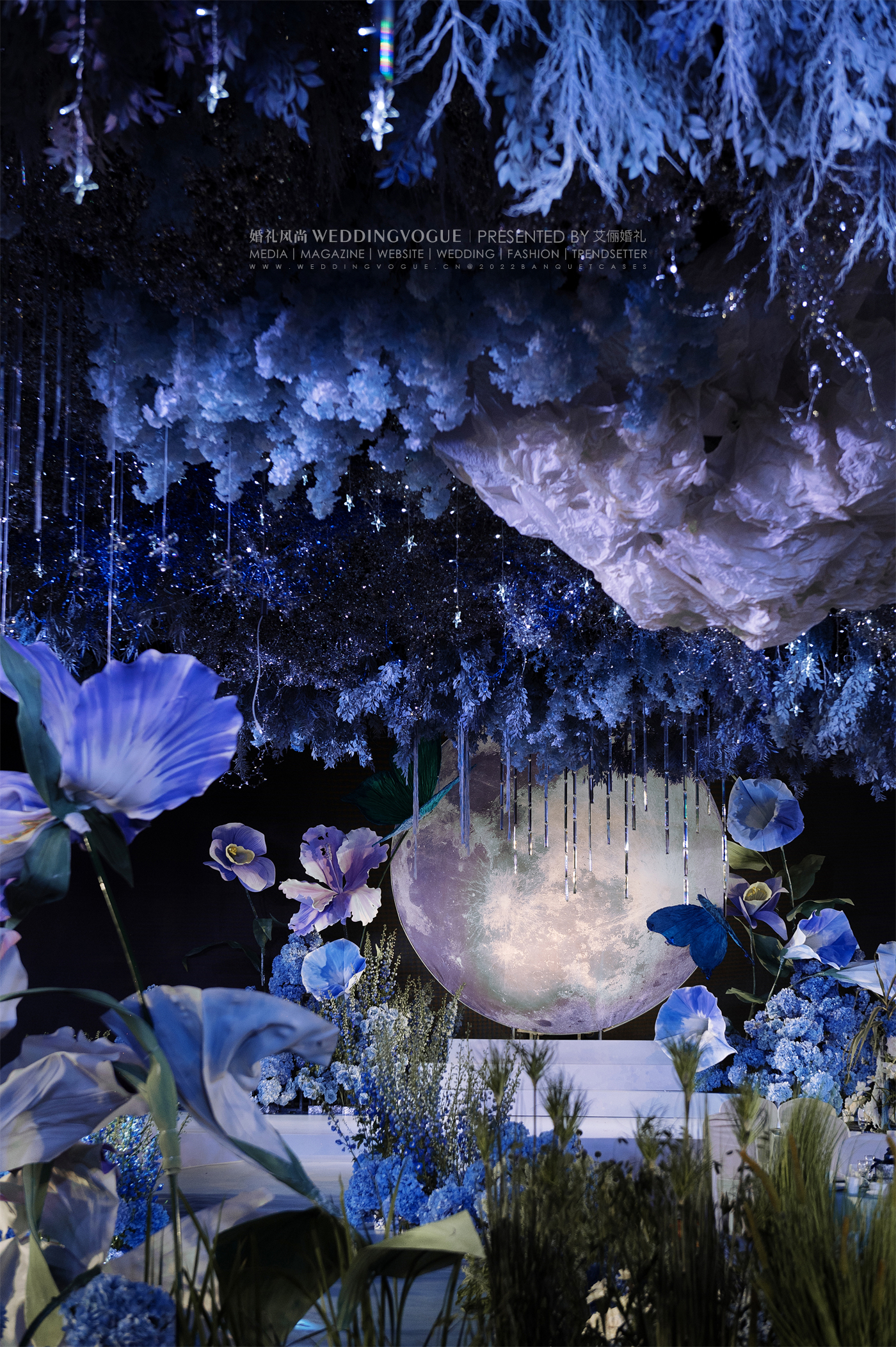 蓝色的花艺和紫色的纸艺倒悬于空中,团团簇簇组合成了浪漫唯美的蓝色星空和紫色云翳,巨大的月亮在繁花的衬托下立在高台上,新人携手登上台阶,在月亮的见证下完成爱的仪式,爱才刚刚开始。