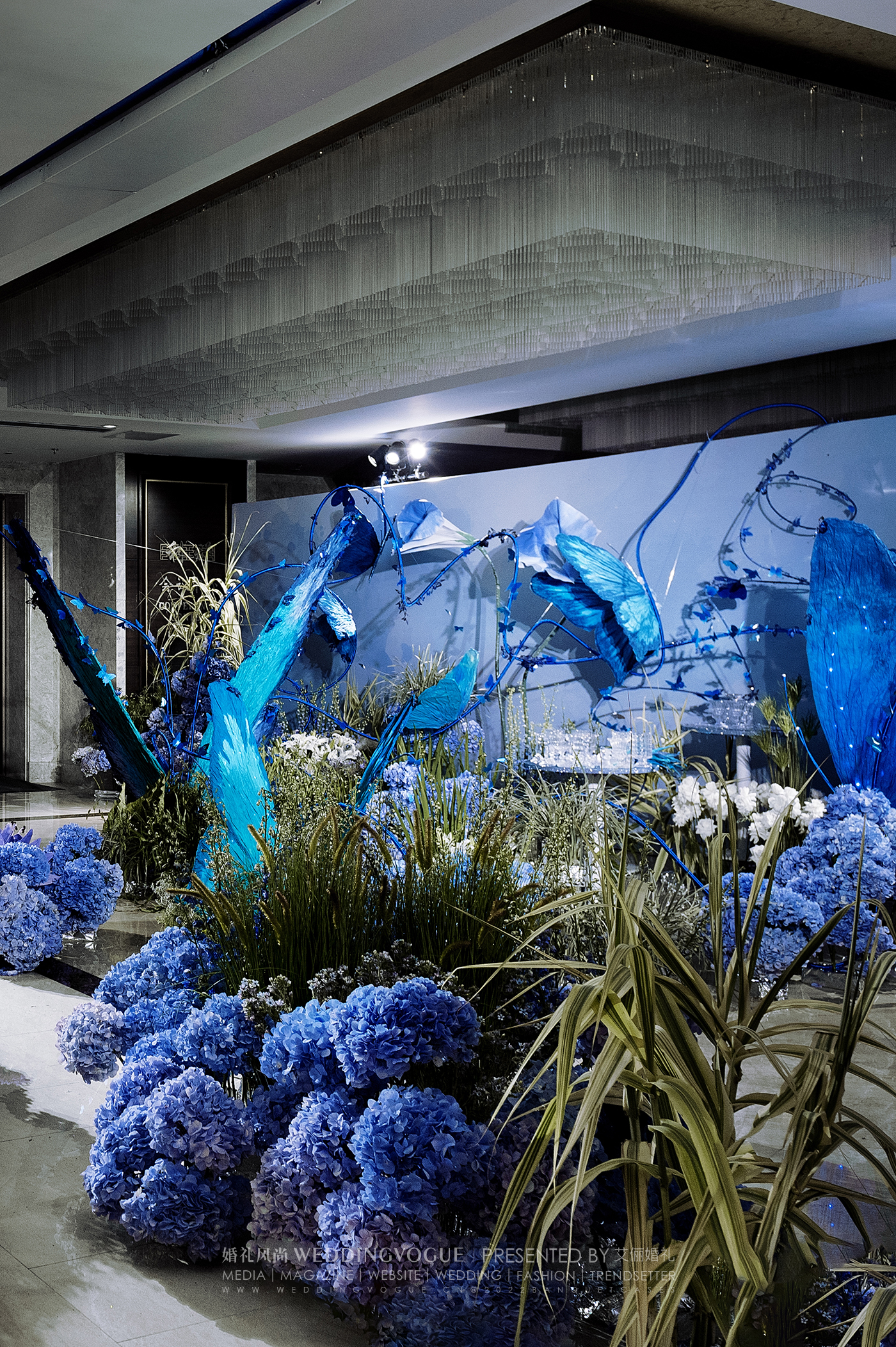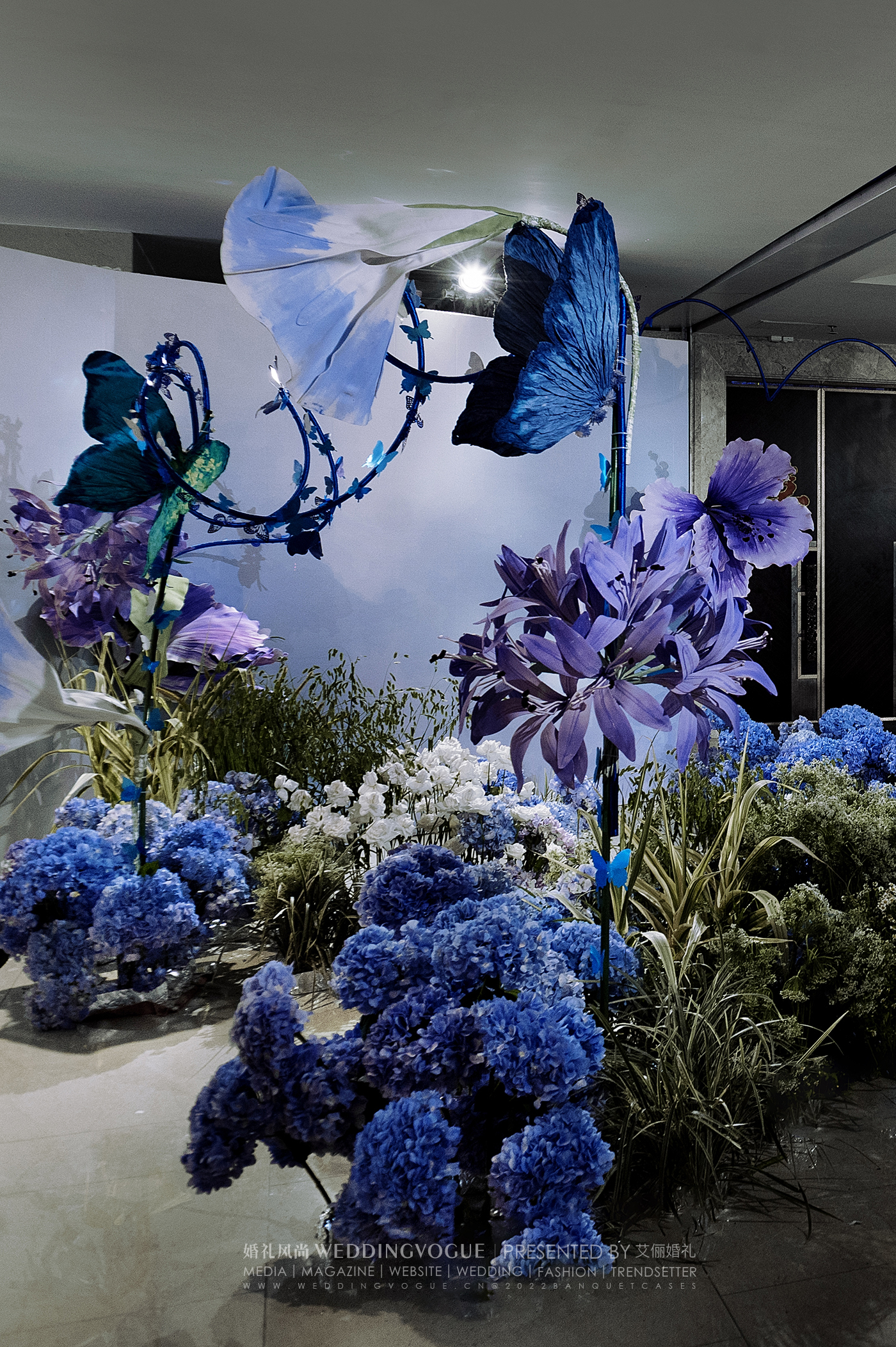 宴会厅外,蓝紫色的奇花幻境阵势已经摆开:白绿吊兰花、蓝色绣球花、紫色蝴蝶花......形状各异的花艺以凛冽观感的不同色调组合在一起,却也赏心悦目。
